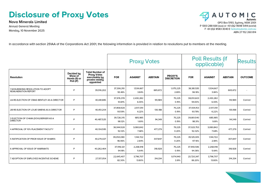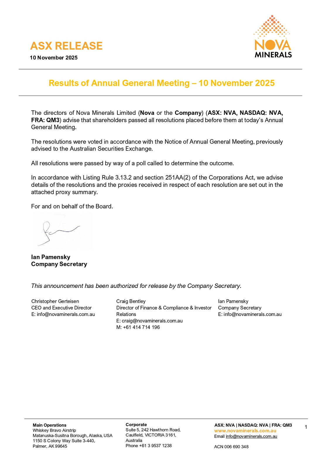 On November 10, 2025, Nova Minerals Ltd. (the “Company”), held its Annual General Meeting of Shareholders (the “Meeting”). At the Meeting, the Company’s shareholders voted on all resolutions described in the proxy materials including the notice for the Meeting included as an exhibit to the Company’s report on Form 6-K furnished by the Company with the Securities and Exchange Commission on September 19, 2025. The resolutions brought before the shareholders at the Meeting were approved by the shareholders of the Company with the requisite majority required for each resolution. On November 10, 2025, the Company filed its report entitled “Results of Annual General Meeting – 10 November 2025” with the Australian Securities Exchange (“ASX”) which report is attached to this report on Form 6-K as Exhibit 99.1 and was posted to the Company’s corporate website on such date.