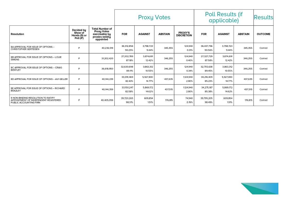 | ● | Subject to satisfaction of any applicable vesting condition, the Options can be exercised by completing an option exercise form and delivering it together with the payment for the number of Shares in respect of which the options are exercised to the Company’s share registry. |