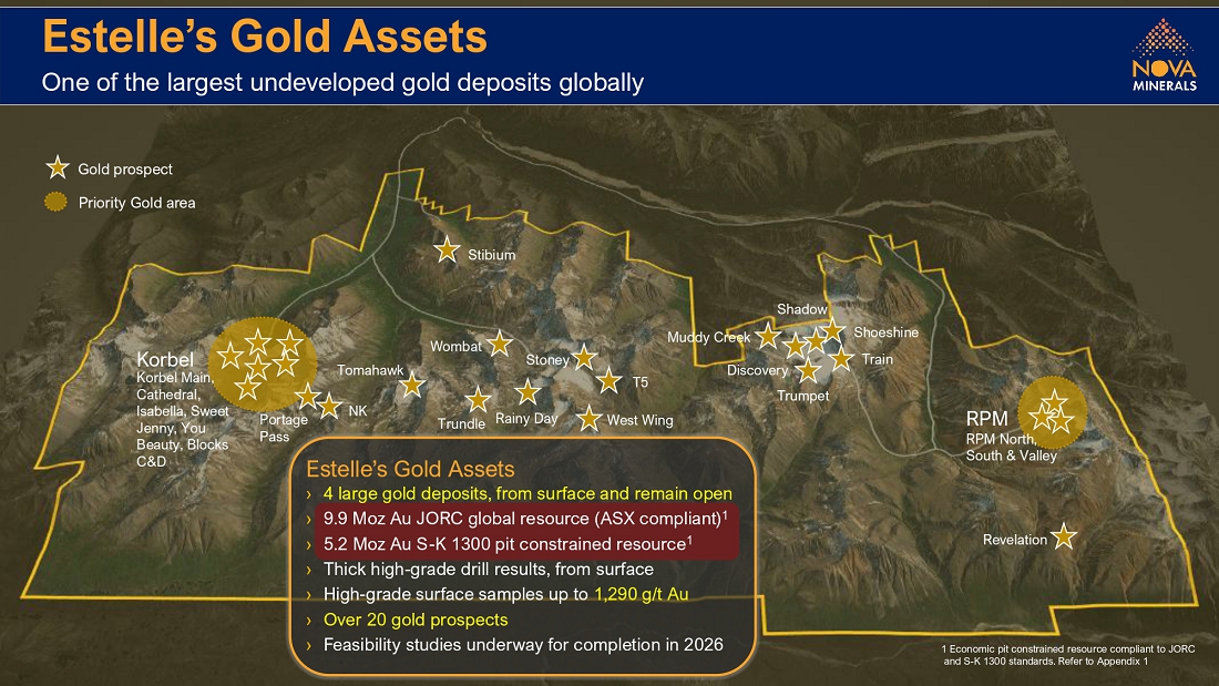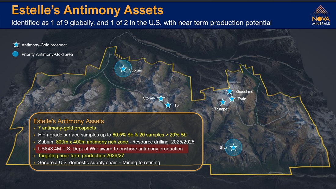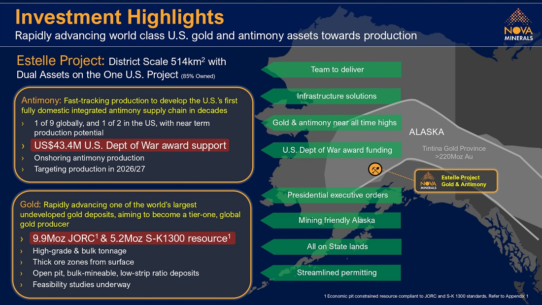 Nova Minerals Limited is a Gold, Antimony and Critical Minerals exploration and development company focused on advancing the Estelle Project, comprised of 514 km2 of State of Alaska mining claims, which contains multiple mining complexes across a 35 km long mineralized corridor of over 20 advanced Gold and Antimony prospects, including two already defined multi-million ounce resources, and several drill ready Antimony prospects with massive outcropping stibnite vein systems observed at surface. The 85% owned project is located 150 km northwest of Anchorage, Alaska, USA, in the prolific Tintina Gold Belt, a province which hosts a >220 million ounce (Moz) documented gold endowment and some of the world’s largest gold mines and discoveries including, Nova Gold and Paulson Advisors Donlin Creek Gold Project and Kinross Gold Corporation’s Fort Knox Gold Mine. The belt also hosts significant Antimony deposits and was a historical North American Antimony producer.