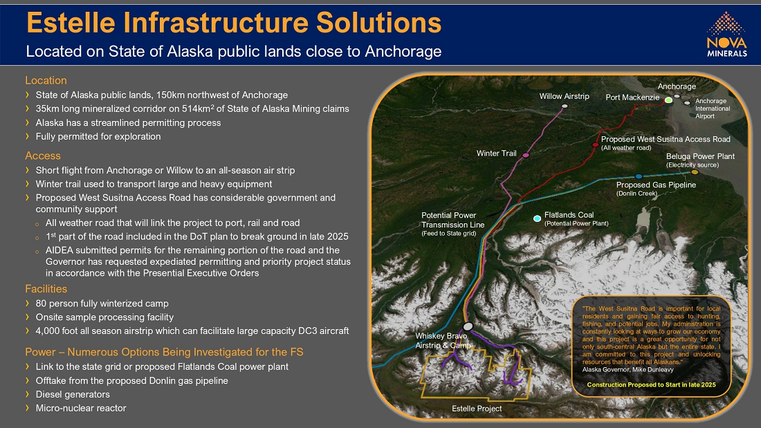 The Nova Minerals team continues to be strongly dedicated to stakeholder engagement and in particular working with the Alaskan Government on our shared commitments to building the foundational infrastructure needed to realise the Estelle projects’ full potential. These key enablers include the West Susitna Access Road development, Port Mackenzie upgrade and Alaska LNG which will support year-round access, global logistics and clean energy. These projects are not only important to Nova but will provide huge economic benefit to the state of Alaska.