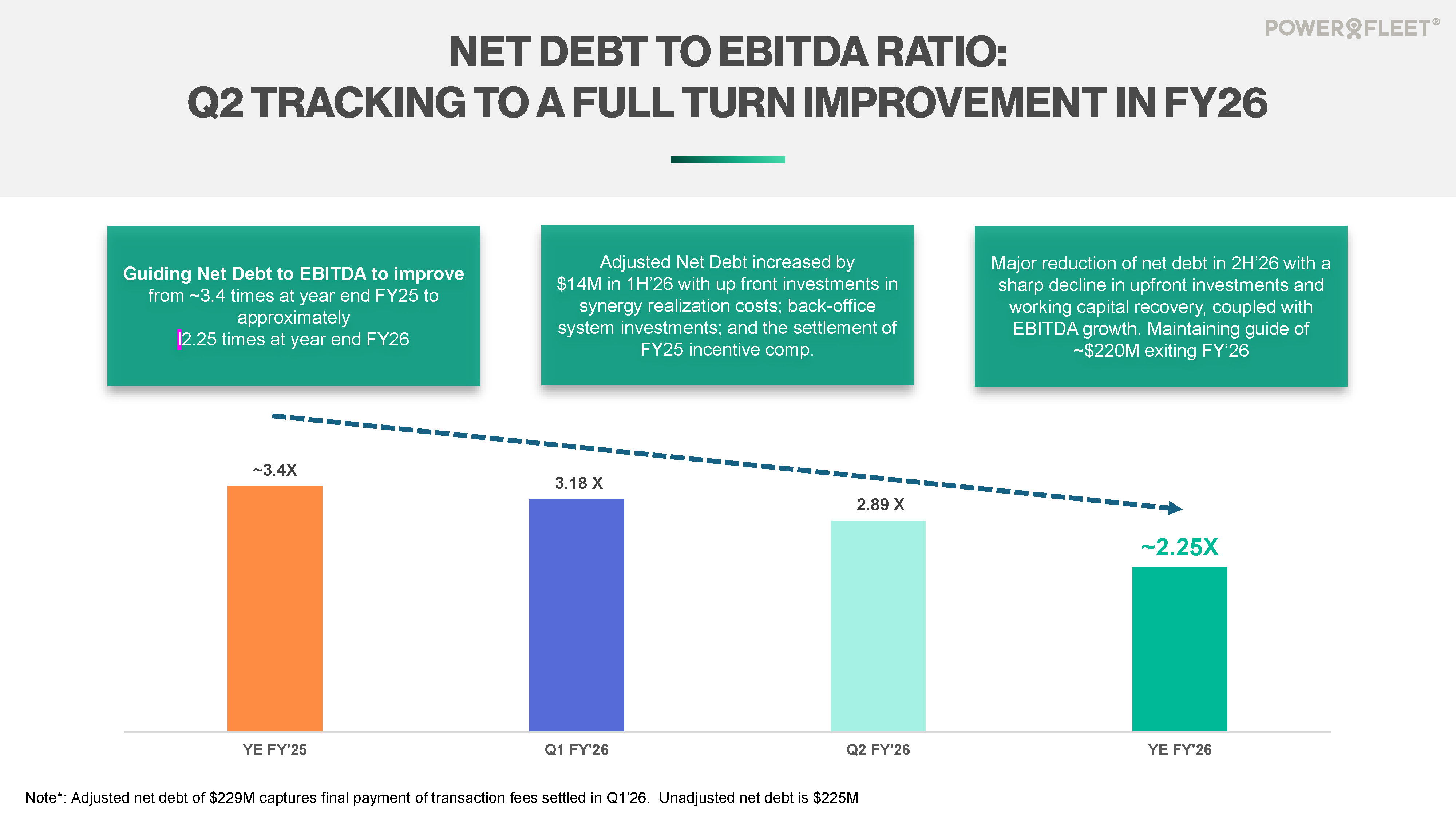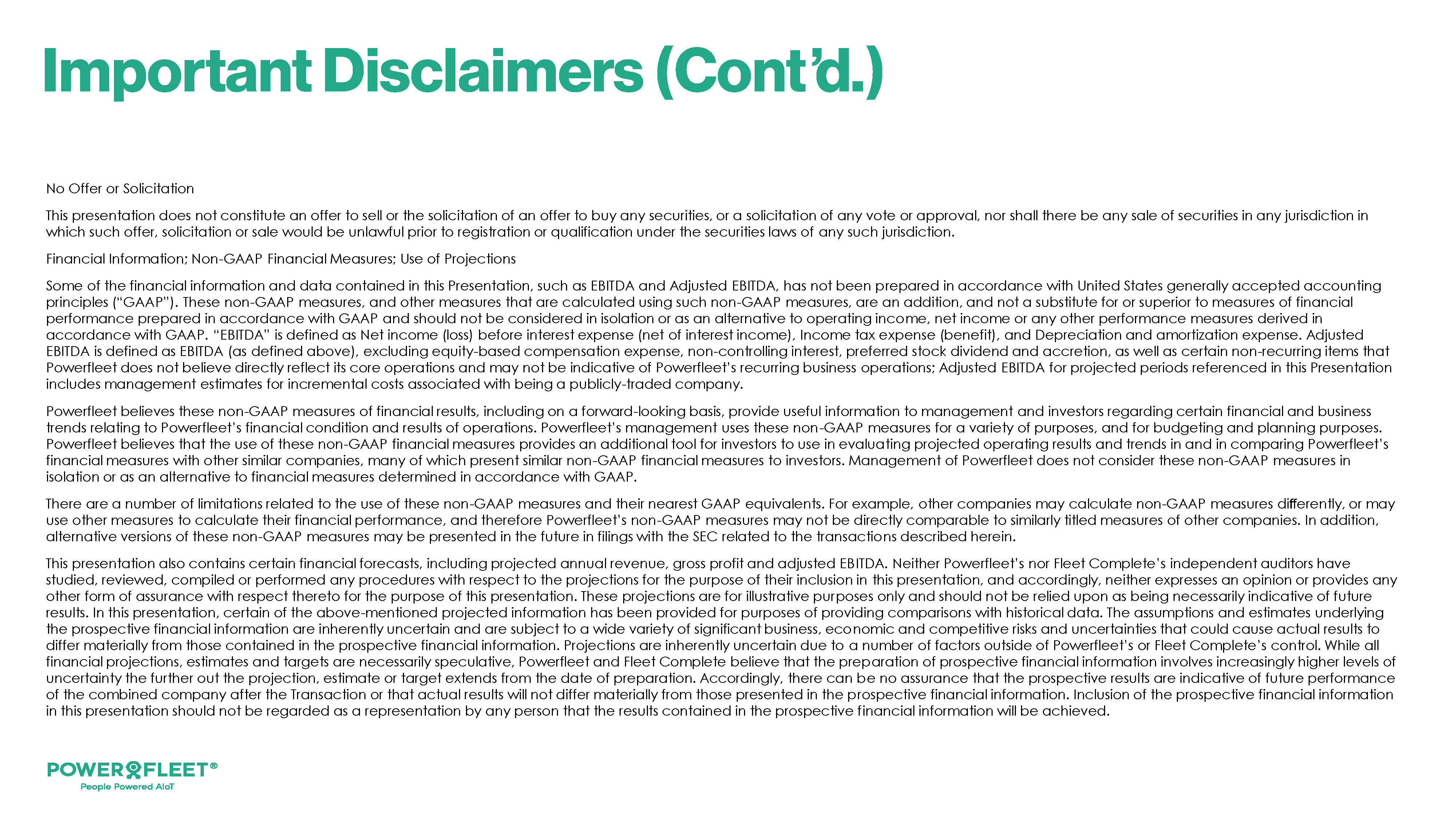 パワーフリートは、非GAAP財務指標である調整後EBITDAおよび調整後純負債/調整後EBITDAレバレッジ・レシオのガイダンスを提供しています。これは、該当するGAAP財務指標には含まれるが、調整後EBITDAおよび/または調整後純負債/調整後EBITDAレバレッジ・レシオからは除外される特定の項目の時期または金額を、不合理な努力なしに予測することができないためです。これらの項目には、株式報酬、買収関連費用、公正価値調整、リストラクチャリング費用、その他の非経常項目などが含まれる可能性があります。これらの項目の変動は、パワーフリートの将来のGAAPベースの財務結果に大きな影響を与える可能性があるため、パワーフリートは現時点では調整項目を提供することができません。