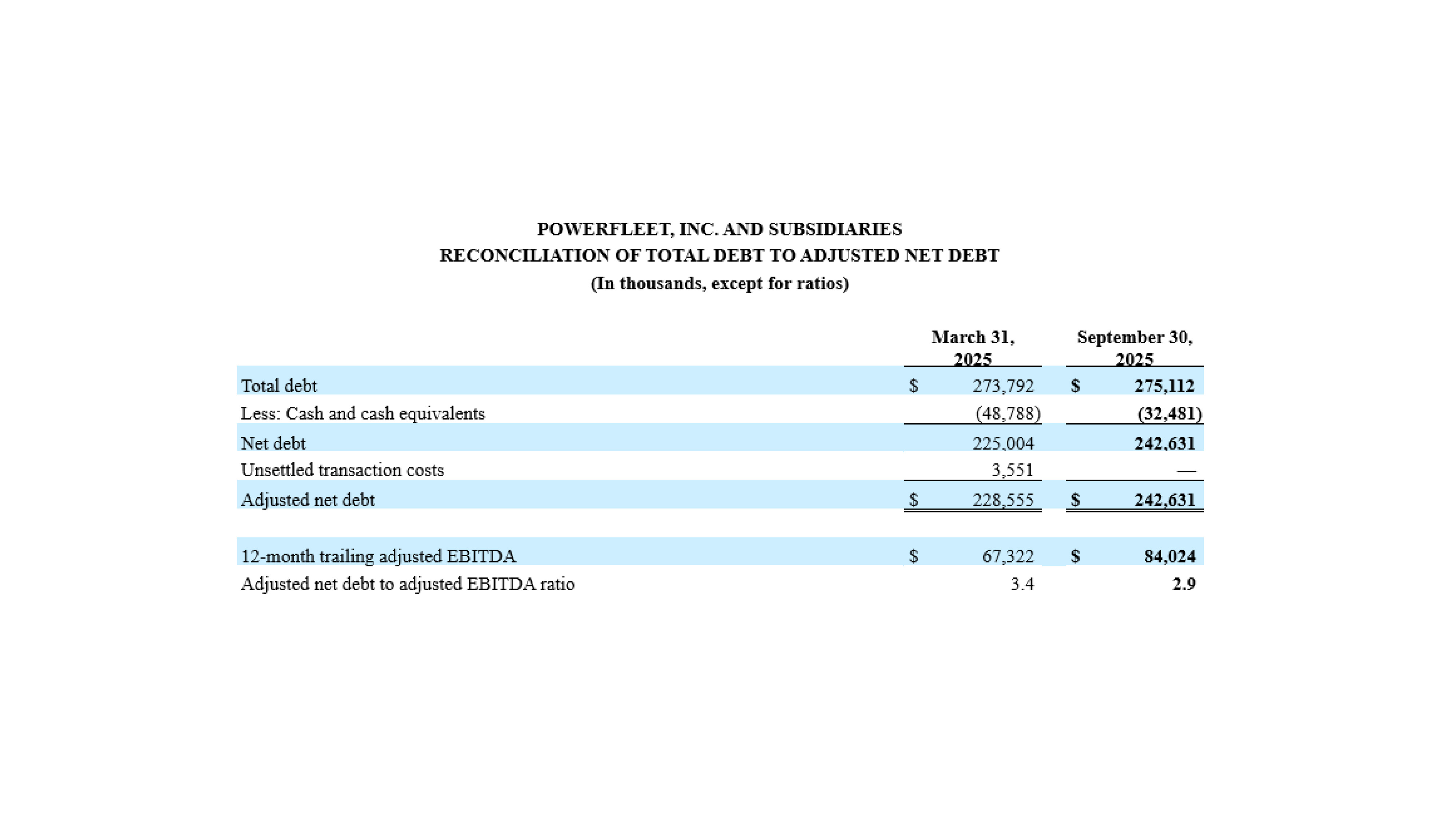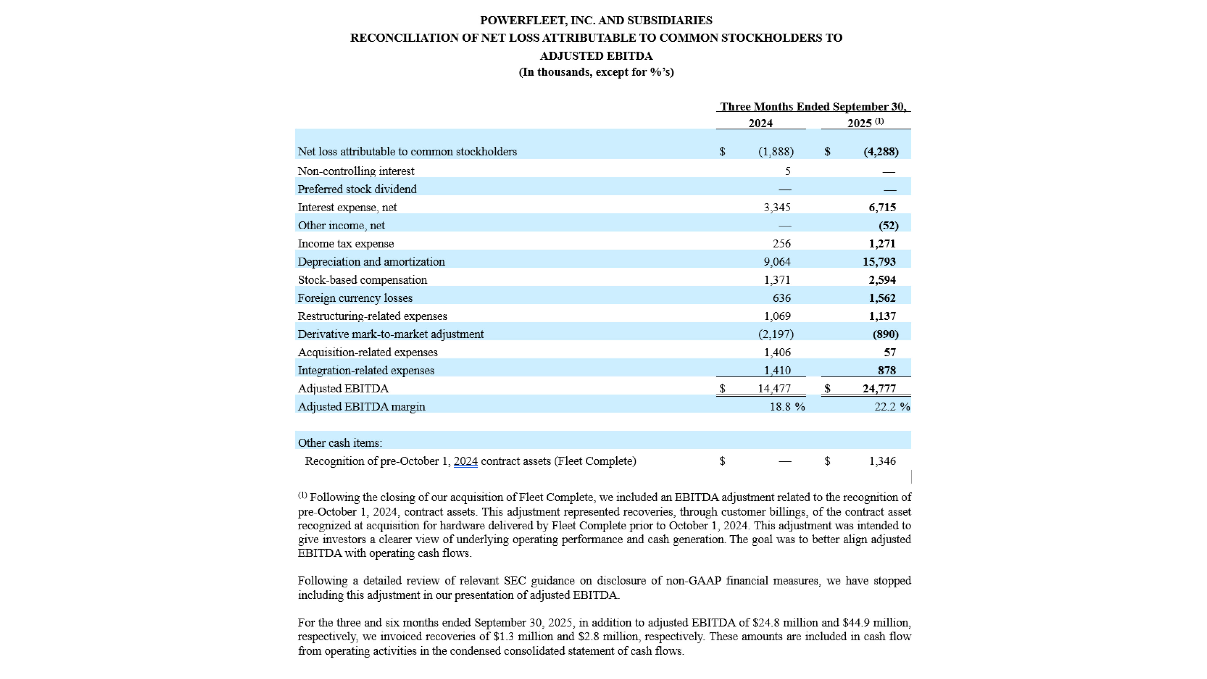 非 GAAP 財務指標の開示に関する SEC の関連ガイダンスを詳細に検討した結果、当社は調整後 EBITDA の表示に「2024 年 10 月 1 日以前の契約資産の認識(フリート・コンプリート社)」の EBITDA 調整を含めないことに結論づけました。これらの金額は、フリート・コンプリート社が買収前に納入した限定的なハードウェアに関するものであるが、その後請求・回収されたもののみである。EBITDA調整は有限の会計移行期間中に適用され、報告された業績をより営業キャッシュフローに近づけることを目的としていた。