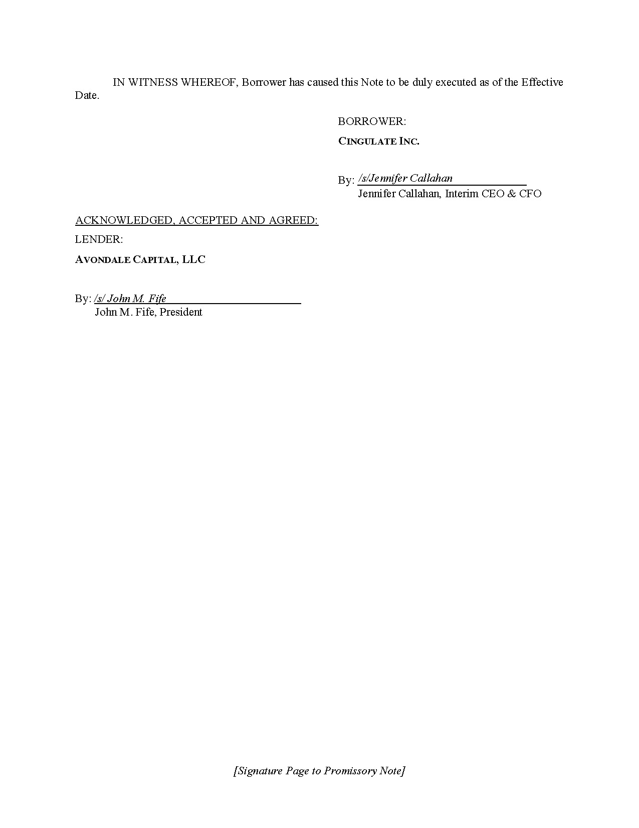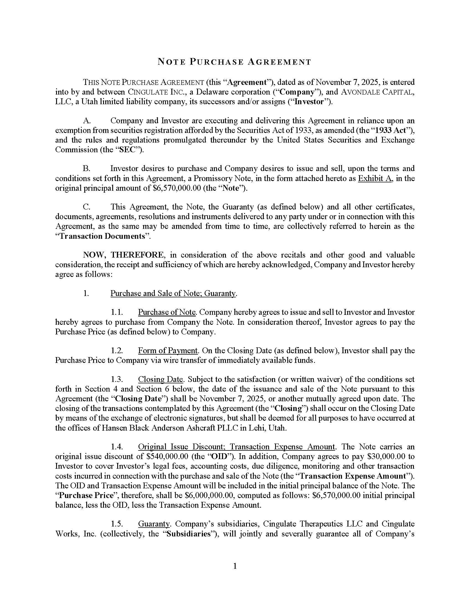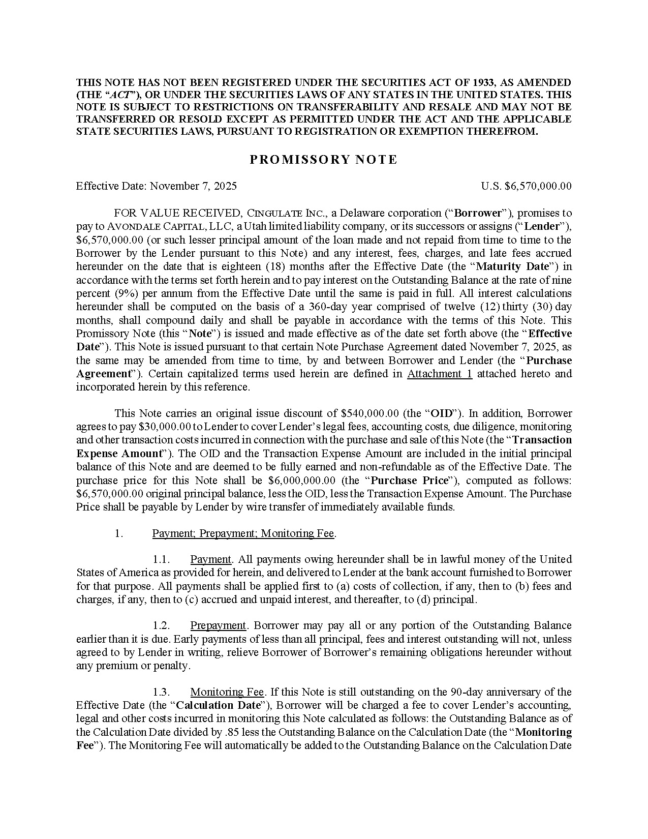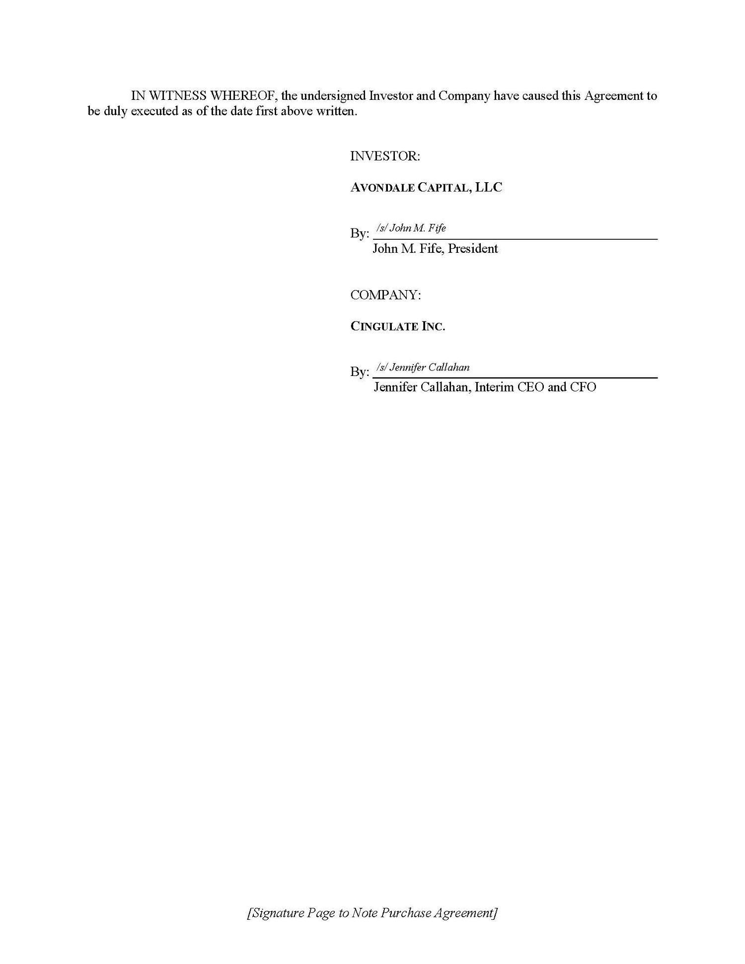 | 10.1 | Note Purchase Agreement between Cingulate Inc. and Avondale Capital, LLC, dated November 7, 2025 | |