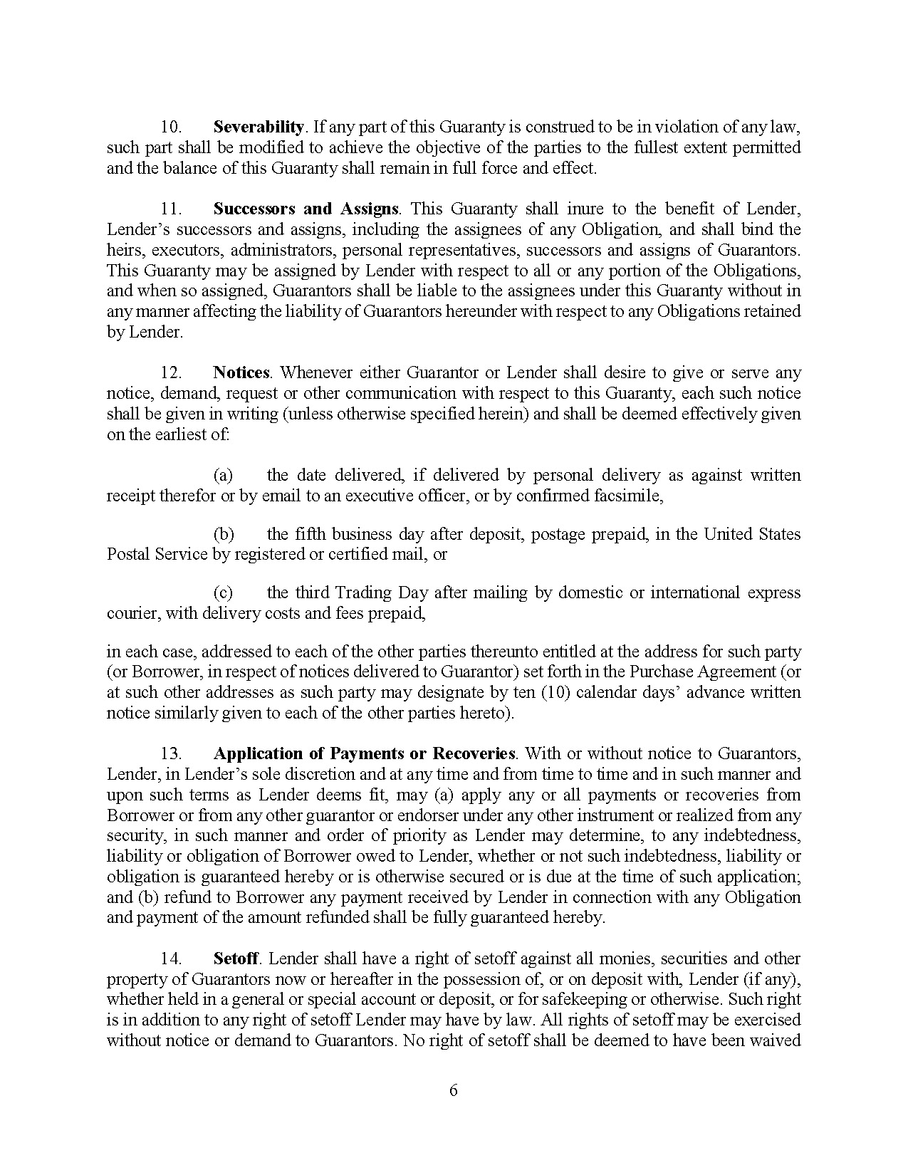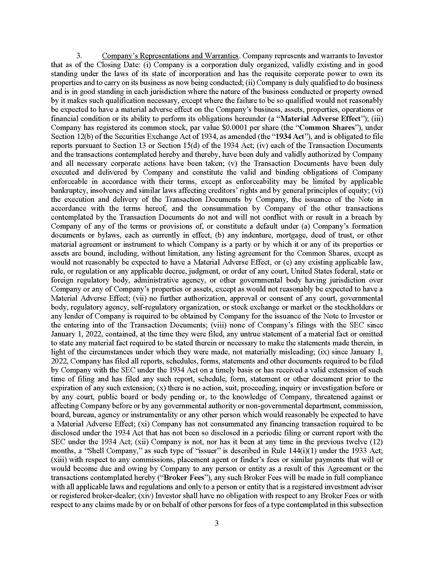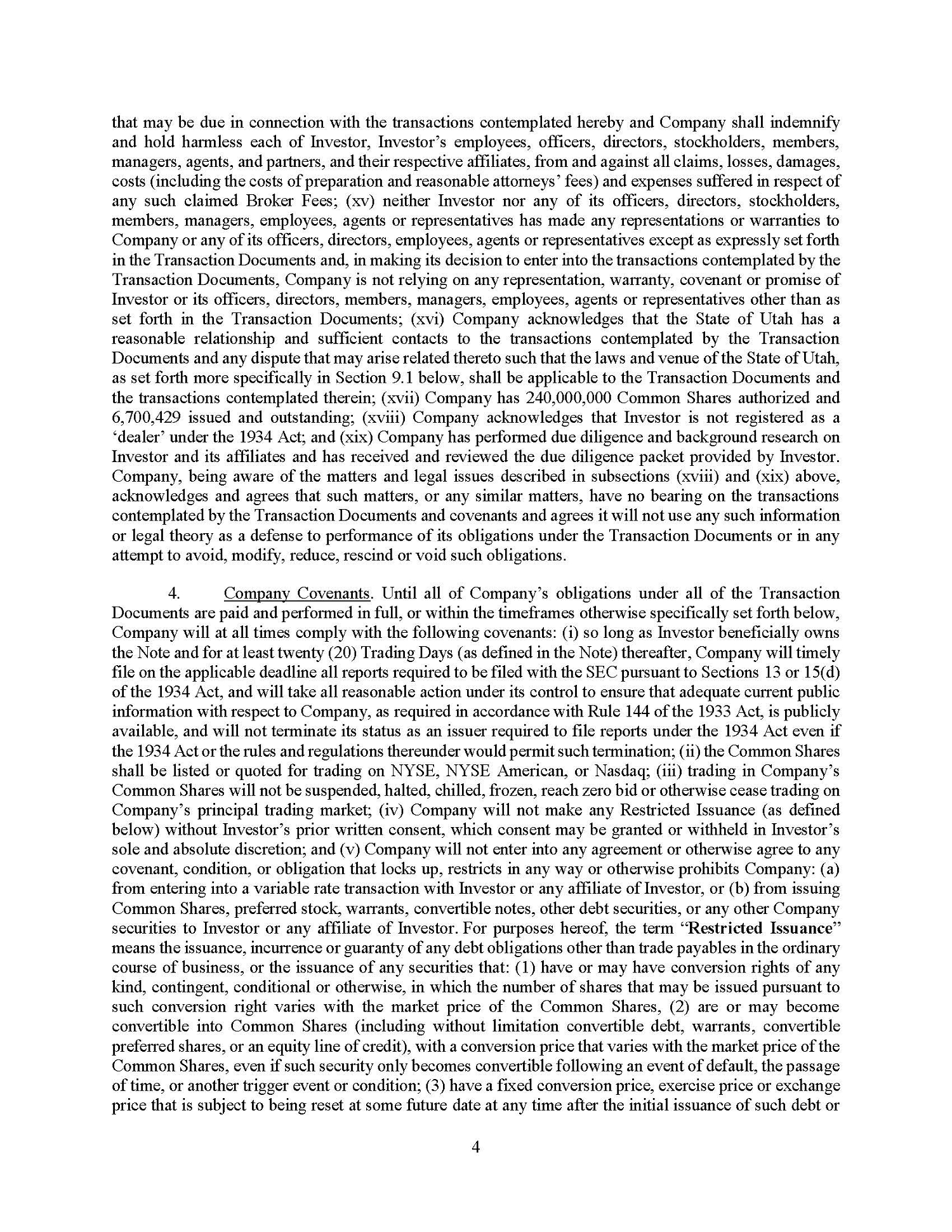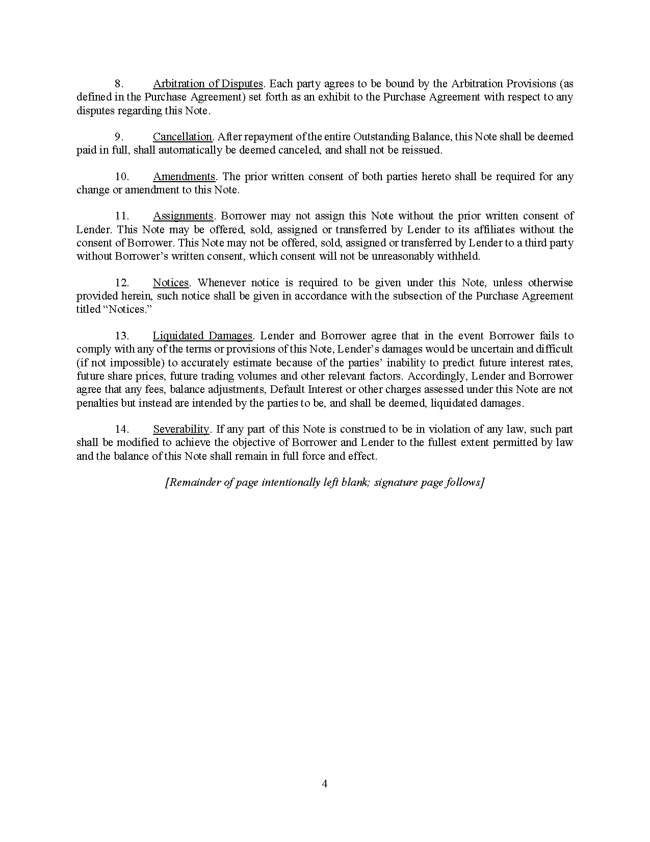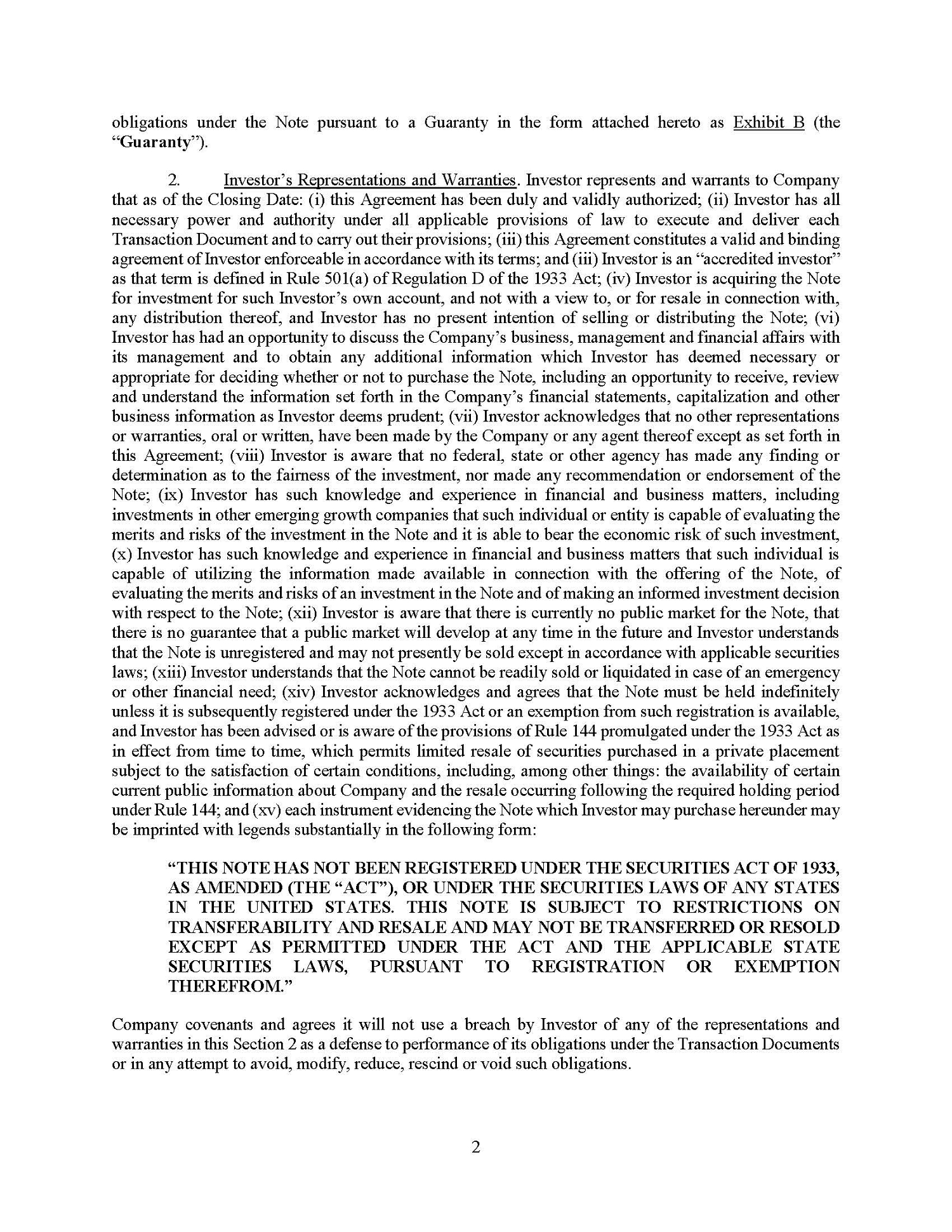 The Note Purchase Agreement also provides for indemnification of Lender and its affiliates in the event that they incur loss or damage related to, among other things, a breach by the Company of any of its representations, warranties or covenants under the Note Purchase Agreement.