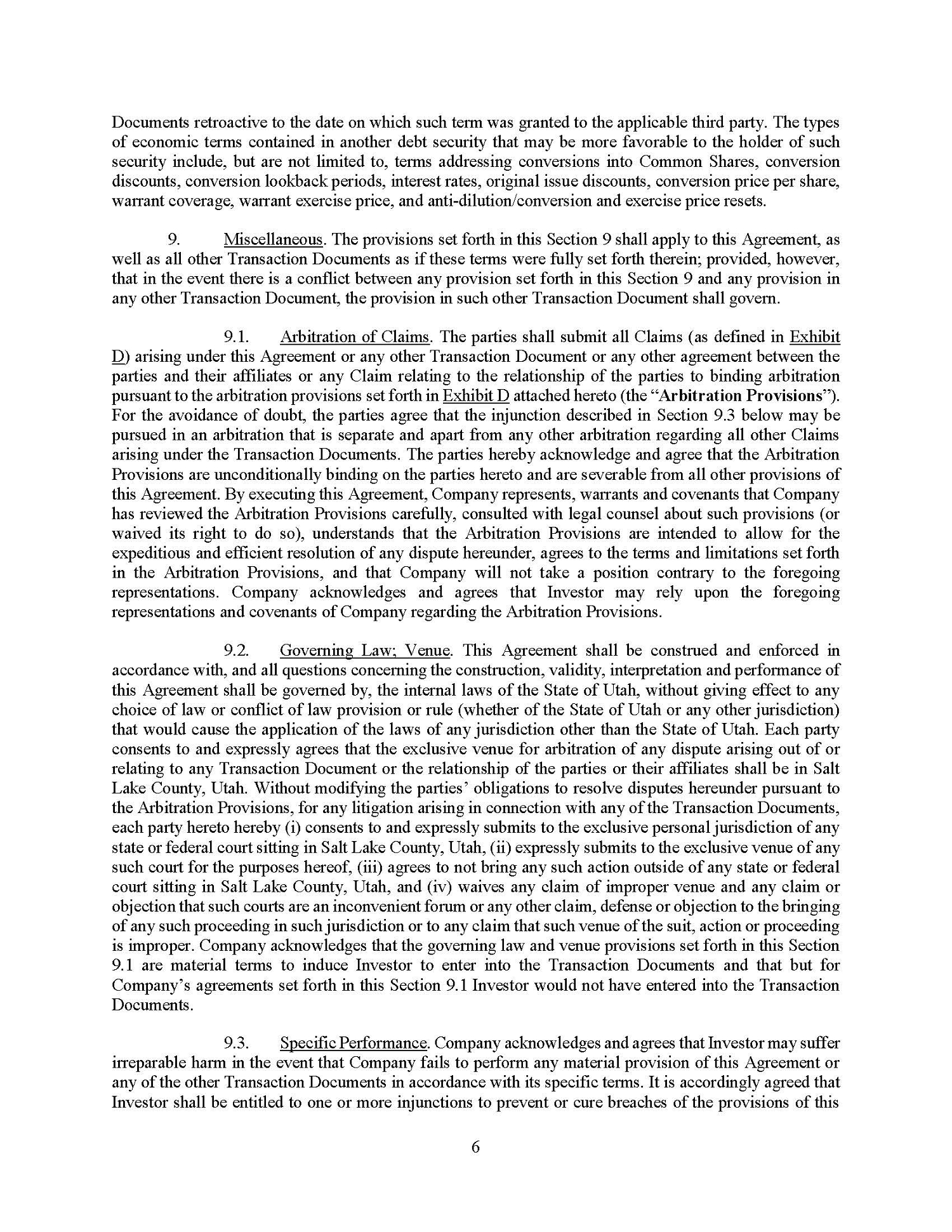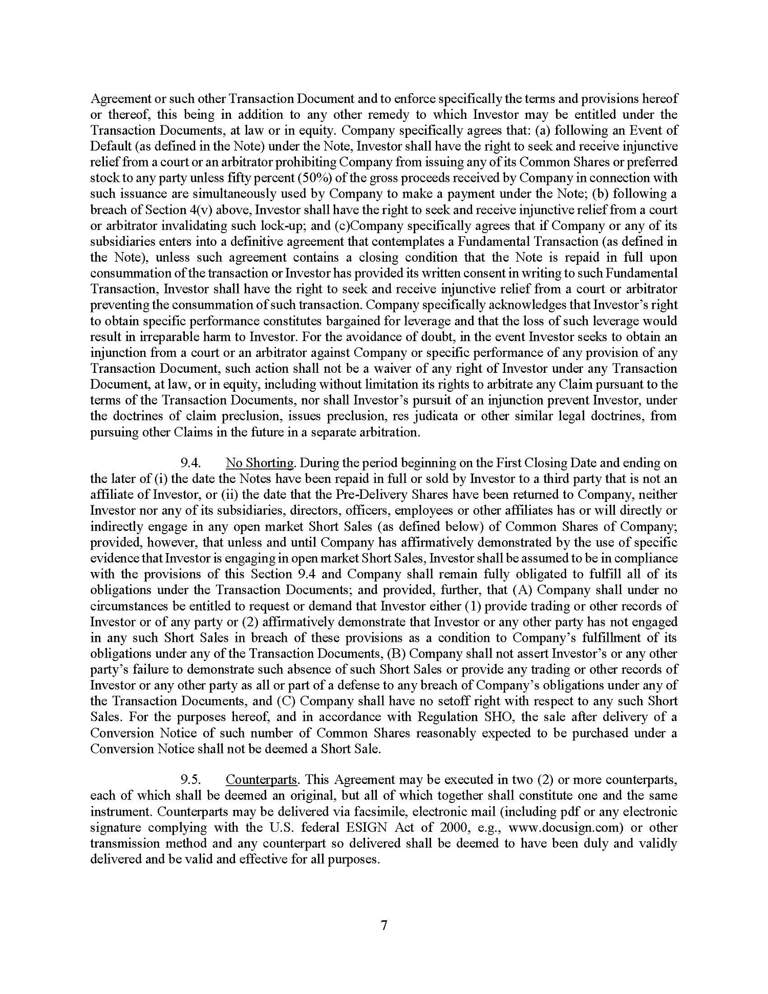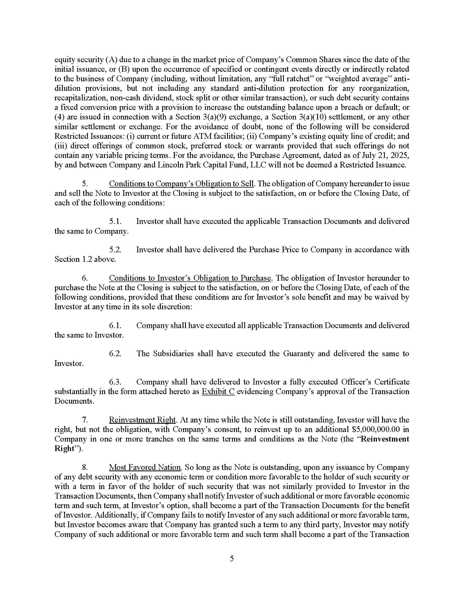 Pursuant to the Note Purchase Agreement, while the Note is still outstanding, the Company will not enter into any arrangement that prohibits the Company from entering into a variable rate transaction, as defined in the Note Purchase Agreement, with Lender or its affiliates, or from issuing securities of the Company to Lender or its affiliates. The Company is also prohibited from entering into a variable rate transaction while the Note is outstanding, subject to certain exceptions. At any time while the Note is still outstanding, Lender will have the right, but not the obligation, with the Company’s consent, to reinvest up to an additional $5,000,000 in the Company in one or more tranches on the same terms and conditions as the Note. Additionally, so long as the Note is outstanding, upon any issuance by the Company of any debt security with any economic term or condition more favorable to the holder of such security that was not provided to Lender pursuant to the Note, then, at Lender’s option, such additional term shall become part of the Note and related documents for the benefit of Lender.