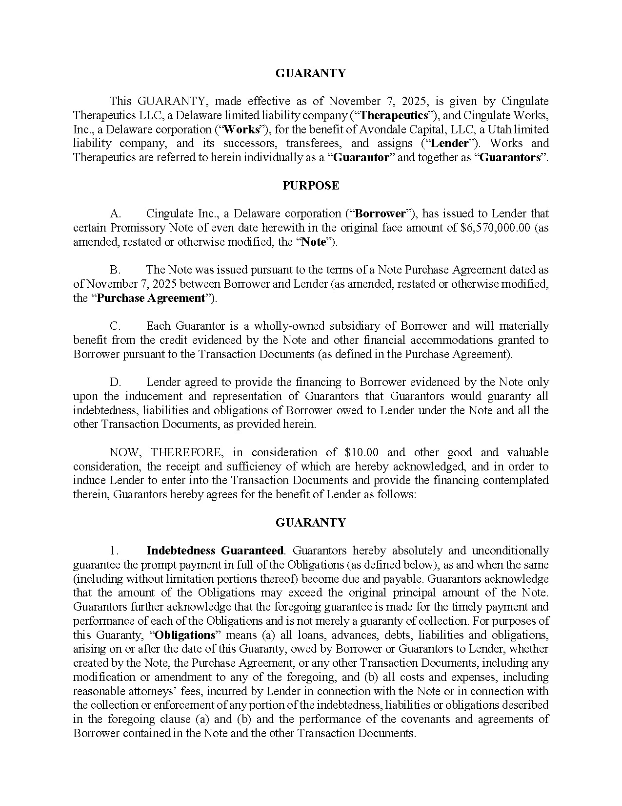 | 10.2 | Guaranty by Cingulate Therapeutics LLC and Cingulate Works, Inc., dated November 7, 2025 | |