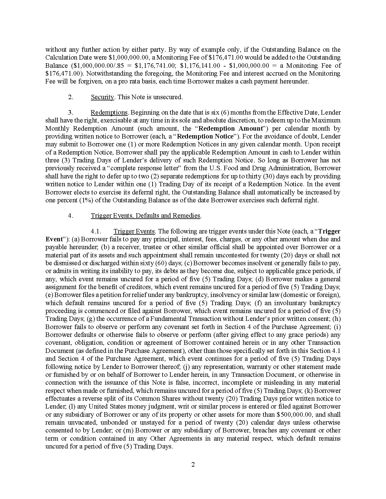 From time to time, beginning on May 7, 2026, Lender may redeem a portion of the Note, not to exceed an amount of $660,000 per month; provided, that, prior to the Company’s receipt of a “complete response letter” from the U.S. Food and Drug Administration, the Company may defer up to two redemptions for up to thirty (30) days each. If the Company exercises its deferral right, the outstanding balance of the Note will be increased by 1% of the outstanding balance on the date of the deferral. In the event the Note is outstanding on the 90-day anniversary of the effective date of the Note, the Company will be charged a monitoring fee equal to the outstanding balance on such date divided by 0.85 less the outstanding balance on such date. Subject to the terms and conditions set forth in the Note, the Company may prepay all or any portion of the outstanding balance of the Note at any time.