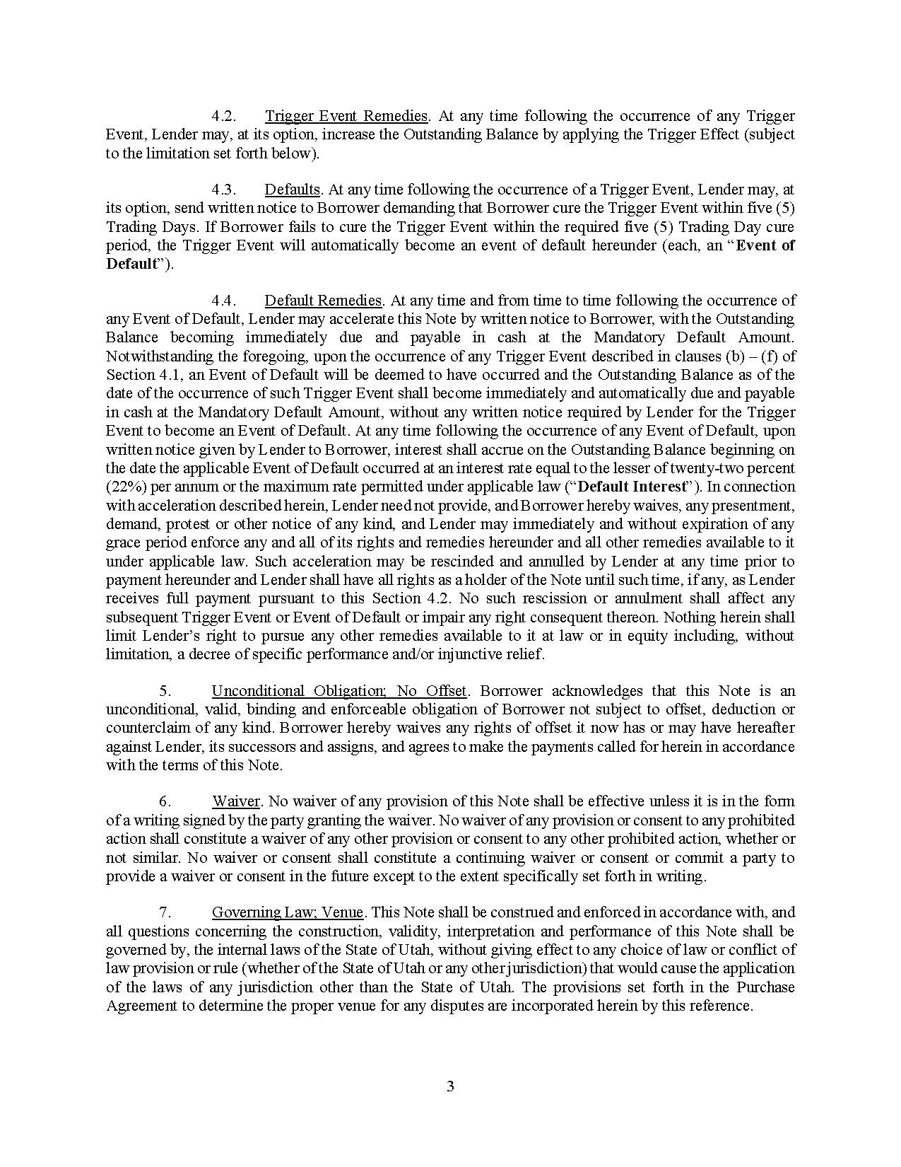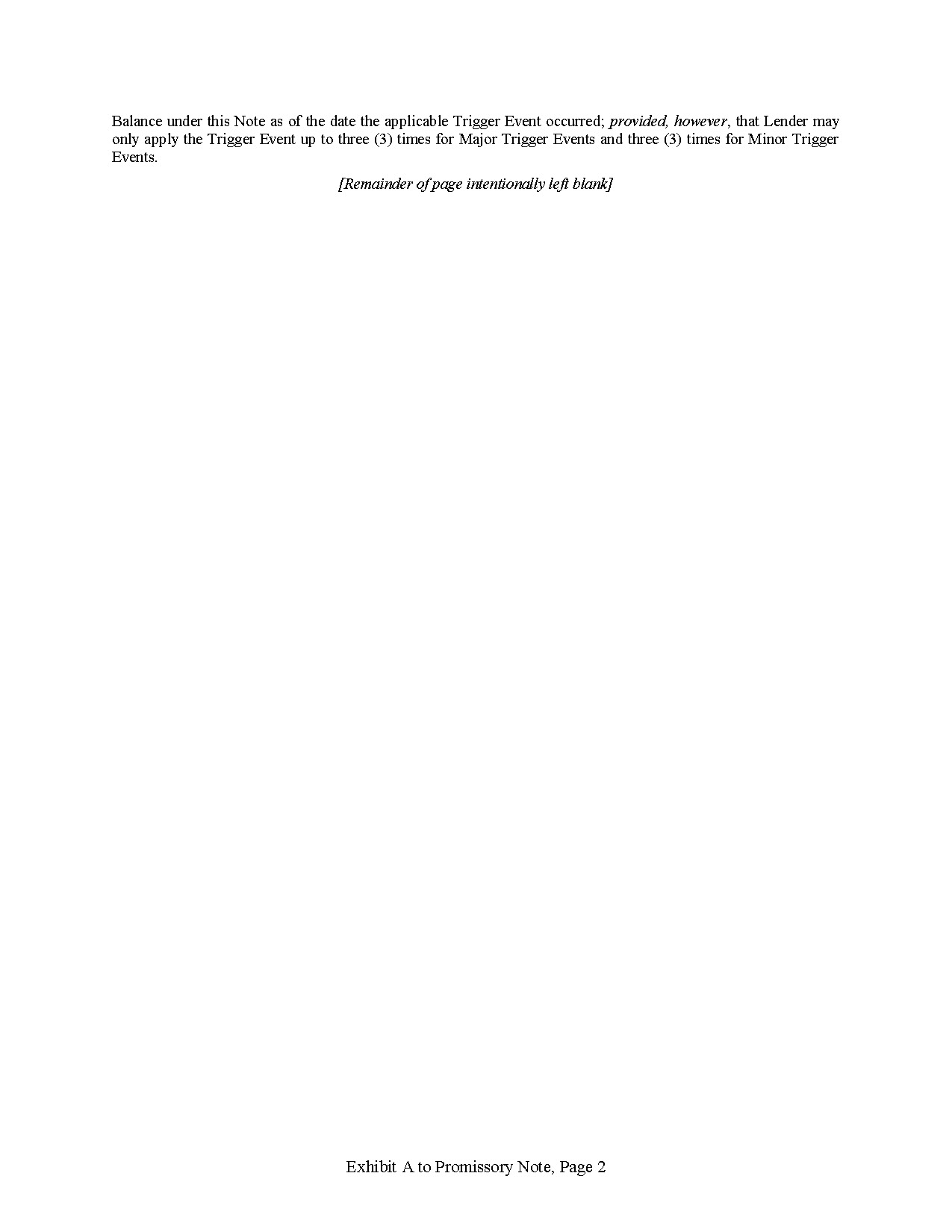 The Note provides for customary events of default (each as defined in the Note, an “Event of Default”), including, among other things, the event of nonpayment of principal, interest, fees or other amounts, a representation or warranty proving to have been incorrect when made, failure to perform or observe covenants within a specified cure period, a cross-default to certain other indebtedness and material agreements of the Company, and the occurrence of a bankruptcy, insolvency or similar event affecting the Company. Upon the occurrence of an Event of Default that is deemed a “Major Trigger Event” as defined in the Note, Lender may increase the outstanding balance of the Note by 15%, and upon the occurrence of an Event of Default that is deemed a “Minor Trigger Event” as defined in the Note, Lender may increase the outstanding balance of the Note by 5%. Lender can exercise its right to increase the outstanding balance upon a Major or Minor Trigger Event three times each. Upon the occurrence of an Event of Default, Lender may declare all amounts owed under the Note immediately due and payable. In addition, upon the occurrence of an Event of Default, upon the election of Lender, interest shall begin accruing on the outstanding balance of the Note from the date of the Event of Default equal to the lesser of 22% per annum and the maximum rate allowable under law.