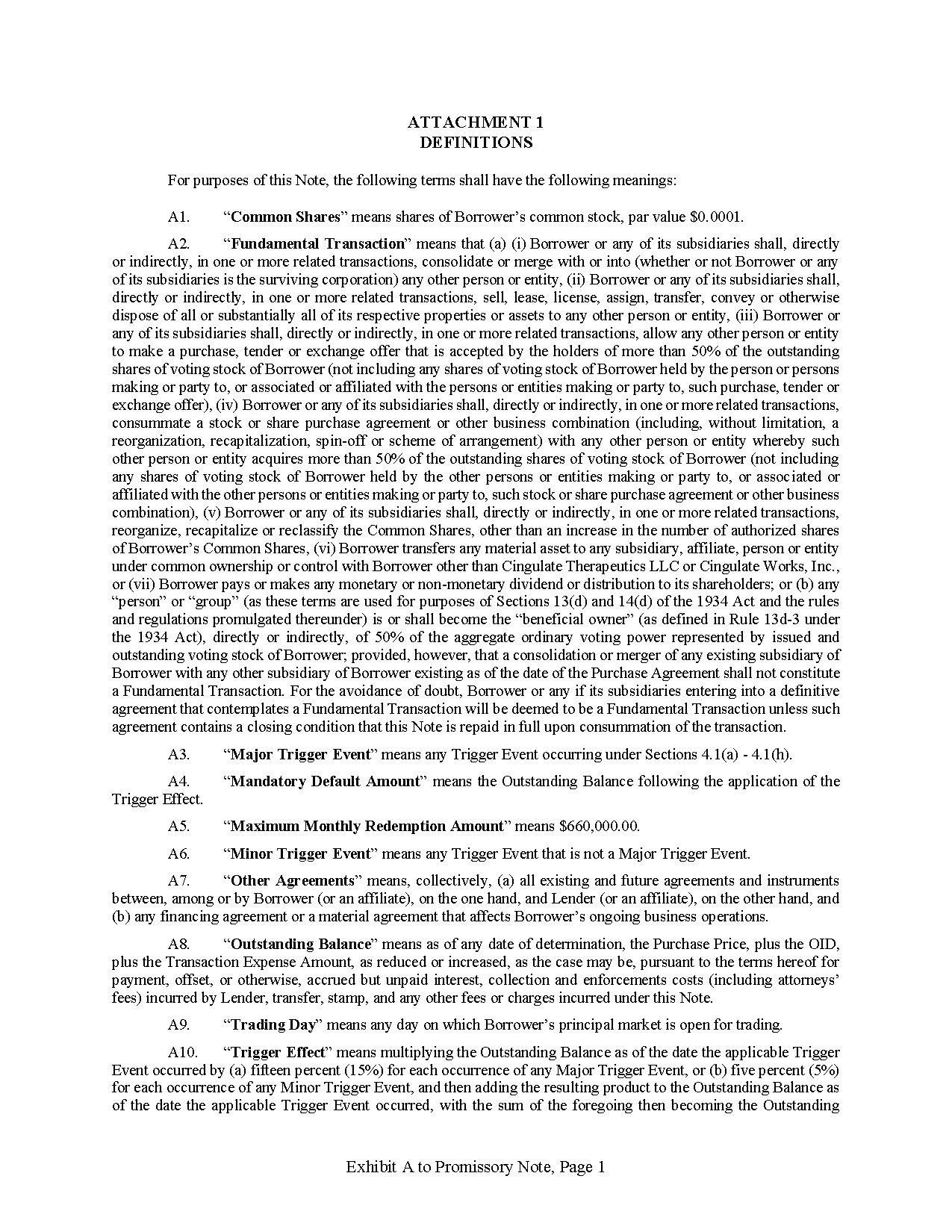 In conjunction with the leadership appointment, Cingulate completed a financing transaction with an accredited investor, providing net proceeds of $6 million. The transaction was structured as a $6,570,000 non-convertible, unsecured promissory note accruing interest at 9% per annum and maturing 18 months from issuance. The note provides the flexibility for Cingulate to begin monthly redemptions on the note subsequent to the CTx-1301 PDUFA date of May 31, 2026. Cingulate intends to use the proceeds for working capital and other general corporate purposes.