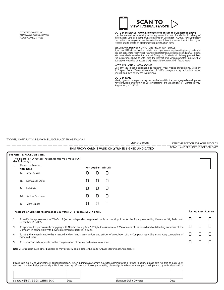 You are cordially invited to attend our 2025 Annual Meeting of Shareholders of Freight Technologies, Inc. (“Freight Technologies”, the “Company”, “we”, “us”, or “our”), which will be held on December 18, 2025, at 1:00 p.m. Monterrey, Mexico time at our office at Emilio Zola Num. 743 Piso 4, Int. 1, Col. Obispado, Monterrey Nuevo Leon, Mexico CP 64060 (the “2025 Annual Meeting”).