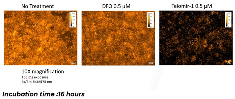The evaluation utilized FerroOrange, a fluorescent probe that selectively detects ferrous iron (Fe²⁺) in living cells. HaCaT cells were incubated with Telomir-1 or DFO at several time points. After three, six and sixteen hours, fluorescence microscopy showed substantially lower intracellular iron signal intensity in Telomir-1–treated cells at various concentrations, indicating greater cellular penetration and iron-modulating activity relative to DFO at the same concentrations.