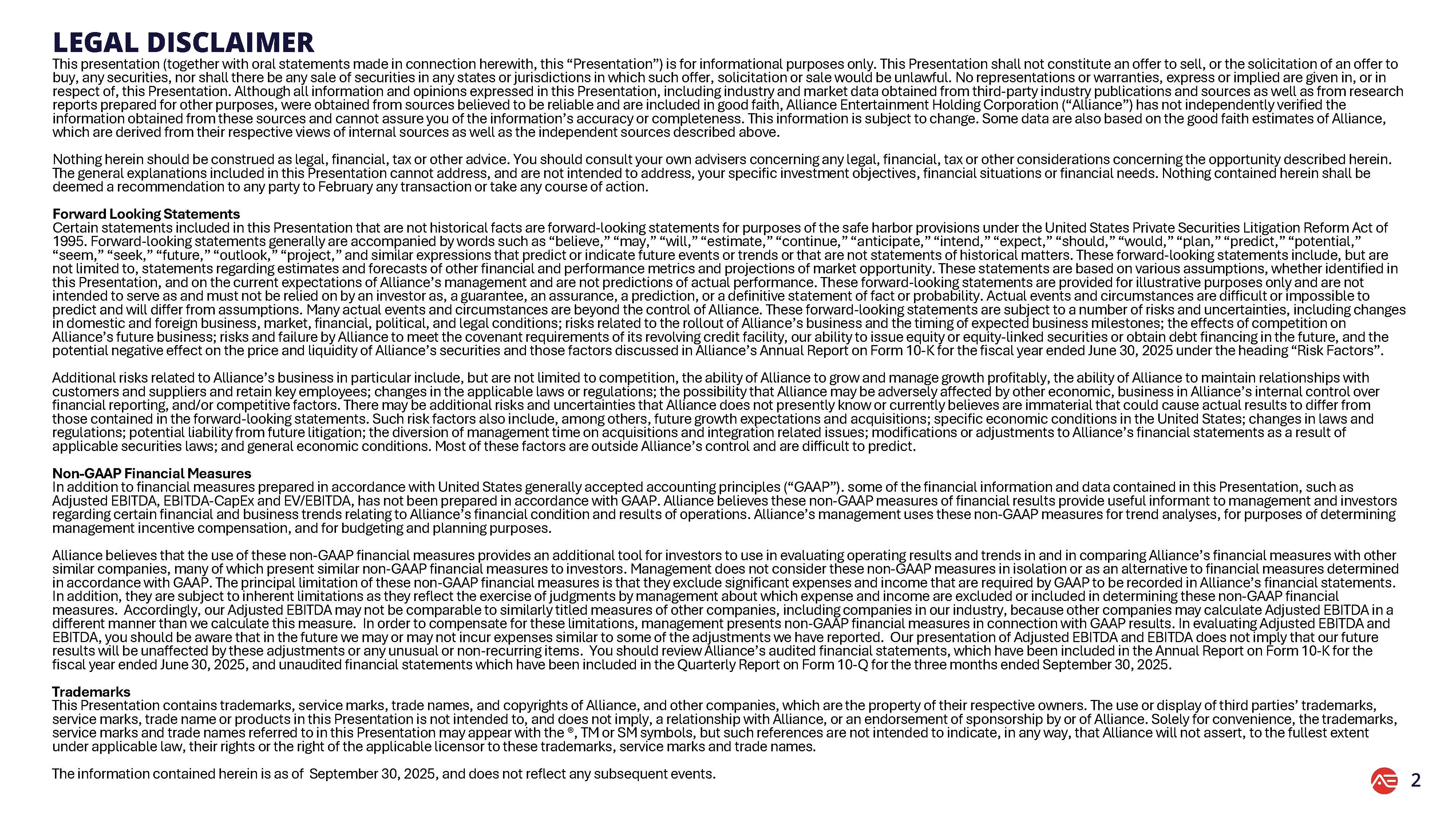 このForm 8-Kによる最新報告書には、1995年米国私募証券訴訟改革法(PSER Act of 1995)のセーフ・ハーバー条項に基づき、過去の事実ではなく将来の見通しに関する記述(forward-looking statements)が含まれています。これらの記述は、本Form 8-Kに記載されているか否かを問わず、さまざまな仮定および当社経営陣の現在の予想に基づいており、実際の業績を予測するものではありません。実際の出来事や状況を予測することは困難または不可能であり、仮定とは異なることがあります。これらの将来予想に関する記述は、2025年9月10日に米国証券取引委員会(以下「SEC」)に提出された当社の年次報告書(フォーム10-K)の「リスク要因」、およびSECに提出された、または提出される予定の当社のその他の文書(当社ウェブサイトir.aent.comの投資家向け情報セクションからアクセス可能)に記載されている要因を含む、多くのリスクおよび不確実性の影響を受けます。リスクが現実化した場合、または仮定が誤りであることが判明した場合、実際の結果はこれらの将来見通しに関する記述に暗示された結果とは大きく異なる可能性があります。当社は、いかなる将来予想に関する記述も更新する義務を負いません。