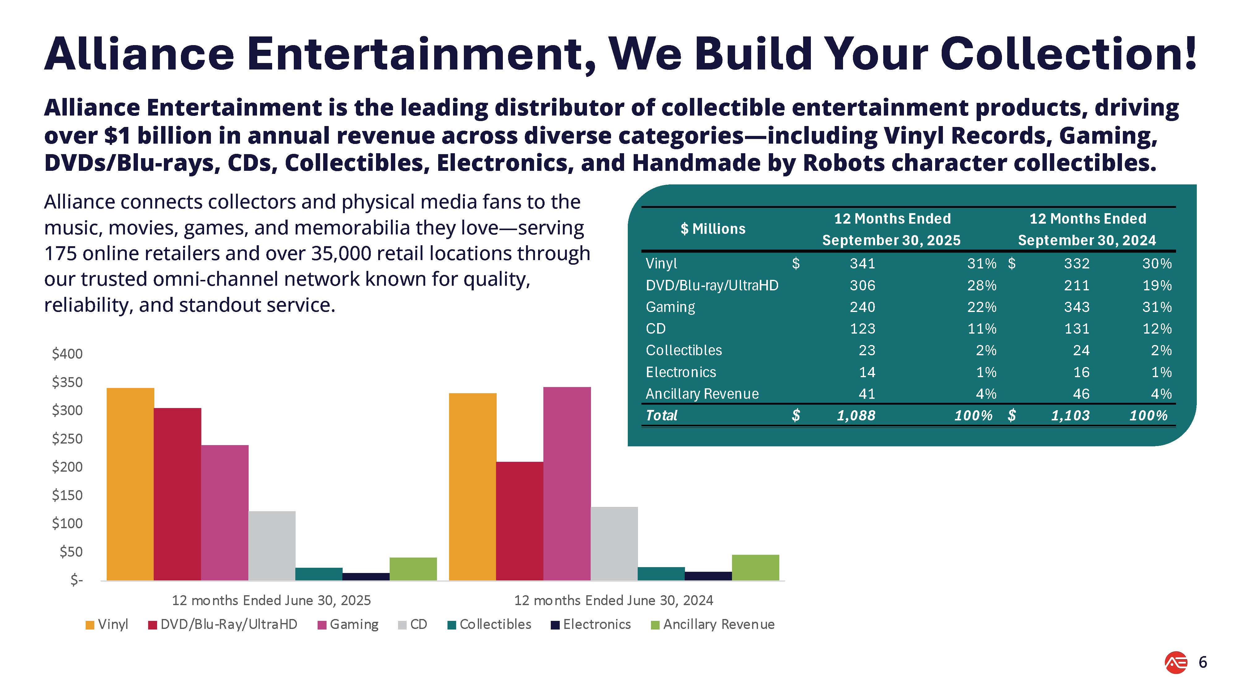 フロリダ州プランテーション、2025年11月12日(GLOBE NEWSWIRE) - エンターテインメントとポップカルチャーのコレクターズアイテム業界をリードするディストリビューター、ロジスティクス・プロバイダー、オムニチャネル・フルフィルメント・パートナーであるアライアンス・エンターテインメント・ホールディング・コーポレーション(Nasdaq: AENT)は、音楽、ビデオ、ビデオゲーム、ライセンス商品、限定コレクターズアイテムなど34万以上のユニークなSKUを3万5000以上の小売店やeコマースストアに供給しているが、2025年9月30日で終了した会計年度第1四半期の財務および経営成績を報告した。