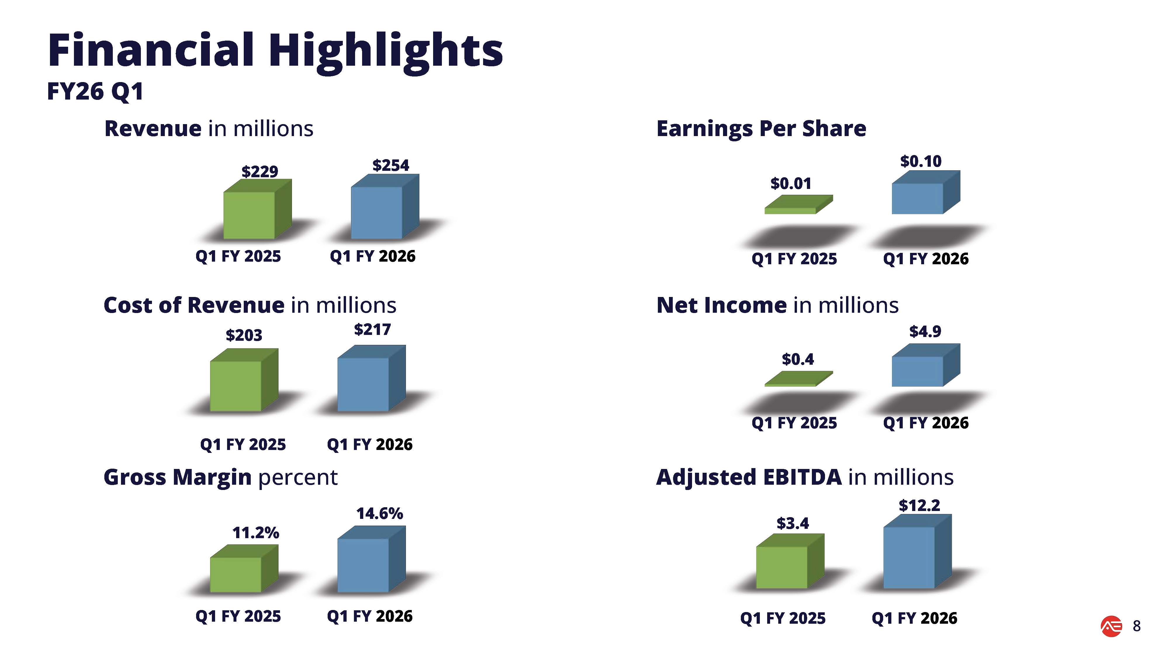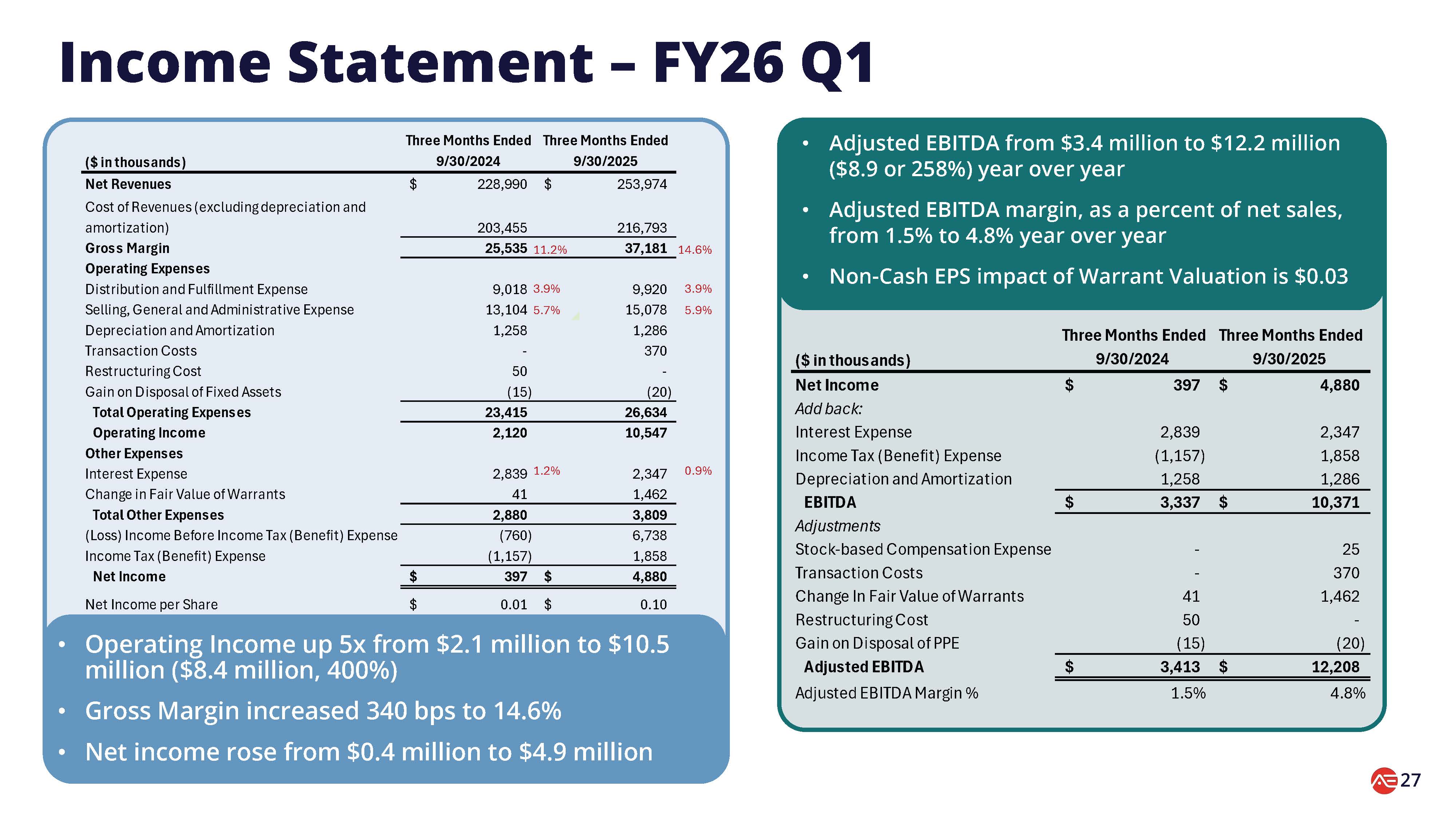 調整後EBITDAは259%増の1,220万ドル、売上総利益率は340bp拡大し14.6%に