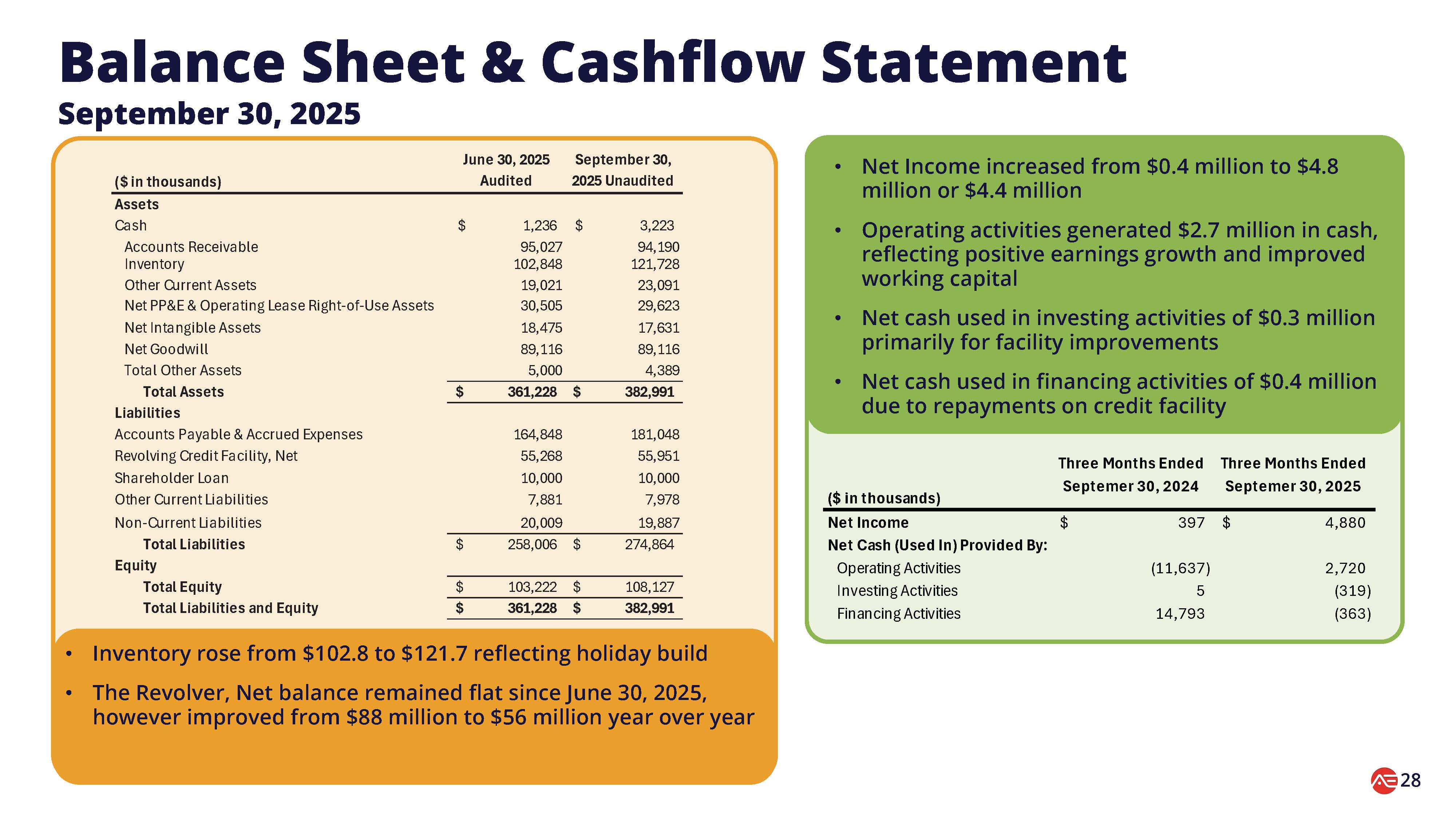 | ● | バランスシートと流動性の強さ:アライアンスの当四半期末の現金は320万ドル、運転資本は5,320万ドルで、在庫と買掛金の効率的な管理を反映している。在庫は、ホリデーシーズンの需要とコンテンツ・パートナーシップの拡大を背景に1億2,170万ドルに増加し、買掛金は1億7,380万ドルとなりました。支払利息は、平均リボルバー残高の減少と金利の改善により、前年同期比で17%減少しました。当四半期末後、当社はバンク・オブ・アメリカから1億2,000万ドルの新しい有担保上位クレジット・ファシリティ・ファシリティで資産担保融資契約を借り換え、流動性と財務の柔軟性を強化しました。利用可能額は前年同期の3,200万ドルから6,100万ドルに増加した。 |