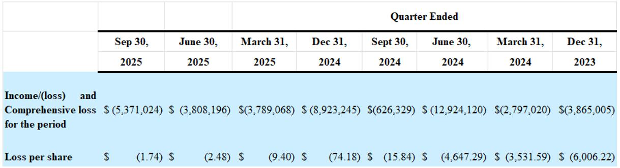The Company experienced a net loss for the nine month period ended September 30, 2025 of $12,968,288 compared to a net loss of $16,347,469 for the nine month period ended September 30, 2024, a positive variance of $3,379,181.