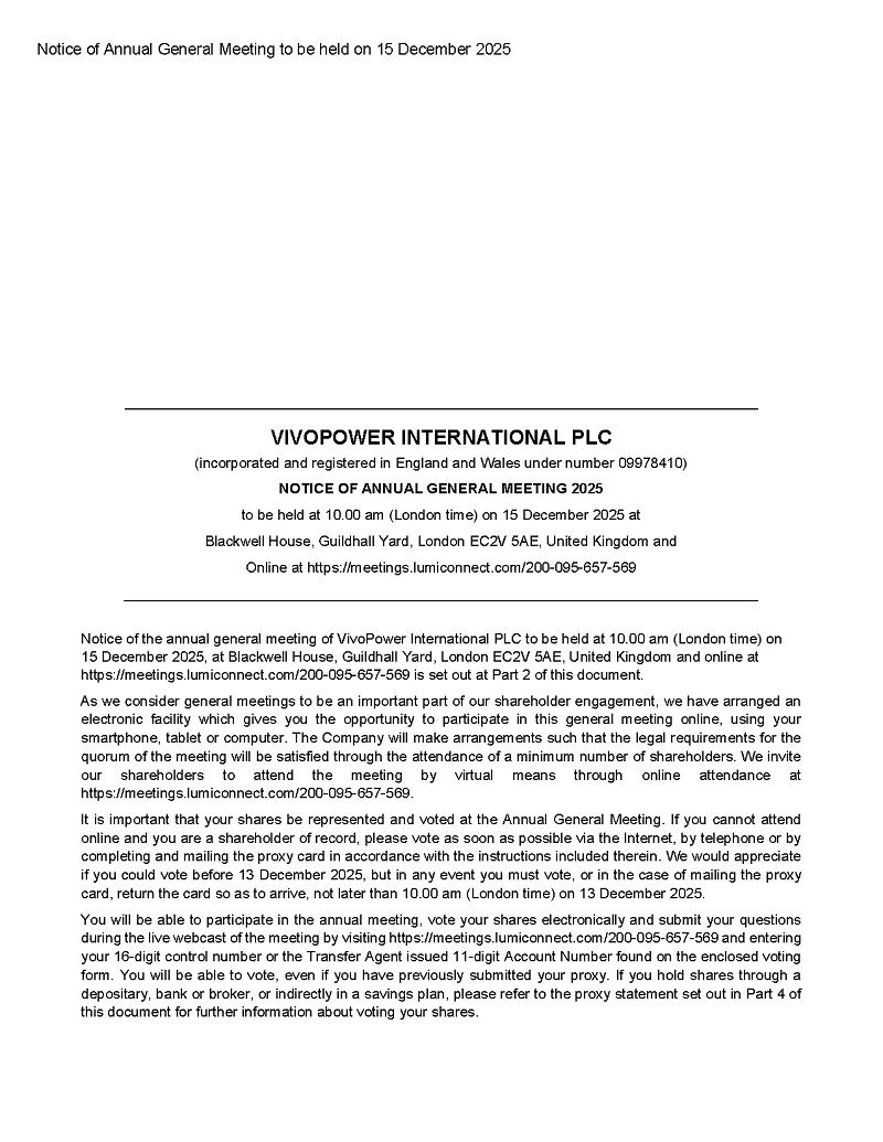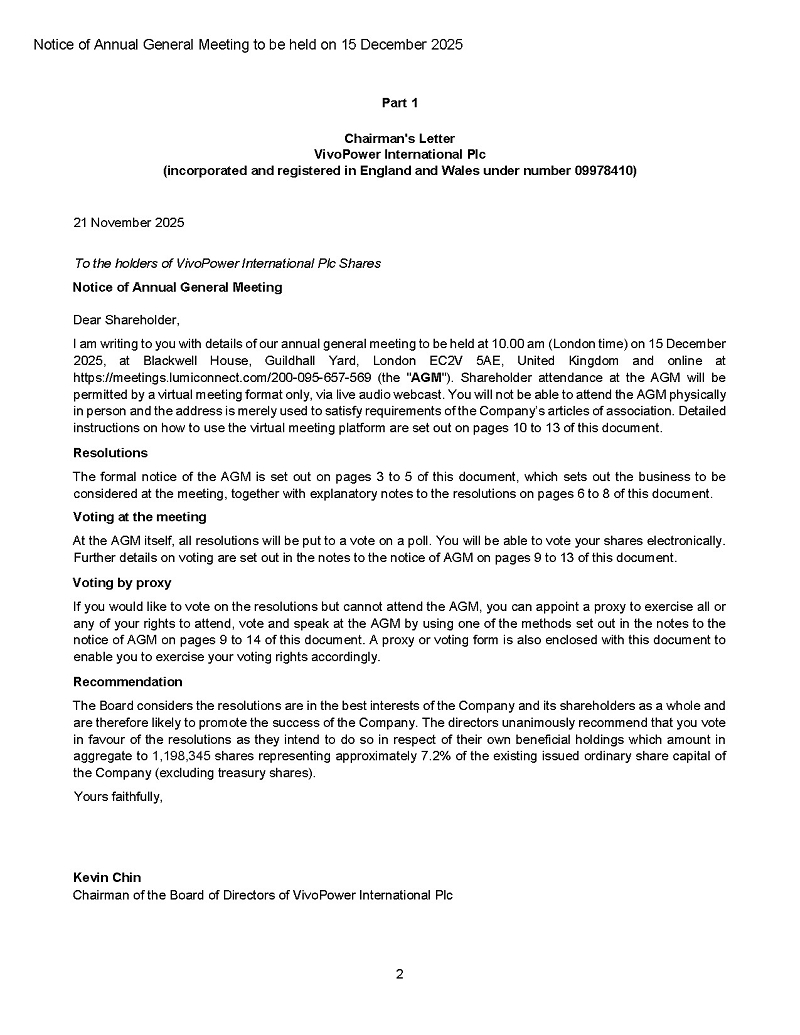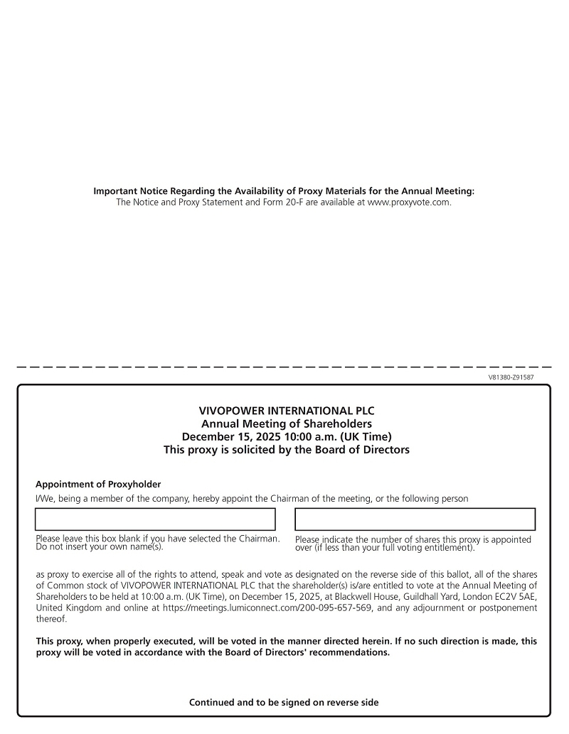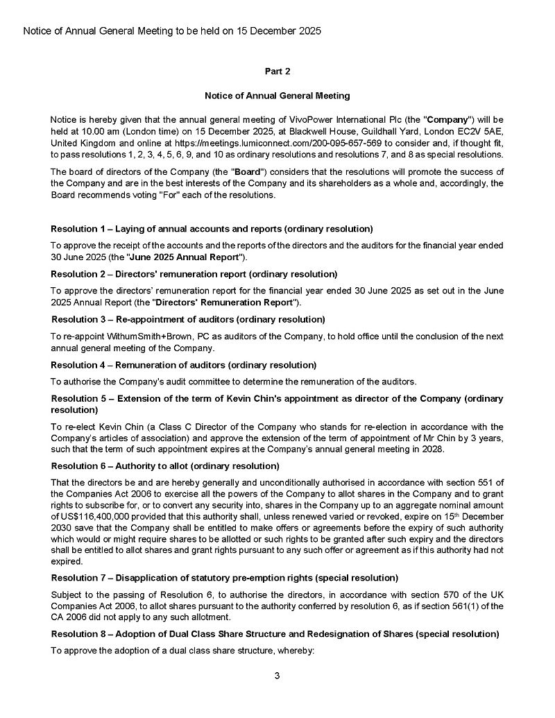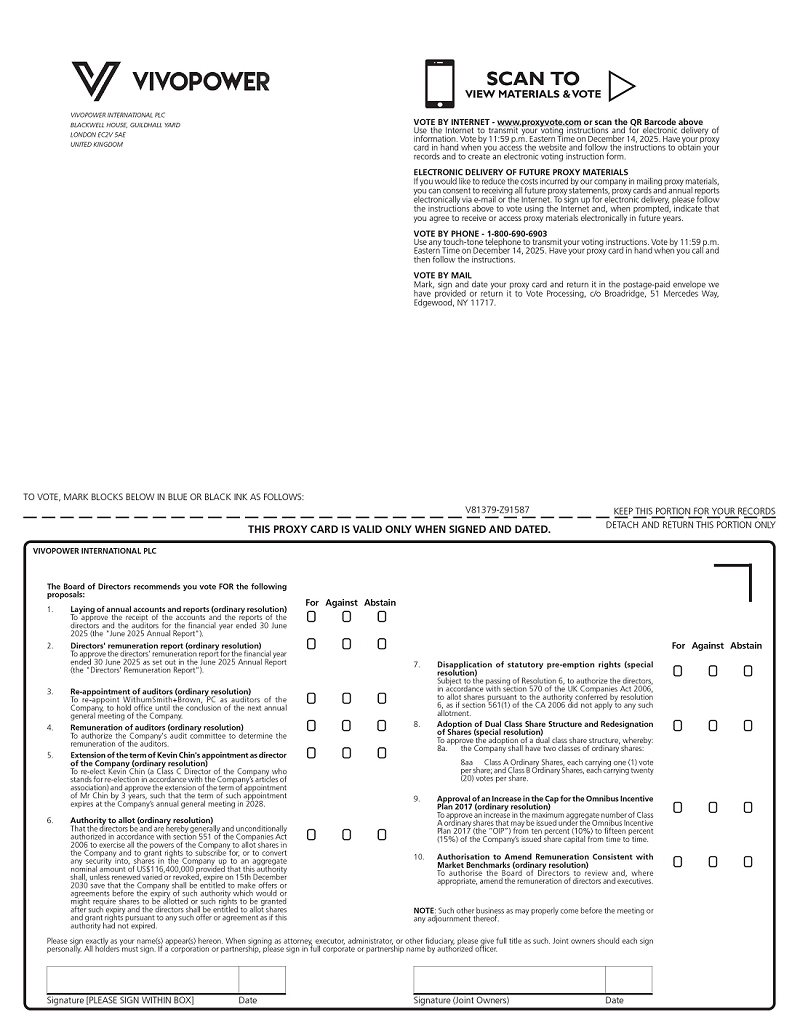 On November 21, 2025, VivoPower International PLC (the “Company” or “VivoPower”) announced that it will hold its Annual General Meeting (“AGM”) at its office in London and online on Monday, December 15, 2025, at 10:00 a.m. London time.