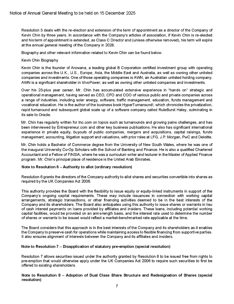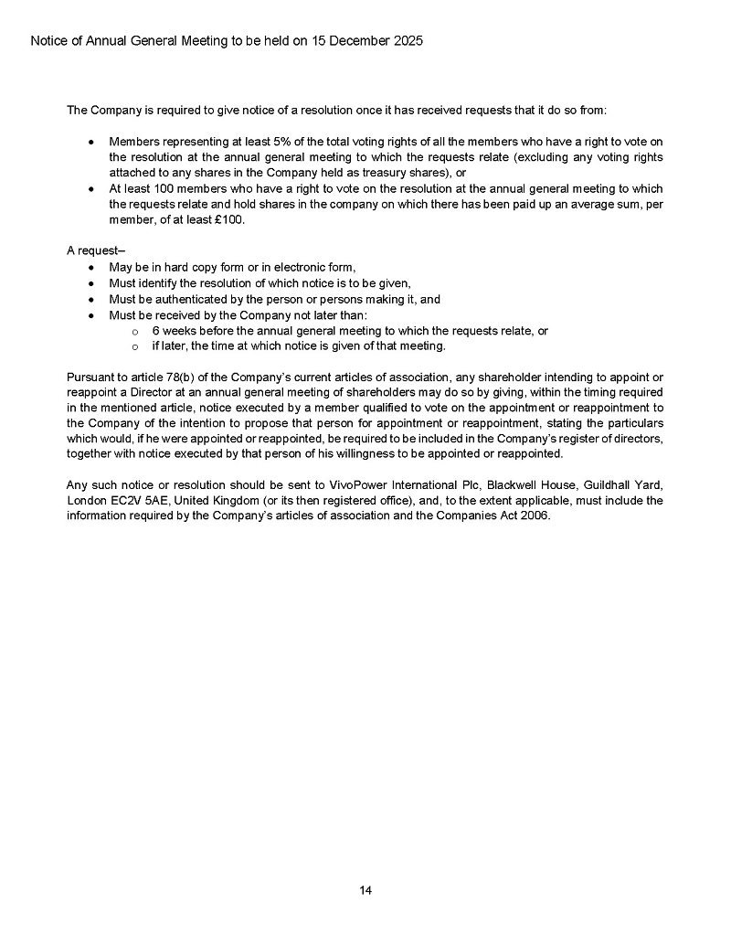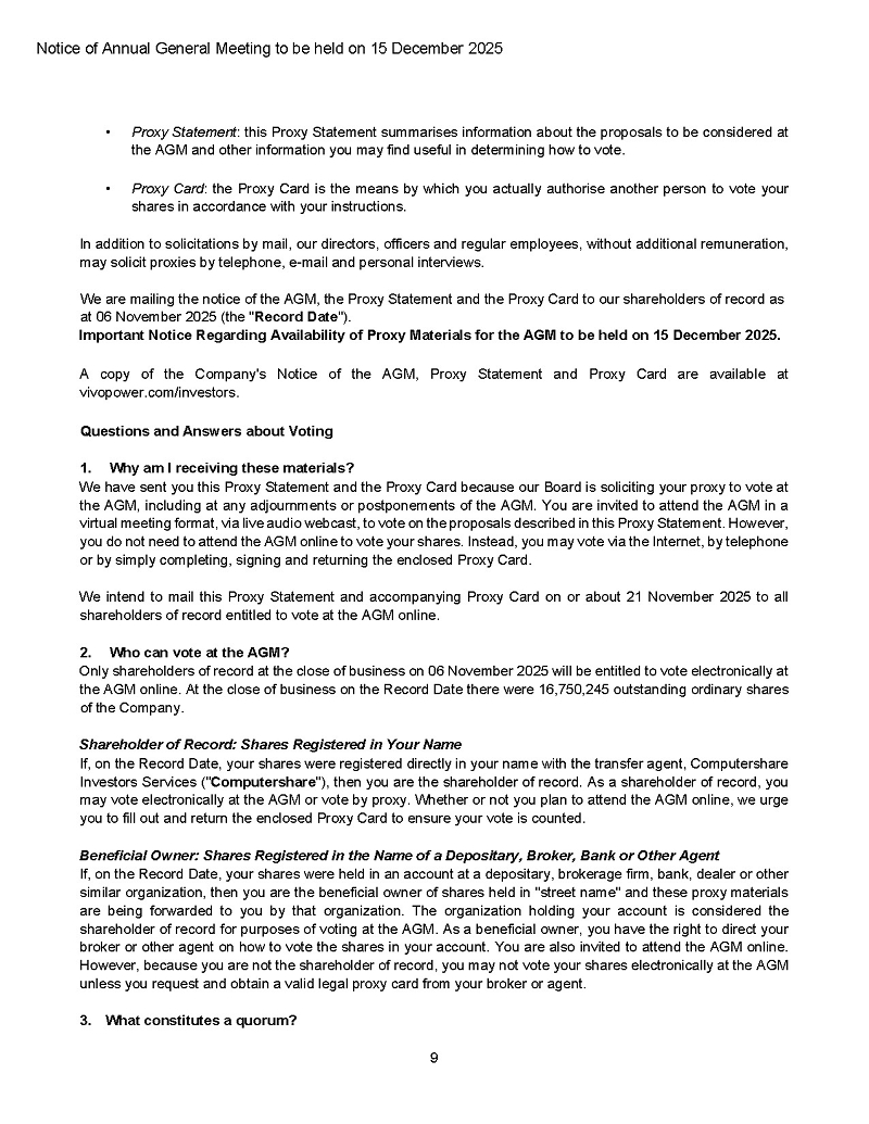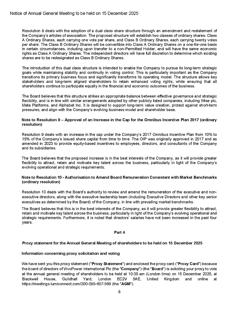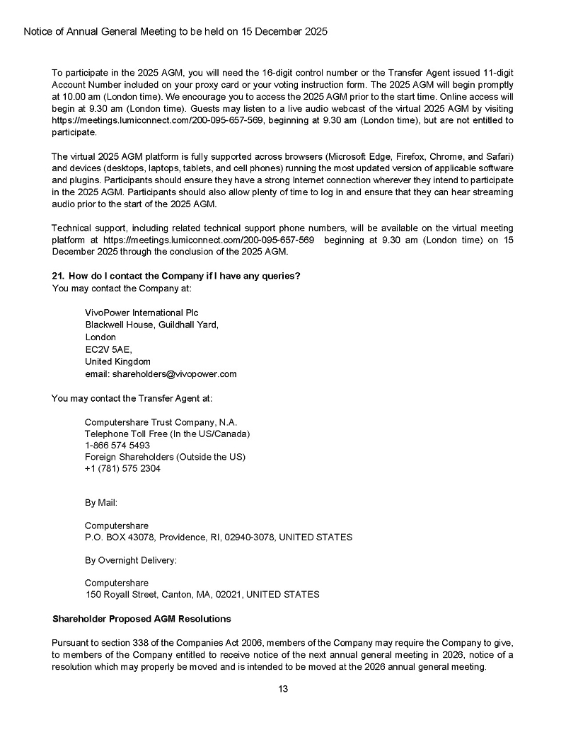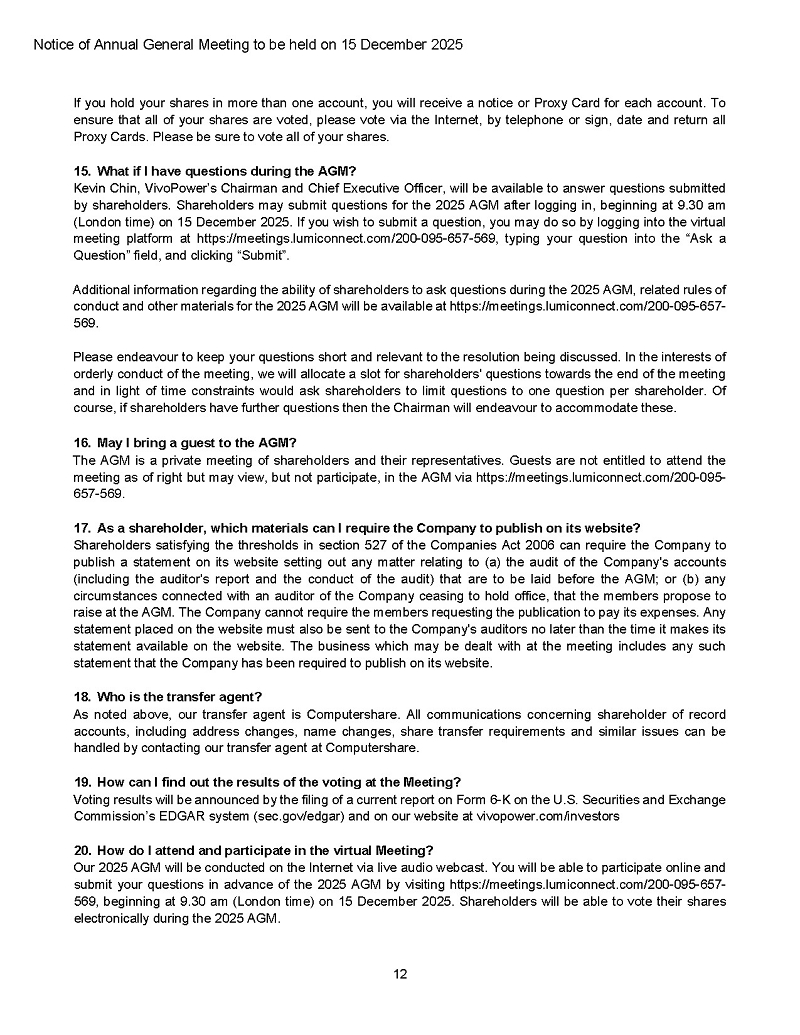 On November 21, 2025, VivoPower International PLC (the “Company” or “VivoPower”) announced that it will hold its Annual General Meeting (“AGM”) at its office in London and online on Monday, December 15, 2025, at 10:00 a.m. London time.