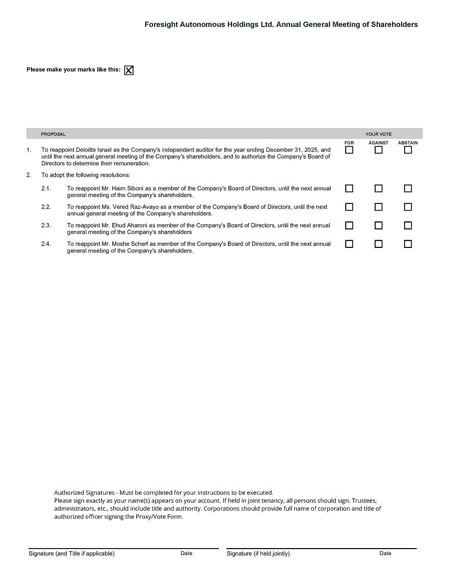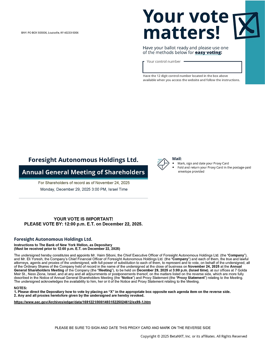 On November 21, 2025, Foresight Autonomous Holdings Ltd. (the “Company”) previously announced that it will convene an Annual General Meeting of Shareholders (the “Meeting”) on Monday, December 29, 2025. Attached hereto and incorporated by reference herein is the voting instruction form which will be sent to holders of American Depositary Shares by The Bank of New York Mellon for the Meeting. Only shareholders of record who held Ordinary Shares of the Company, or American Depositary Shares representing Ordinary Shares of the Company, at the close of business on November 24, 2025, will be entitled to vote at the Meeting and any postponement or adjournment thereof.