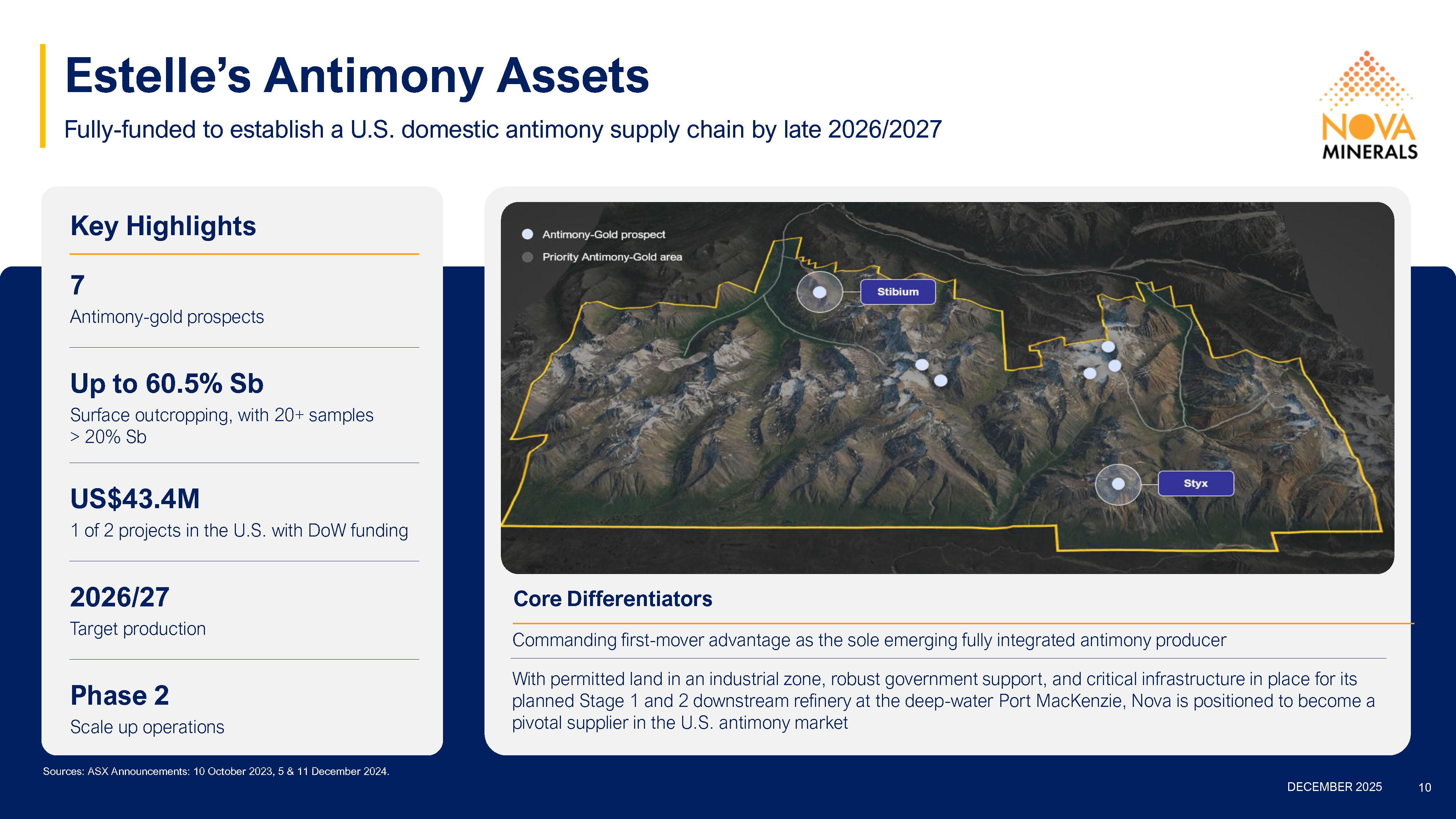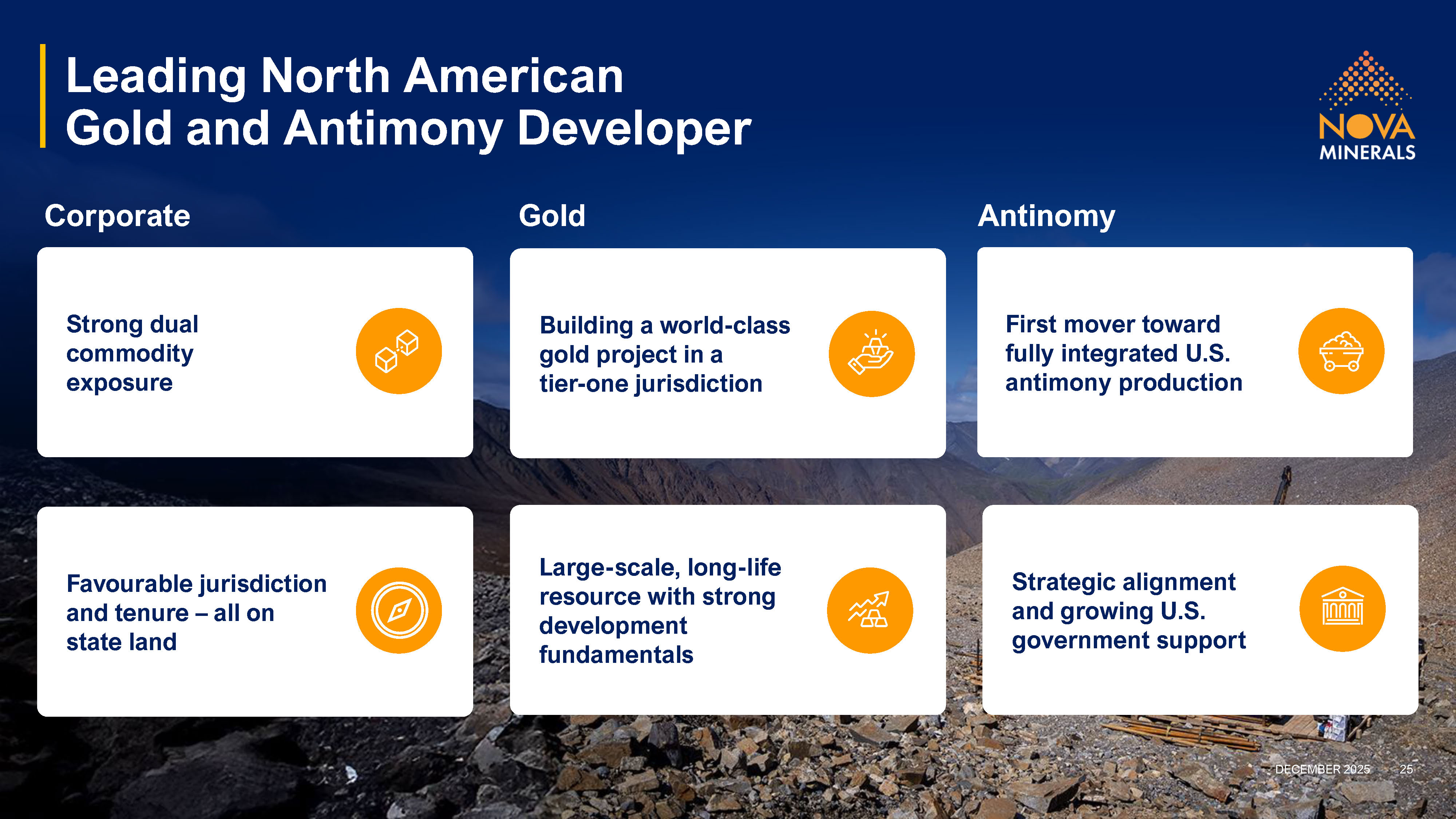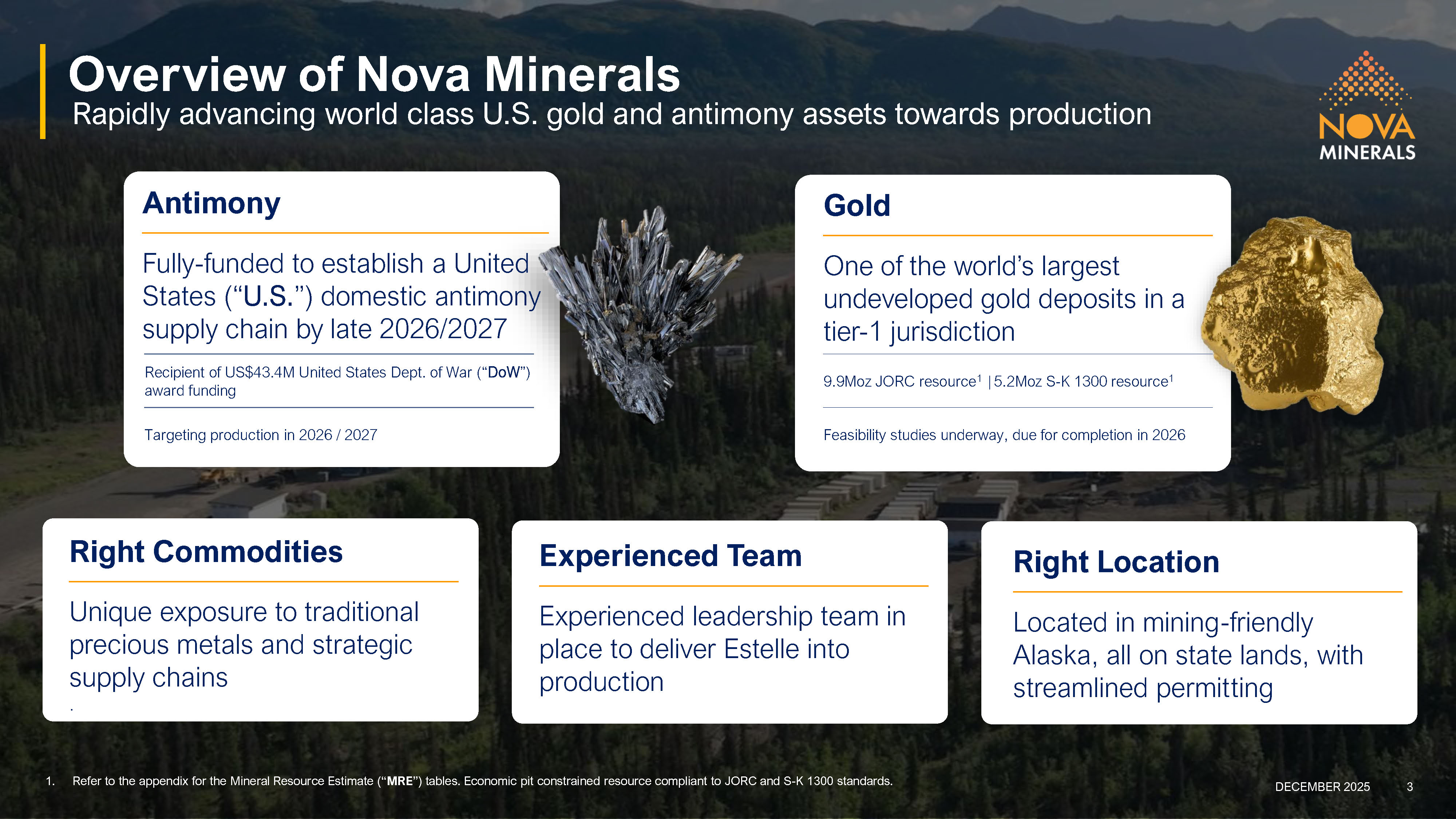 This interactive online event will feature Nova’s Chief Executive Officer Christopher Gerteisen, who will share the latest developments from the Company’s Estelle Gold and Critical Minerals Project in Alaska, one of North America’s largest undeveloped gold assets with a multi-million-ounce resource and significant growth potential. Following the recent US$43.4 million award from the Department of War, the presentation will also outline Nova’s strategy to advance its antimony assets, fast-tracking production to establish the United States’ first fully domestic, integrated antimony supply chain based in Alaska.