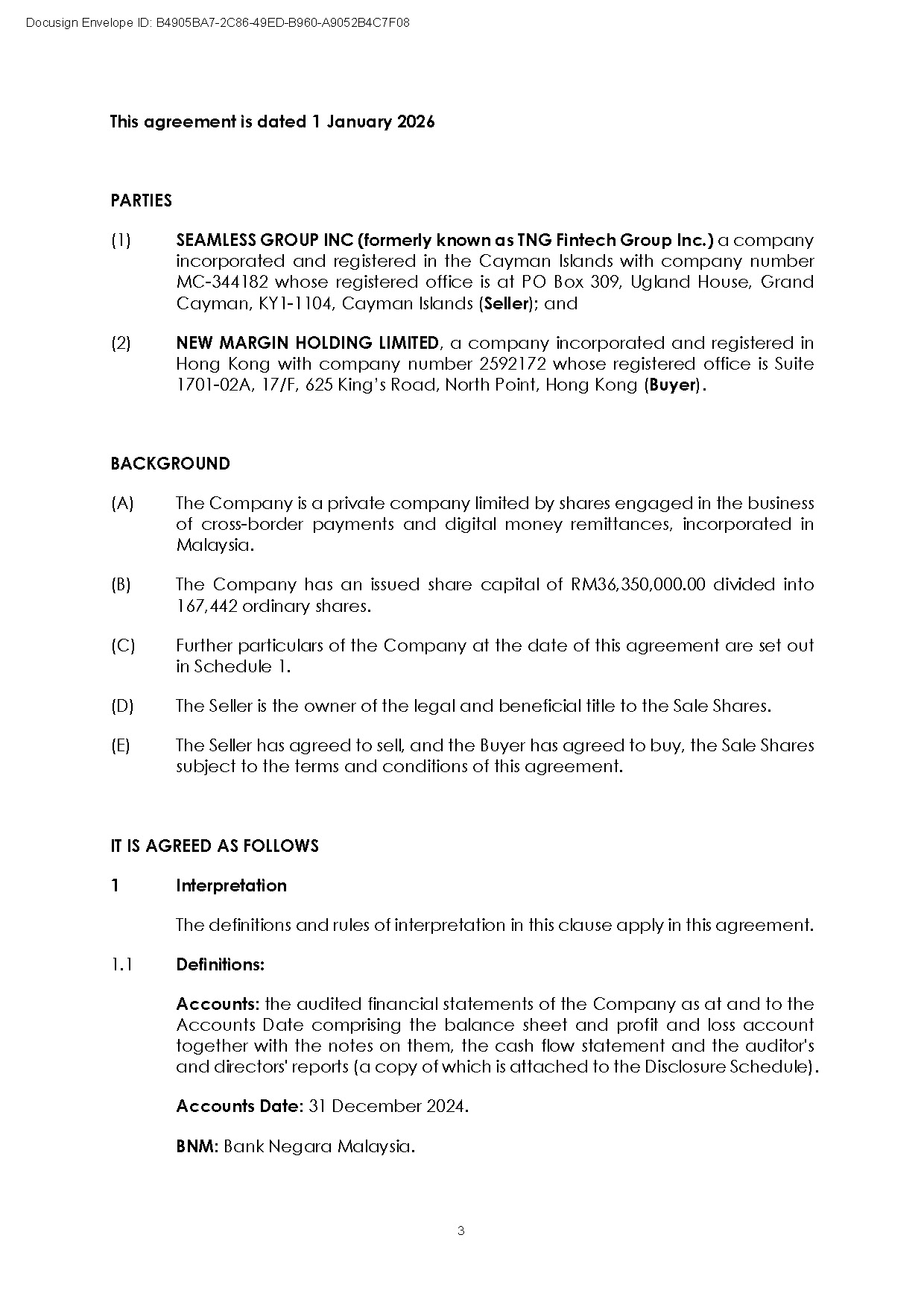 SINGAPORE, January 2, 2026 — Currenc Group Inc. (Nasdaq: CURR) (“Currenc” or the “Company”), a fintech pioneer empowering financial institutions worldwide with artificial intelligence (AI) solutions, today announced that its wholly owned subsidiary, Seamless Group Inc., has executed a definitive share purchase agreement to divest its 60% controlling interest in Tranglo Sdn. Bhd. (“Tranglo”) to New Margin Holding Limited. The transaction marks a pivotal milestone in the Company’s strategic transformation and value-unlocking initiatives.