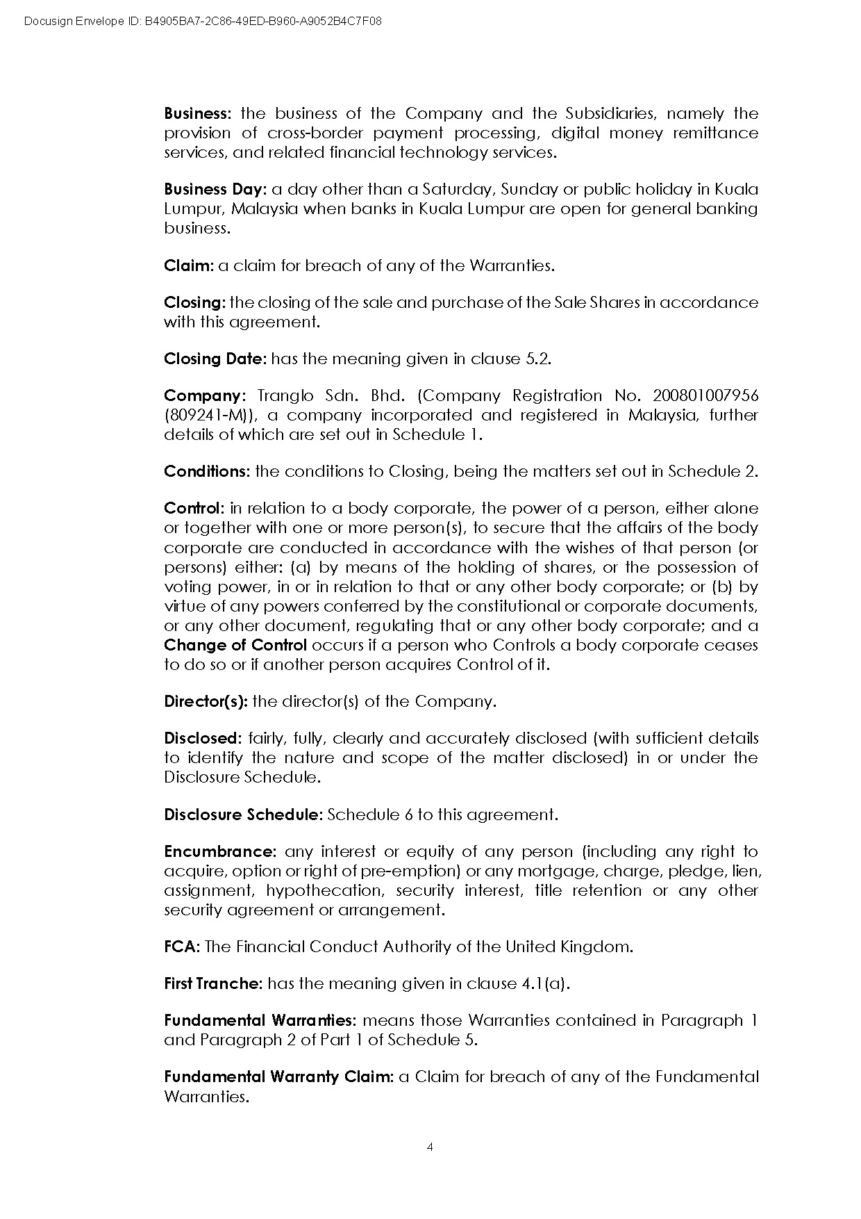 The divestment represents a foundational step in Currenc’s plan to monetize and spin off its existing operating businesses, allowing the Company to streamline its corporate structure and accelerate the realization of shareholder value. Under the terms of the agreement, Currenc will divest 100,465 ordinary shares of Tranglo, representing 60% of Tranglo’s total issued share capital, for an aggregate purchase price of US$400 million, payable entirely in cash. The consideration will be paid in two installments, with US$200 million payable on the closing date and the remaining US$200 million payable on or before the date that is ninety (90) days after closing.