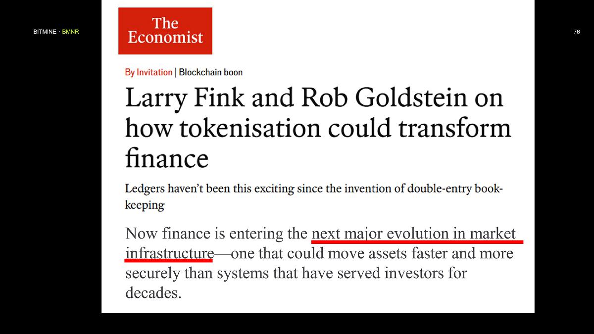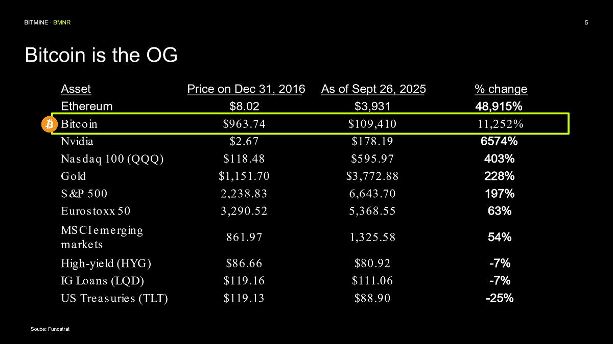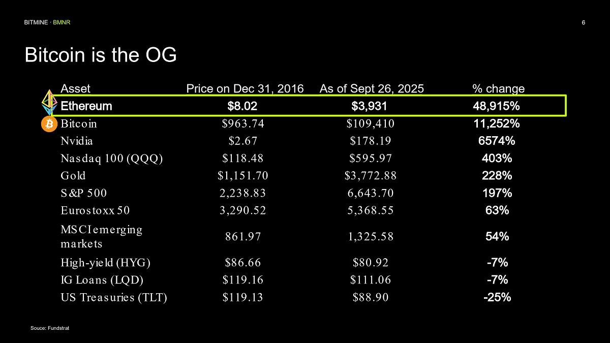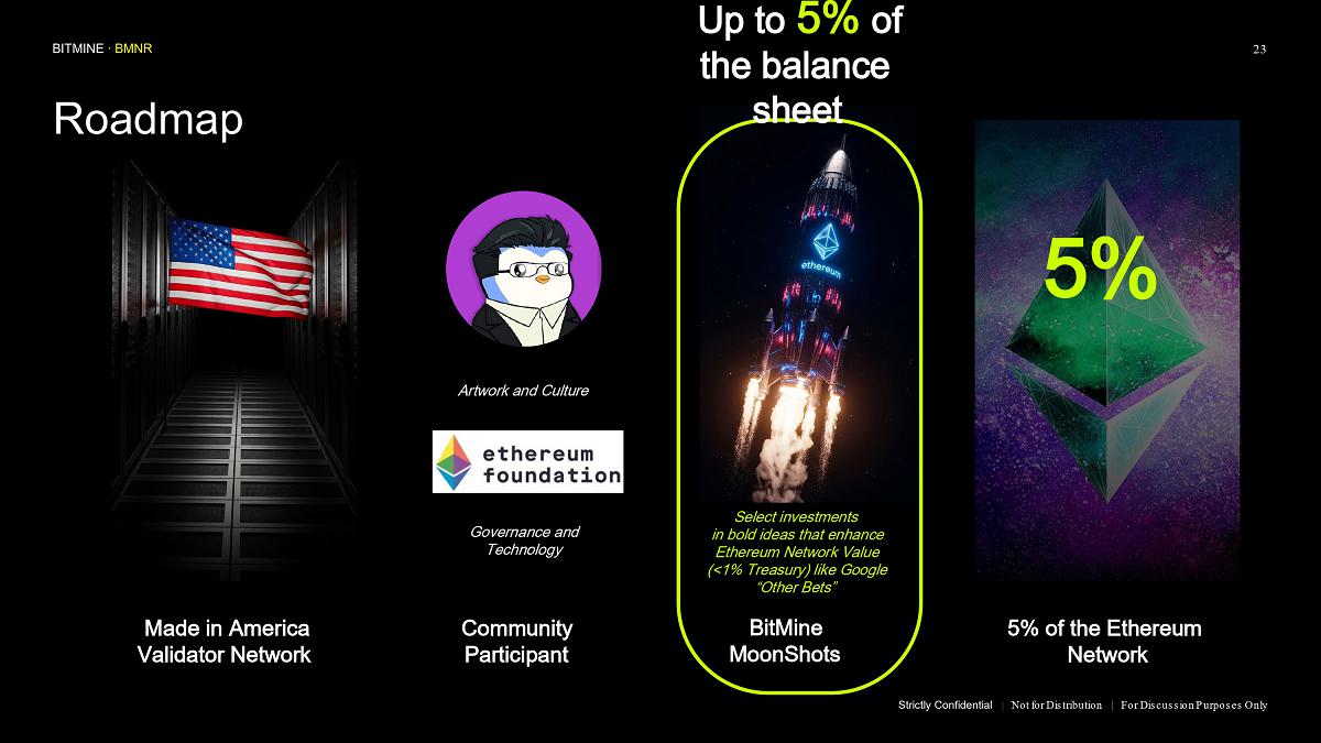 Bitmine is supported by a premier group of institutional investors including ARK’s Cathie Wood, MOZAYYX, Founders Fund, Bill Miller III, Pantera, Kraken, DCG, Galaxy Digital and personal investor Thomas “Tom” Lee to support Bitmine’s goal of acquiring 5% of ETH