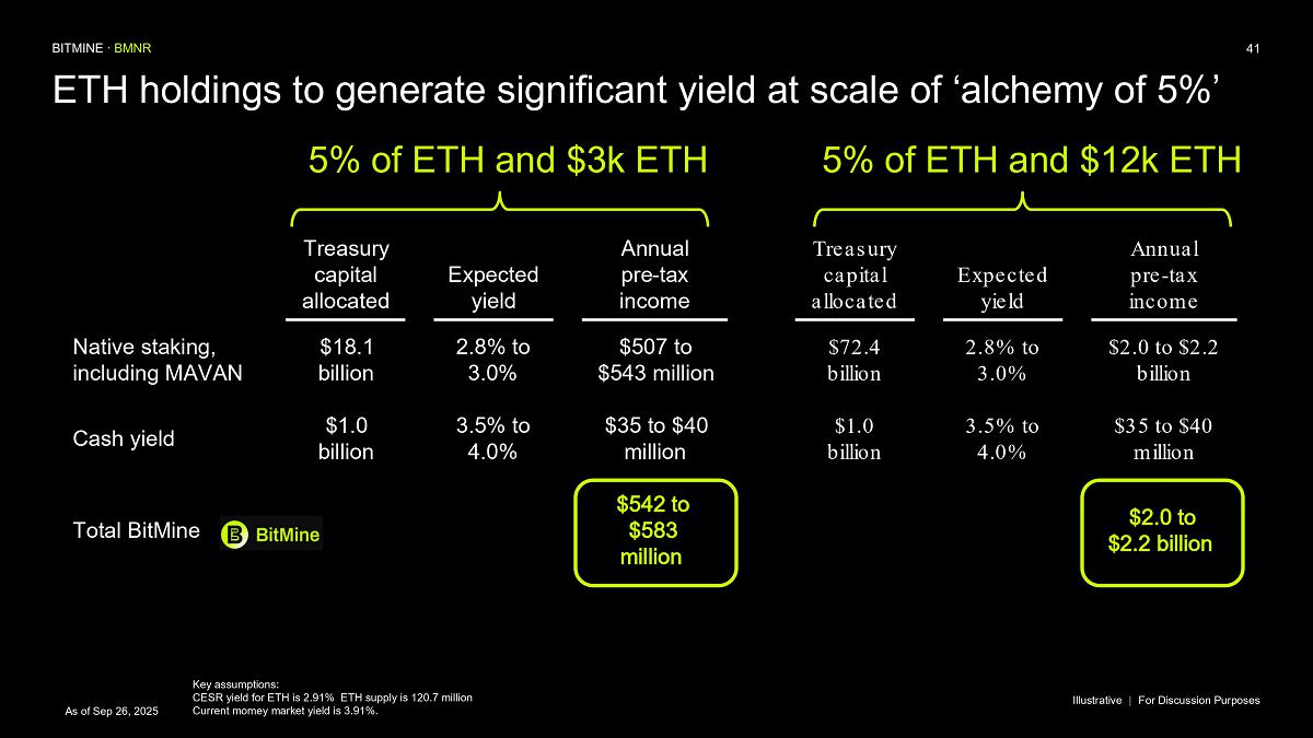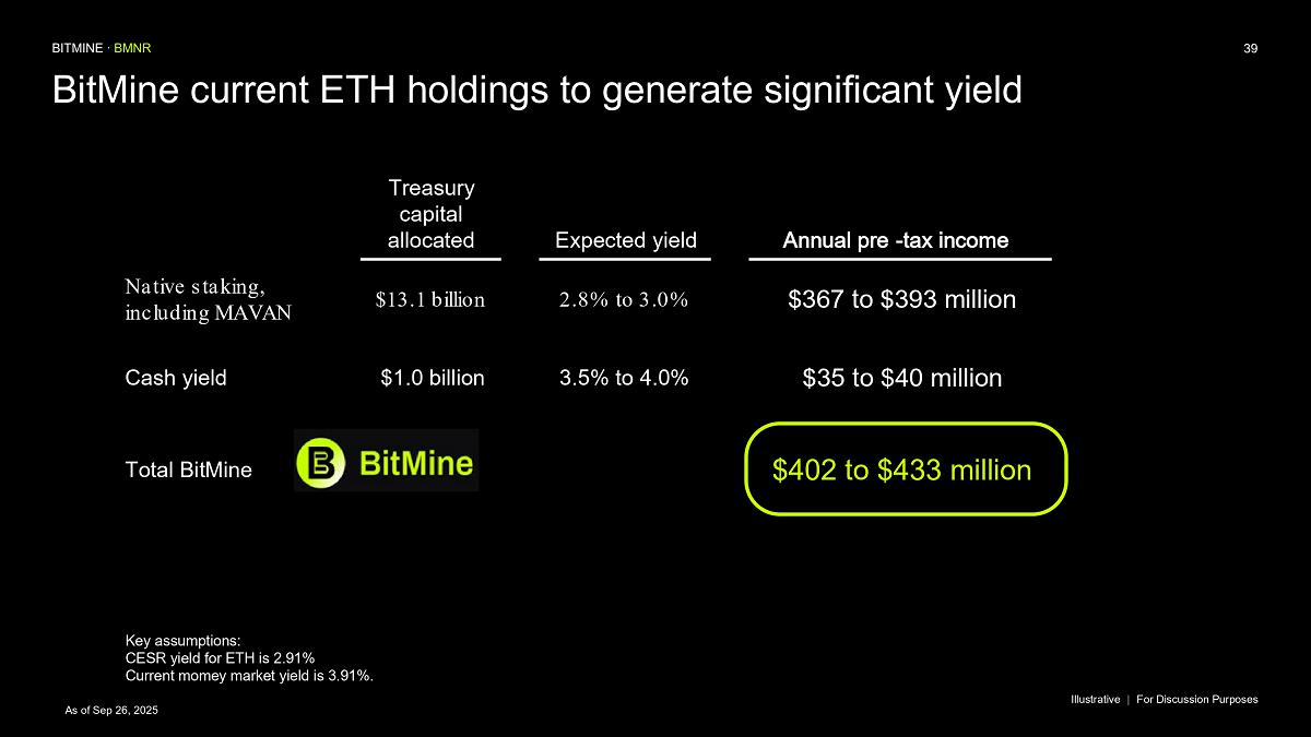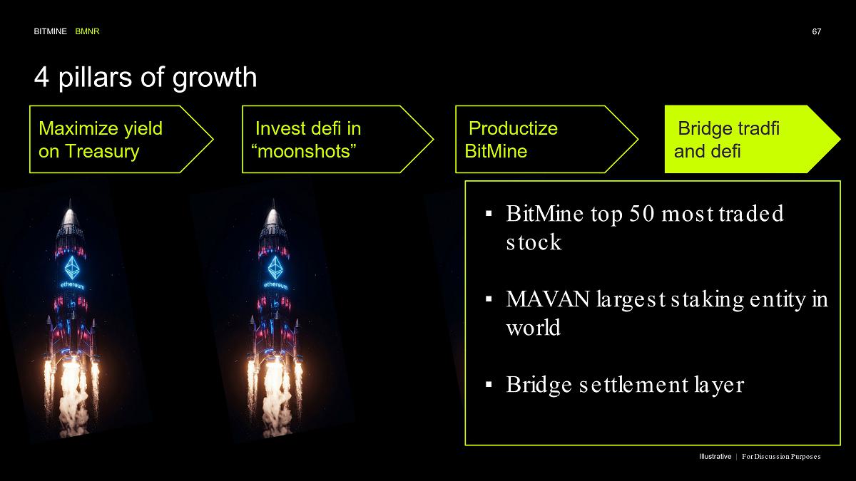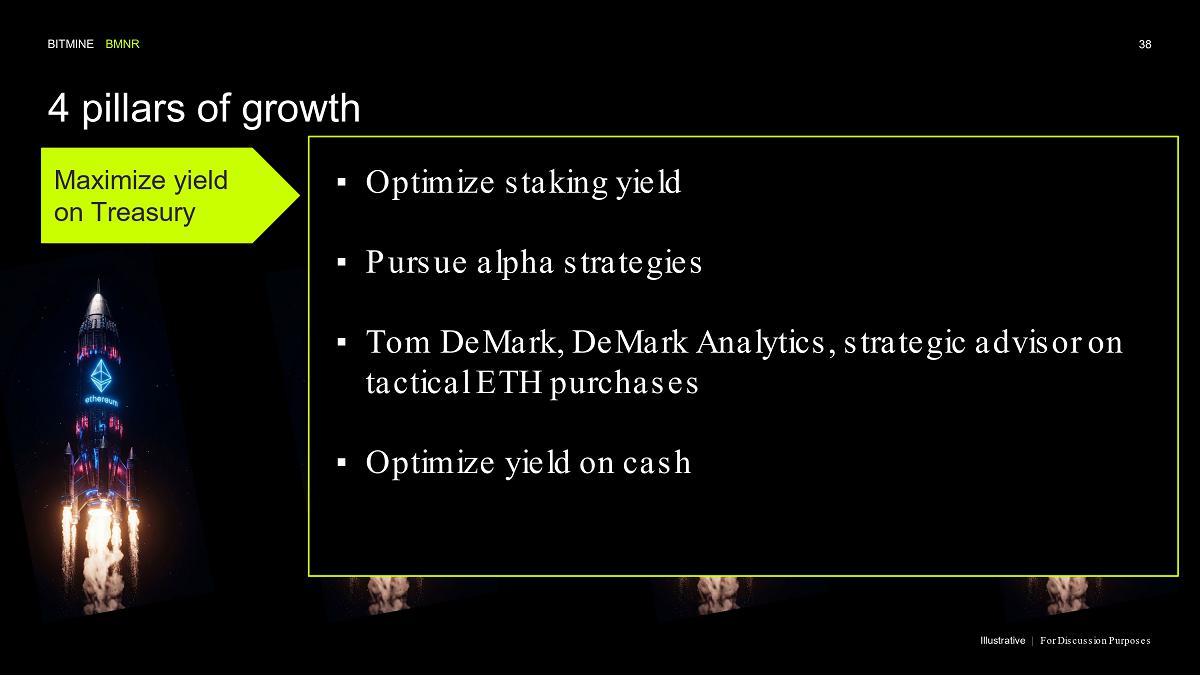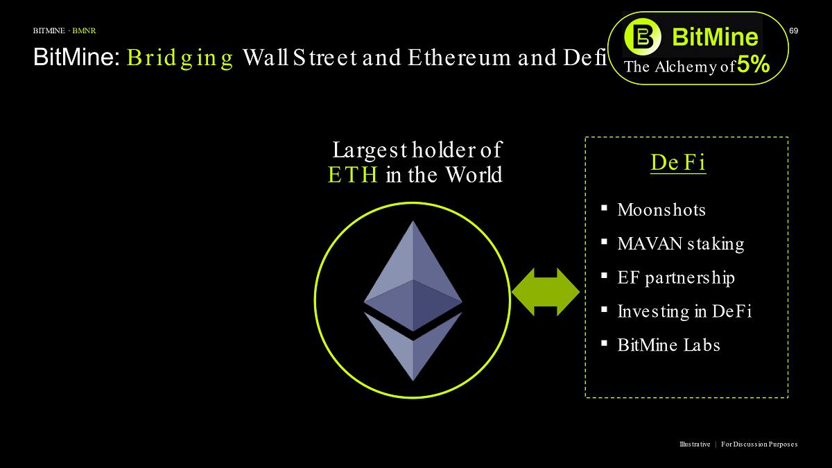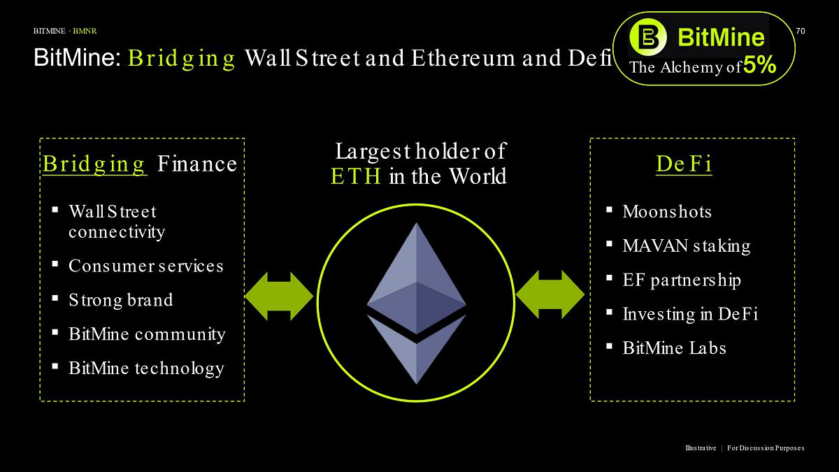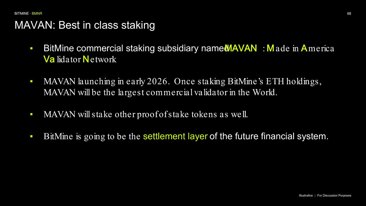 Bitmine (NYSE AMERICAN: BMNR) is the leading Ethereum Treasury company in the world, implementing an innovative digital asset strategy for institutional investors and public market participants. Guided by its philosophy of “the alchemy of 5%,” the company is committed to ETH as its primary treasury reserve asset, leveraging native protocol-level activities including staking and decentralized finance mechanisms. The company will launch MAVAN (Made-in America Validator Network), a dedicated staking infrastructure for Bitmine assets, in Q1 of 2026.