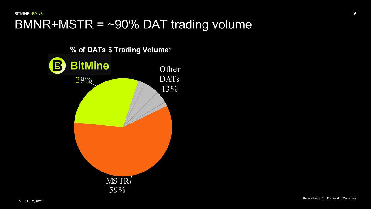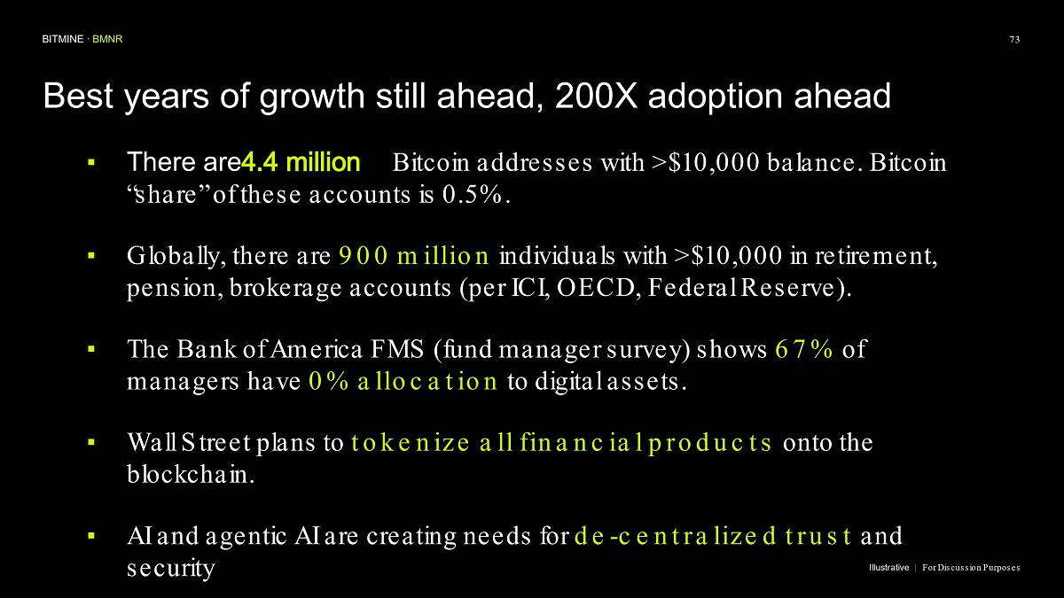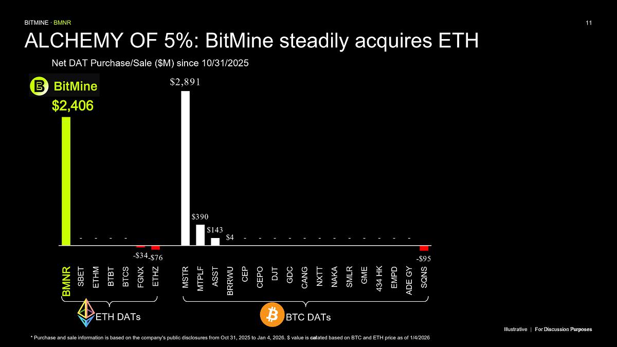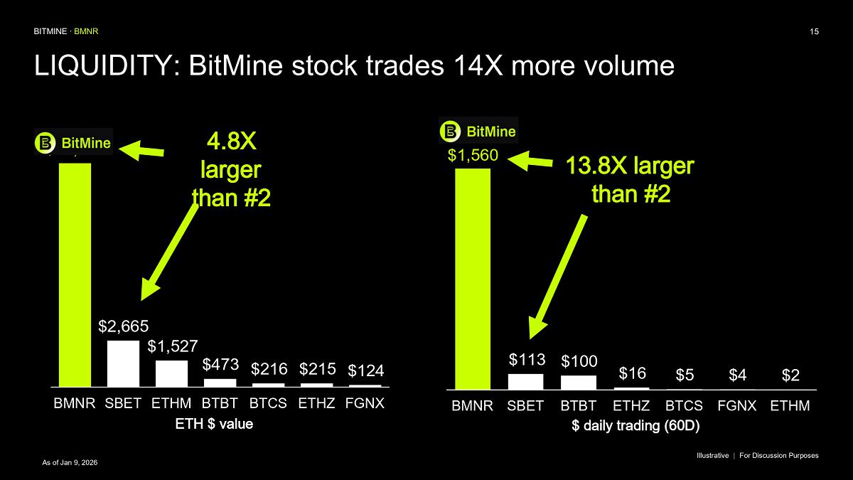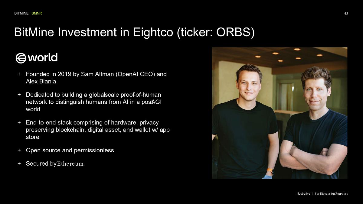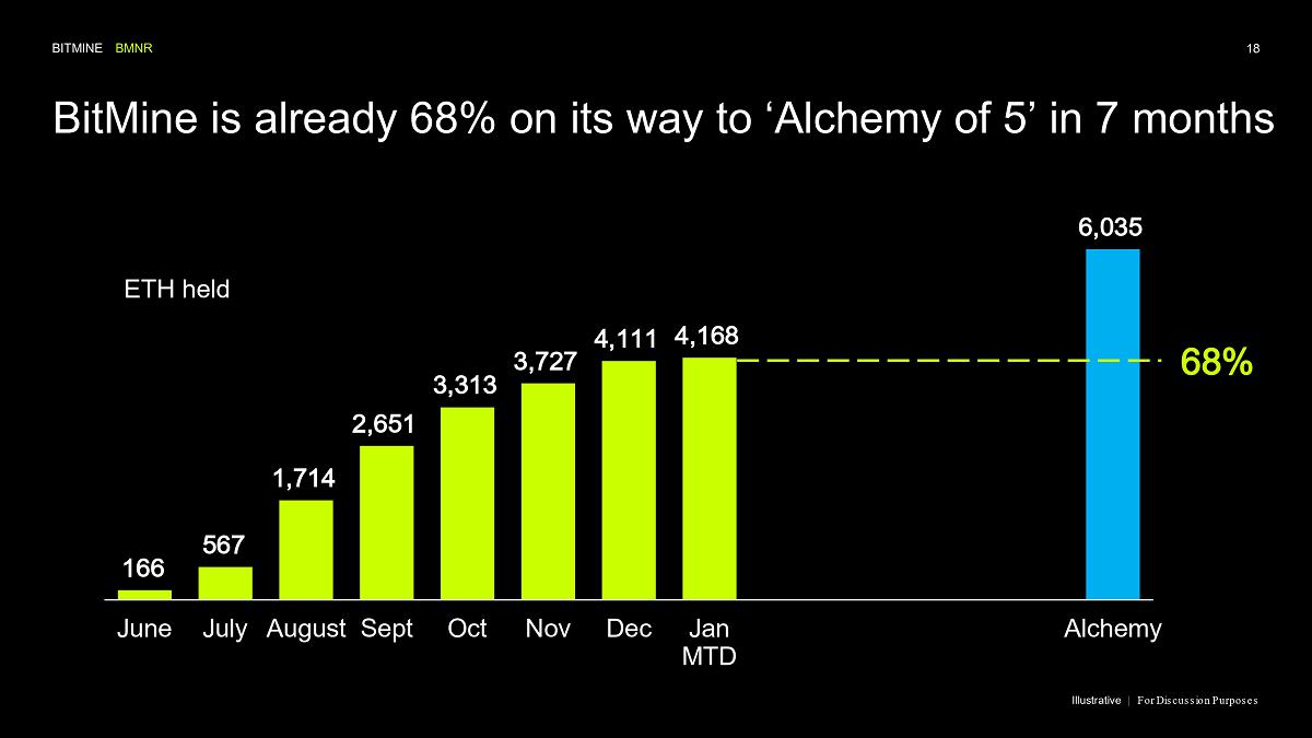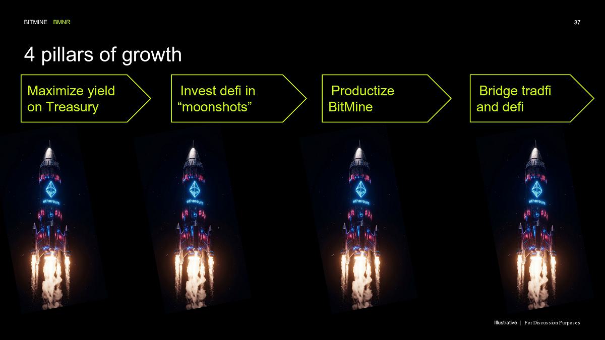 Bitmine (NYSE AMERICAN: BMNR) is the leading Ethereum Treasury company in the world, implementing an innovative digital asset strategy for institutional investors and public market participants. Guided by its philosophy of “the alchemy of 5%,” the company is committed to ETH as its primary treasury reserve asset, leveraging native protocol-level activities including staking and decentralized finance mechanisms. The company will launch MAVAN (Made-in America Validator Network), a dedicated staking infrastructure for Bitmine assets, in Q1 of 2026.