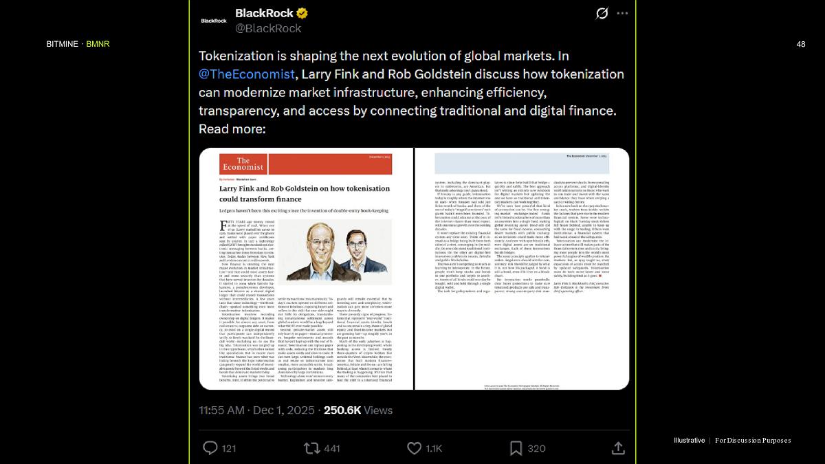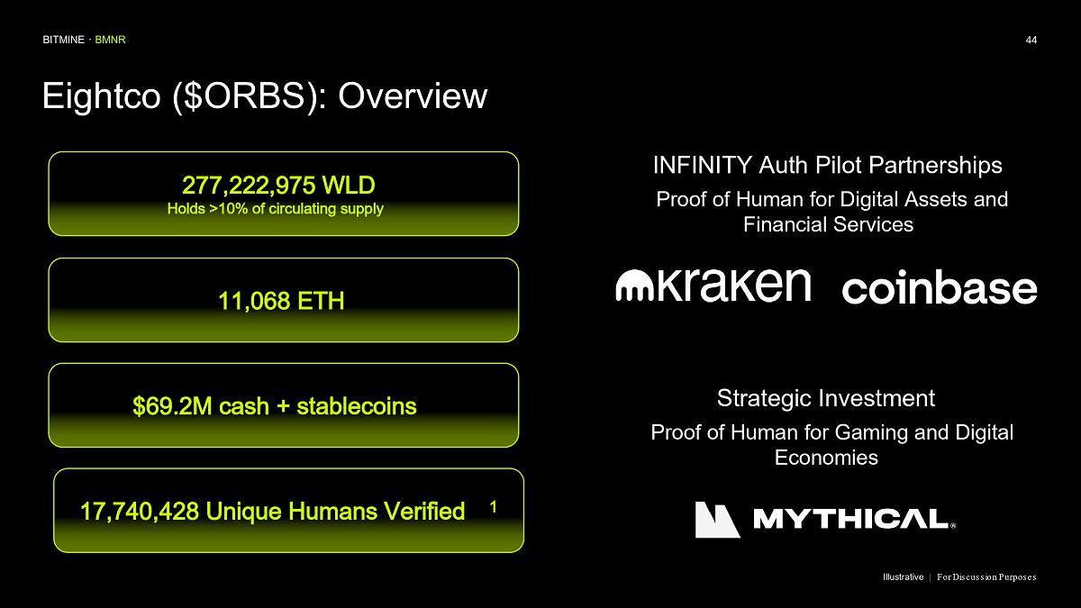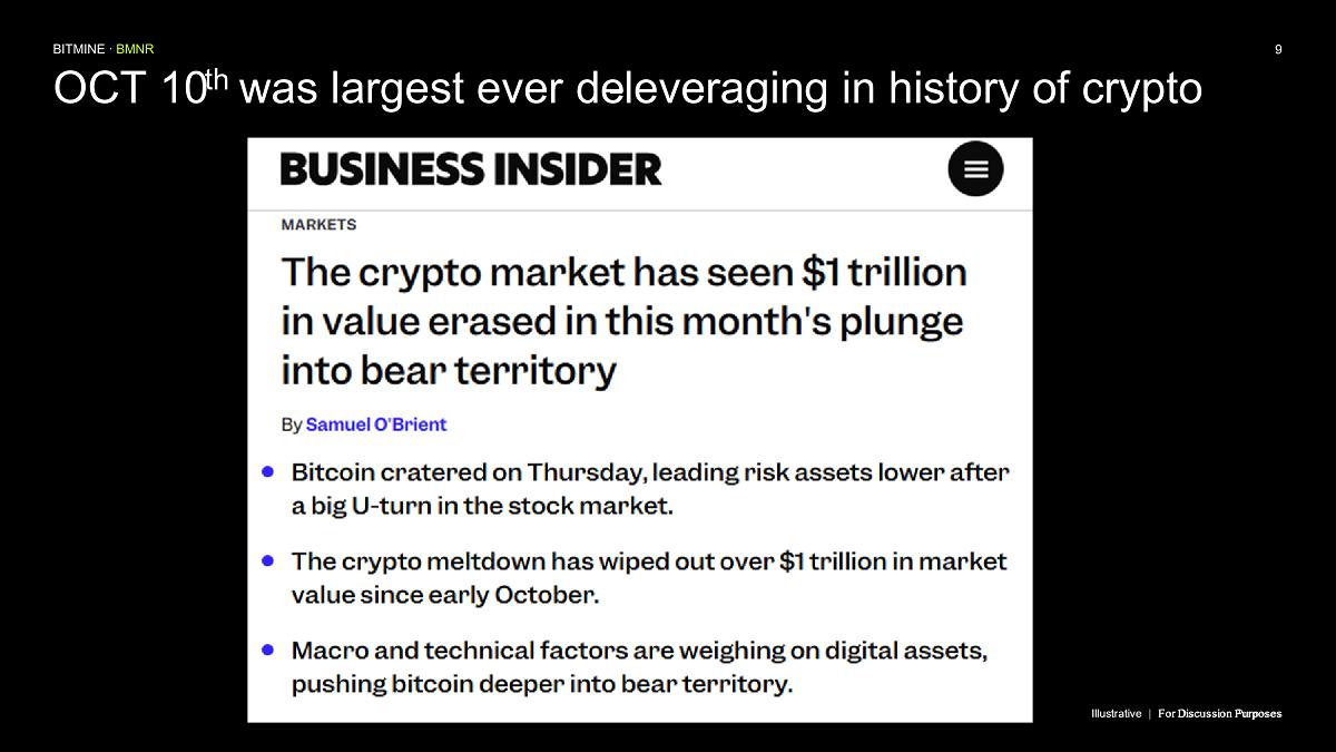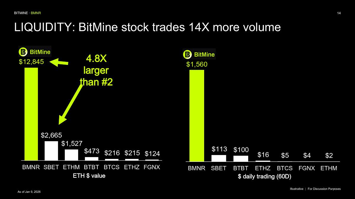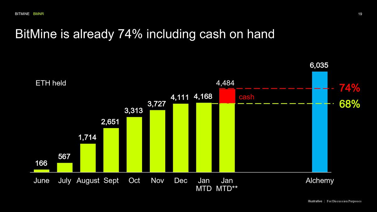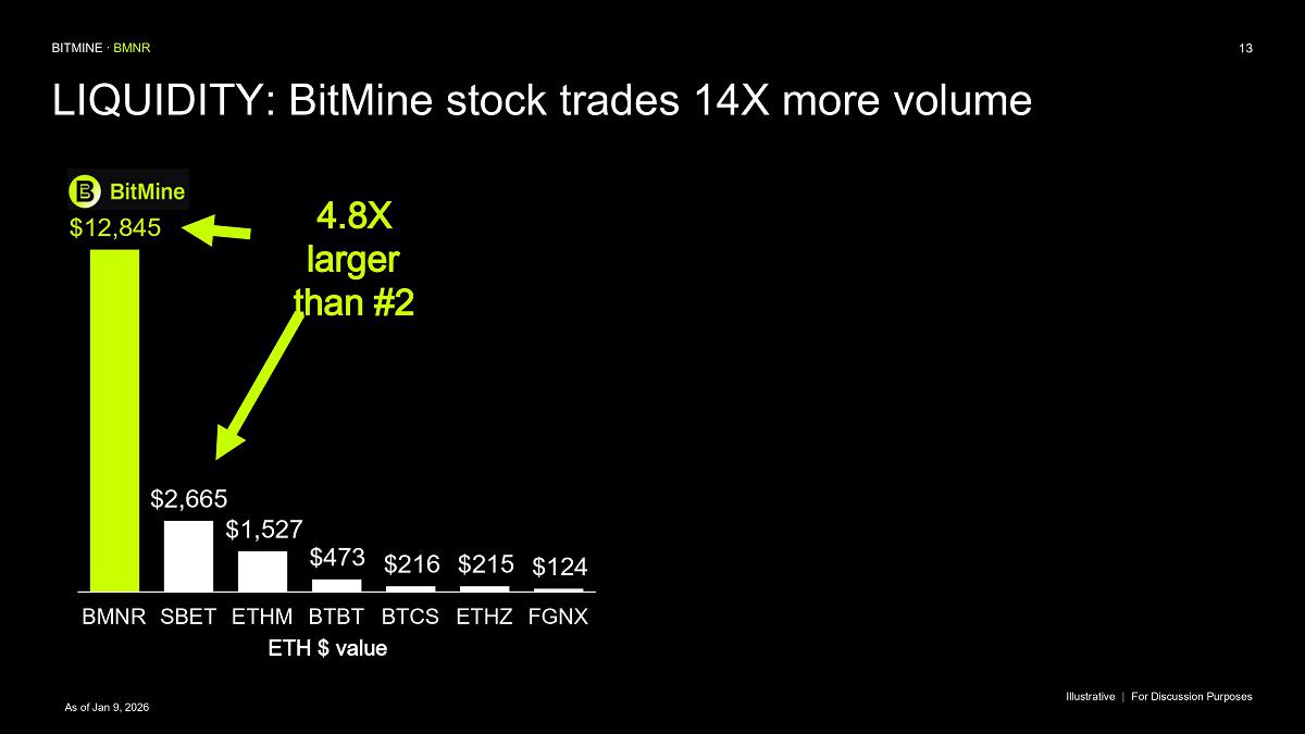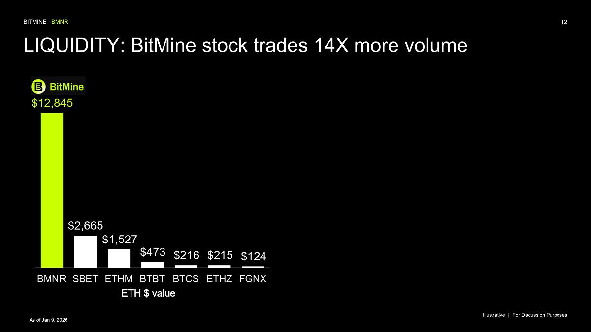 Bitmine (NYSE AMERICAN: BMNR) is the leading Ethereum Treasury company in the world, implementing an innovative digital asset strategy for institutional investors and public market participants. Guided by its philosophy of “the alchemy of 5%,” the company is committed to ETH as its primary treasury reserve asset, leveraging native protocol-level activities including staking and decentralized finance mechanisms. The company will launch MAVAN (Made-in America Validator Network), a dedicated staking infrastructure for Bitmine assets, in Q1 of 2026.