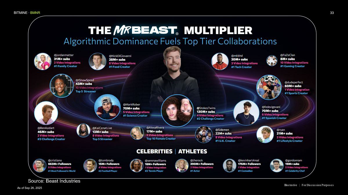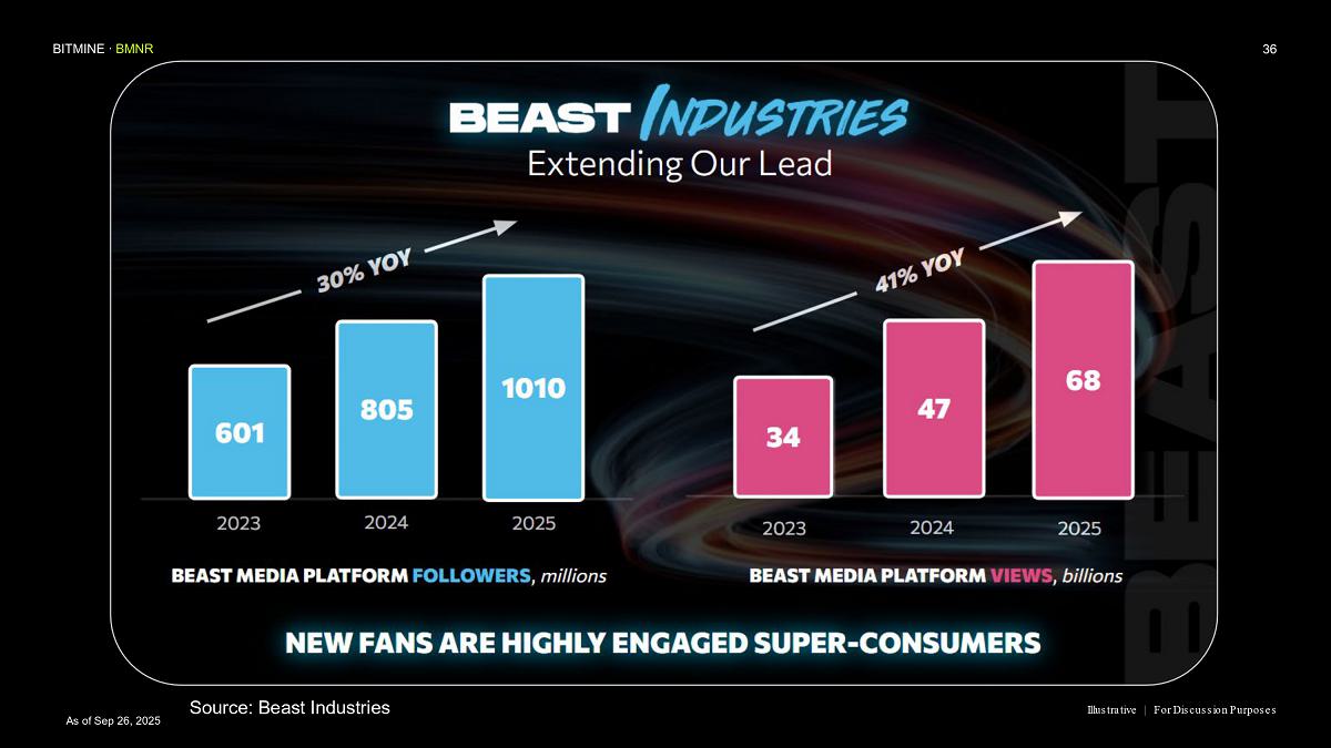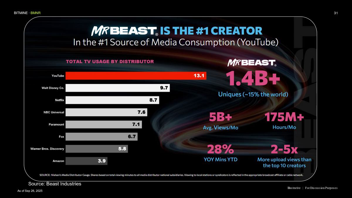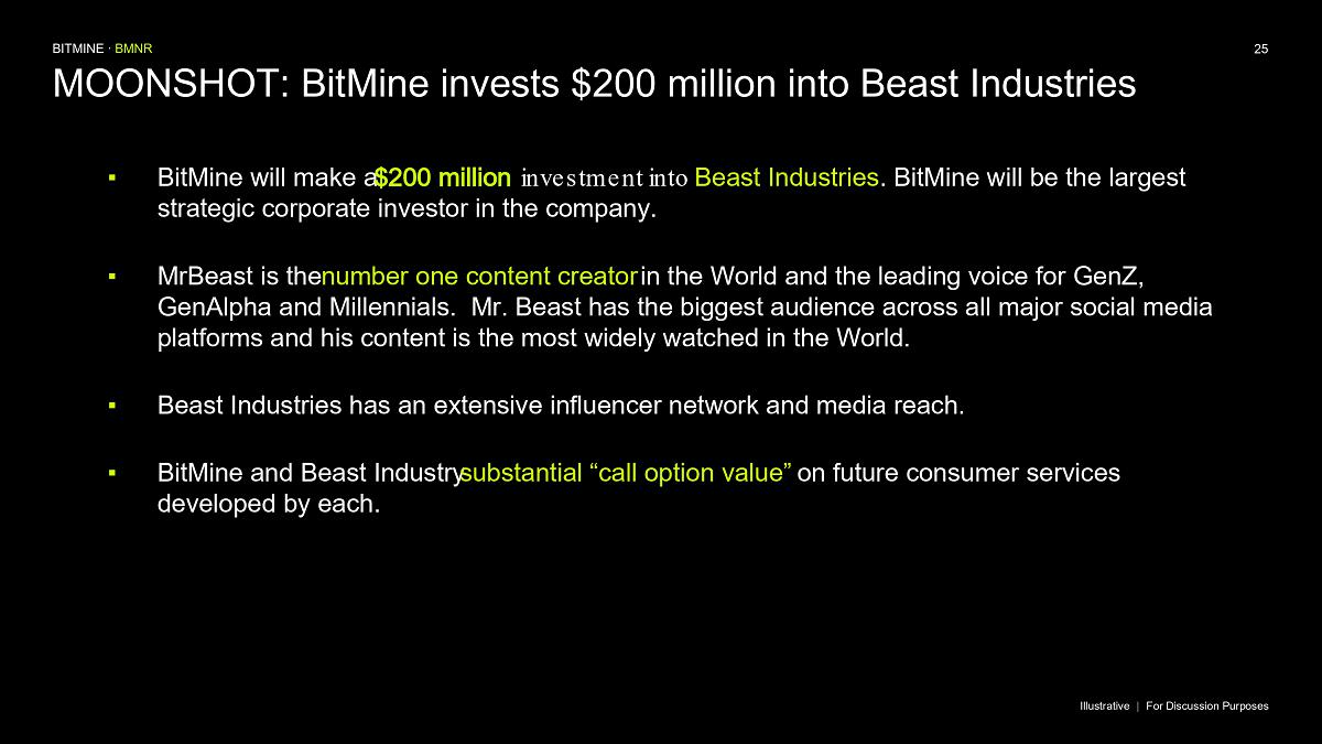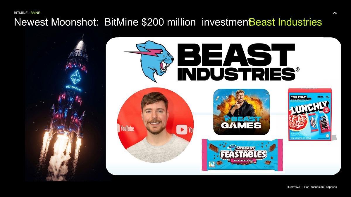 “MrBeast and Beast Industries, in our view, is the leading content creator of our generation, with a reach and engagement unmatched with GenZ, GenAlpha and Millennials,” said Thomas ‘Tom’ Lee, Chairman of Bitmine. “Beast Industries is the largest and most innovative creator based platform in the world and our corporate and personal values are strongly aligned.”
