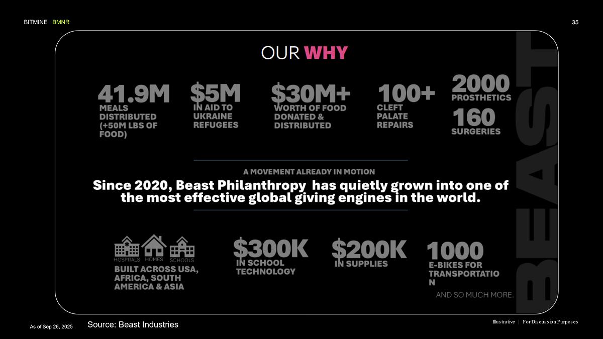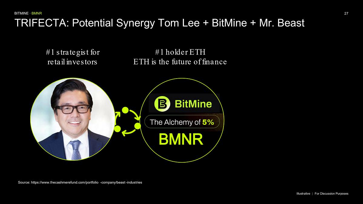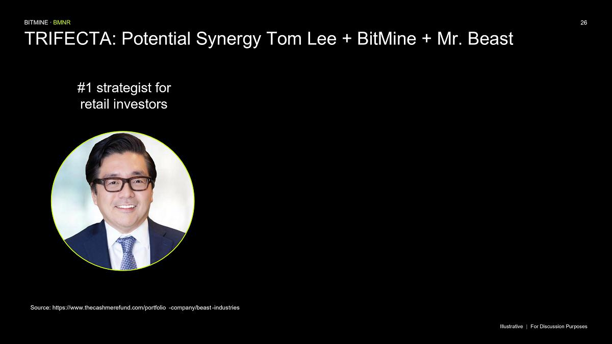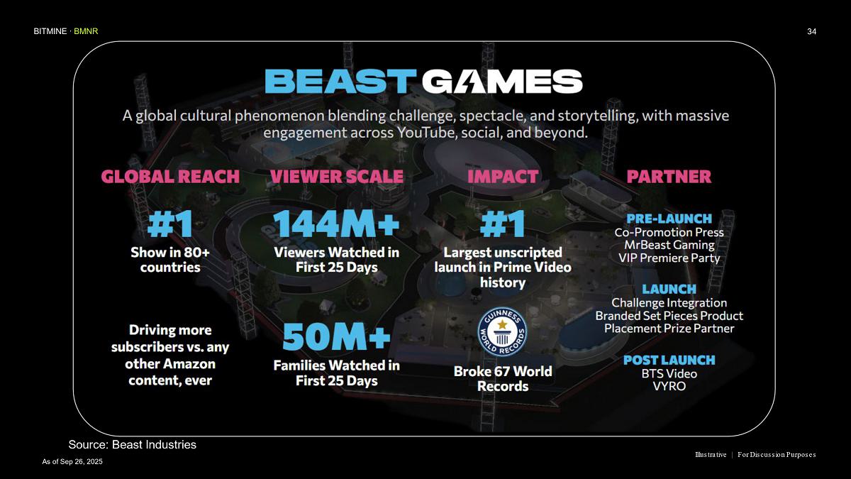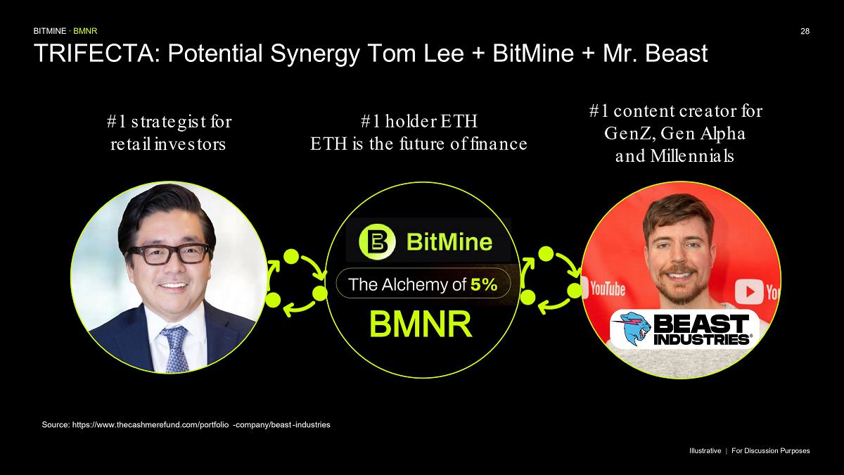 “MrBeast and Beast Industries, in our view, is the leading content creator of our generation, with a reach and engagement unmatched with GenZ, GenAlpha and Millennials,” said Thomas ‘Tom’ Lee, Chairman of Bitmine. “Beast Industries is the largest and most innovative creator based platform in the world and our corporate and personal values are strongly aligned.”