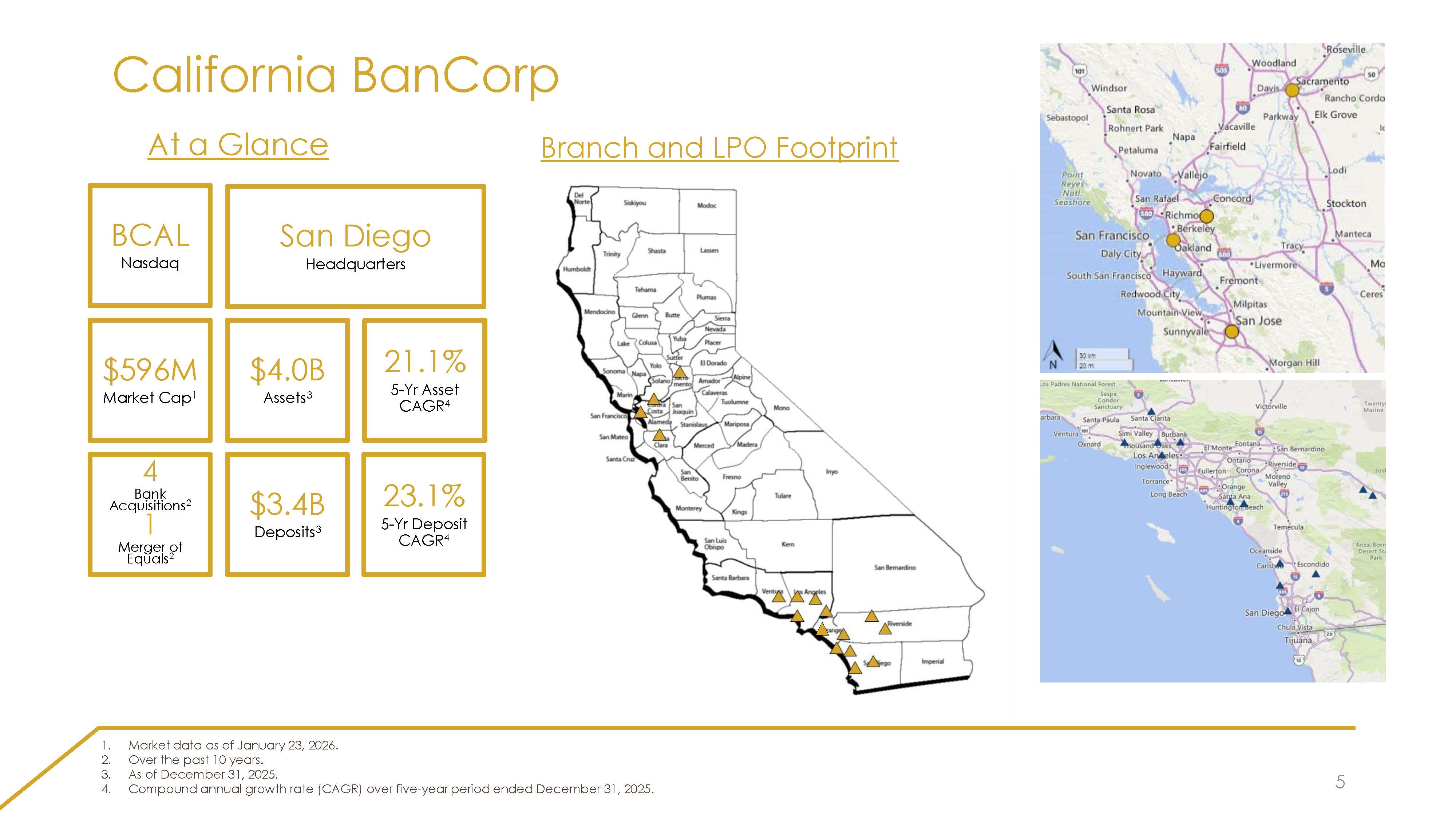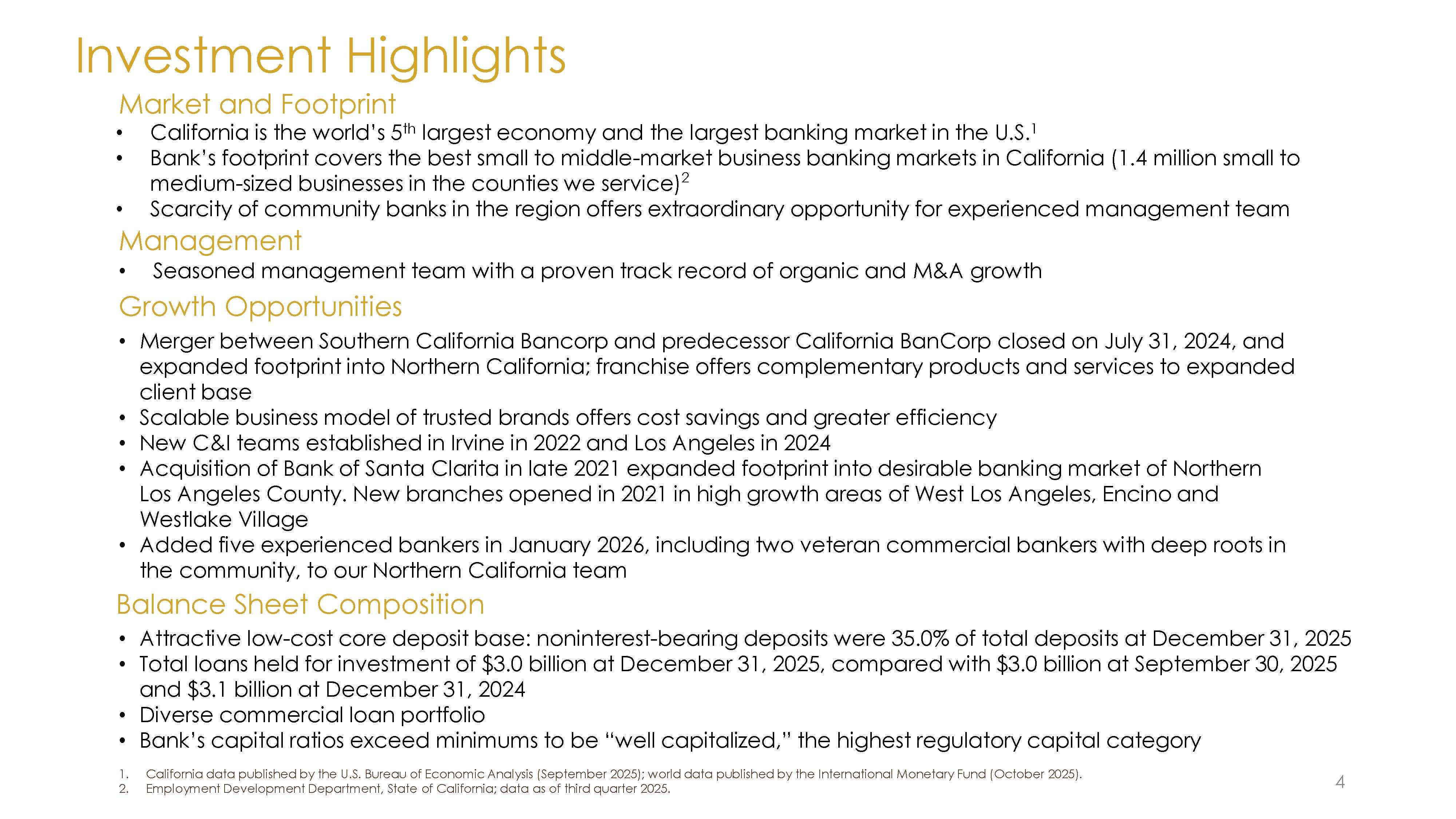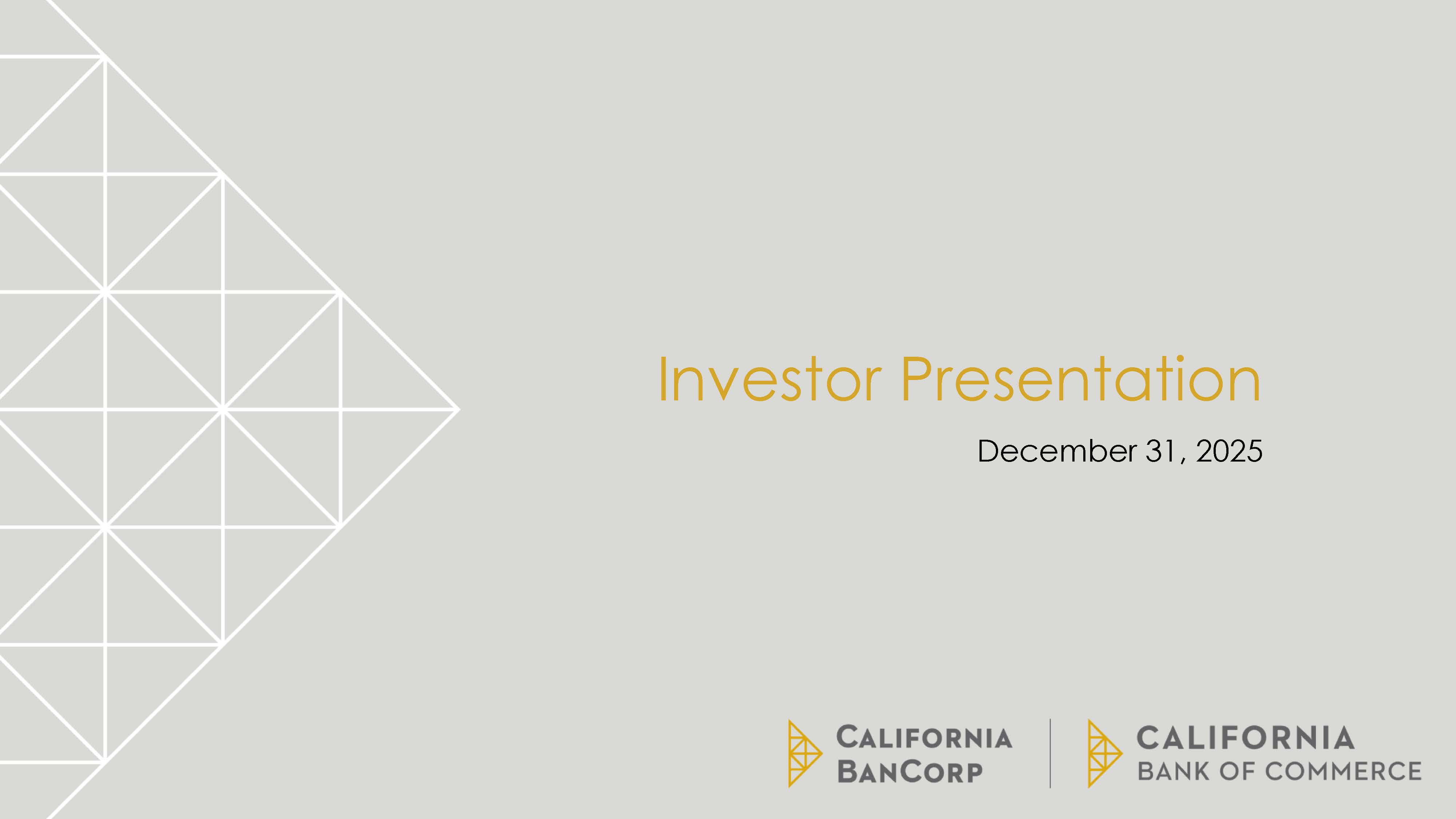 カリフォルニア州サンディエゴ、2026年1月28日 – カリフォルニア・バンク・オブ・コマース、N.A.(以下「銀行」)の持株会社であるカリフォルニア・バンコープ(以下「当社」)(NASDAQ: BCAL)は、2025年第4四半期および通期の連結財務結果を発表しました。