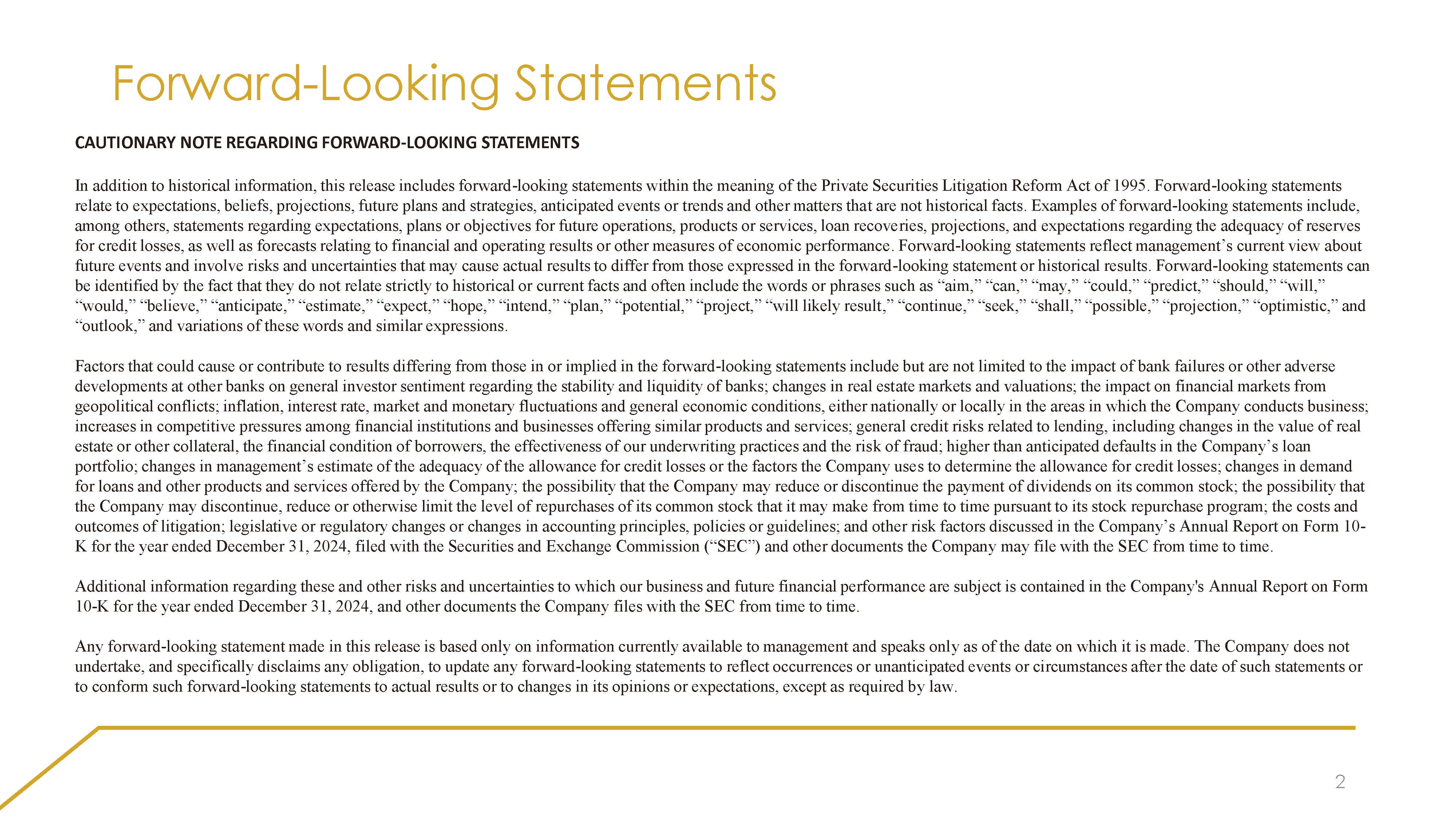 2025年第4四半期の純金利収益は4,290万ドルであり、前四半期の4,250万ドルから増加した。純金利収益の増加は主に、総金利費用が140万ドル減少したことによるものであり、2025年第4四半期における総金利・配当収入が前四半期比で100万ドル減少したことが一部相殺された。 2025年第4四半期において、貸出金利息収益は130万ドル減少した。これには、取得貸出金の純購入会計割引額からの償却益64万ドルの減少が含まれる。一方で、債務証券収益総額の25万7千ドル増加、および他金融機関からの利息・配当収益3万1千ドルの増加により一部相殺された。 利息収益の増加は主に、他金融機関預金の平均残高が6,310万ドル、債務証券総額の平均残高が2,940万ドル、貸出金総額の平均残高が690万ドルそれぞれ増加したことによるものであり、連邦準備銀行資金の売却・再販売契約の平均残高が270万ドル減少したことで一部相殺された。 2025年第4四半期の利息費用減少は主に、利付預金利息費用の981千ドル減少、 これは、平均有利子預金コストが22ベーシスポイント低下したこと、および主に2025年9月に2,000万ドルの5.00%劣後債を償還したことに関連して借入コスト総額が41万6千ドル減少したことによるものである。ただし、平均有利子預金が4,270万ドル増加したことで一部相殺された。