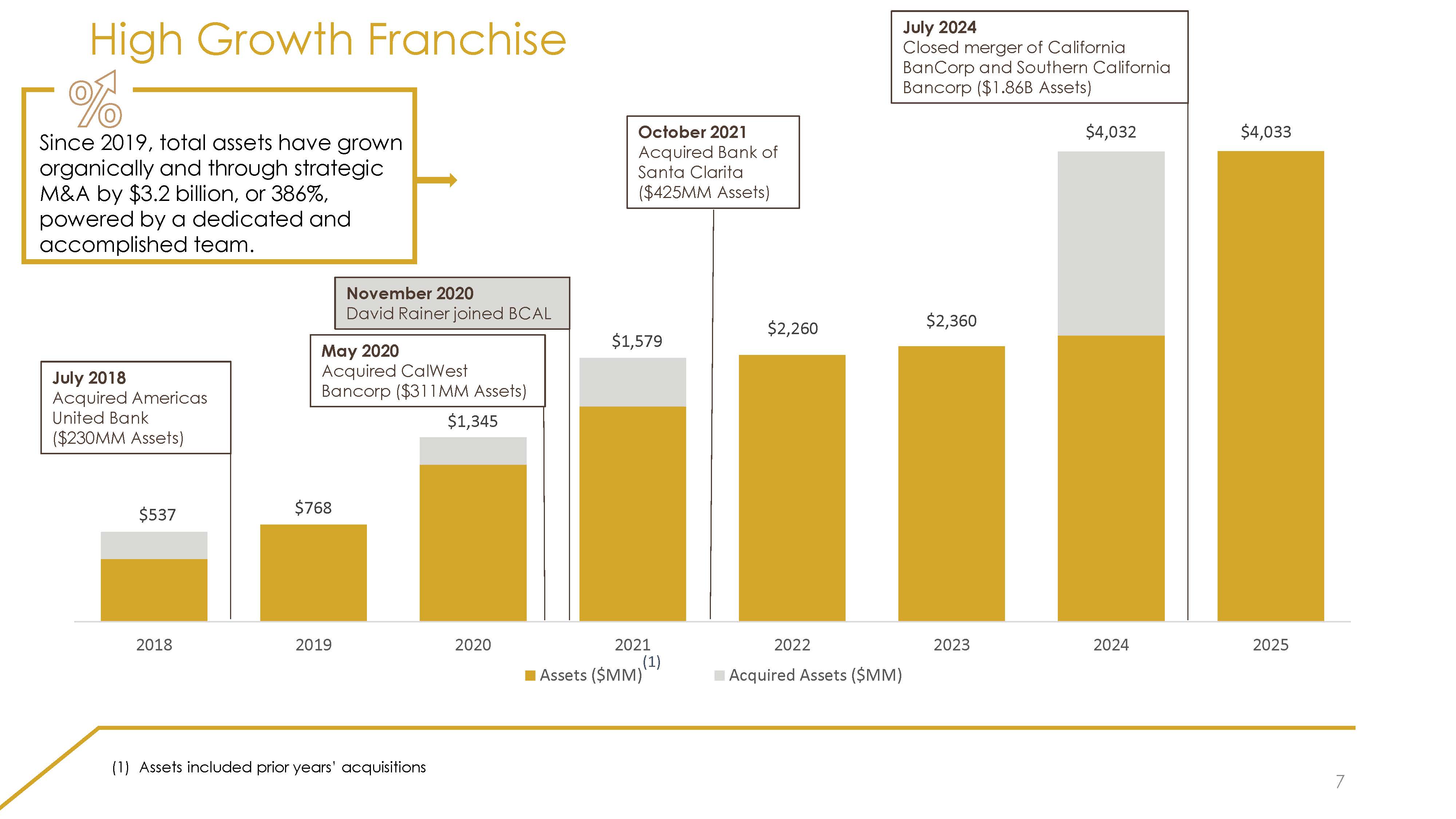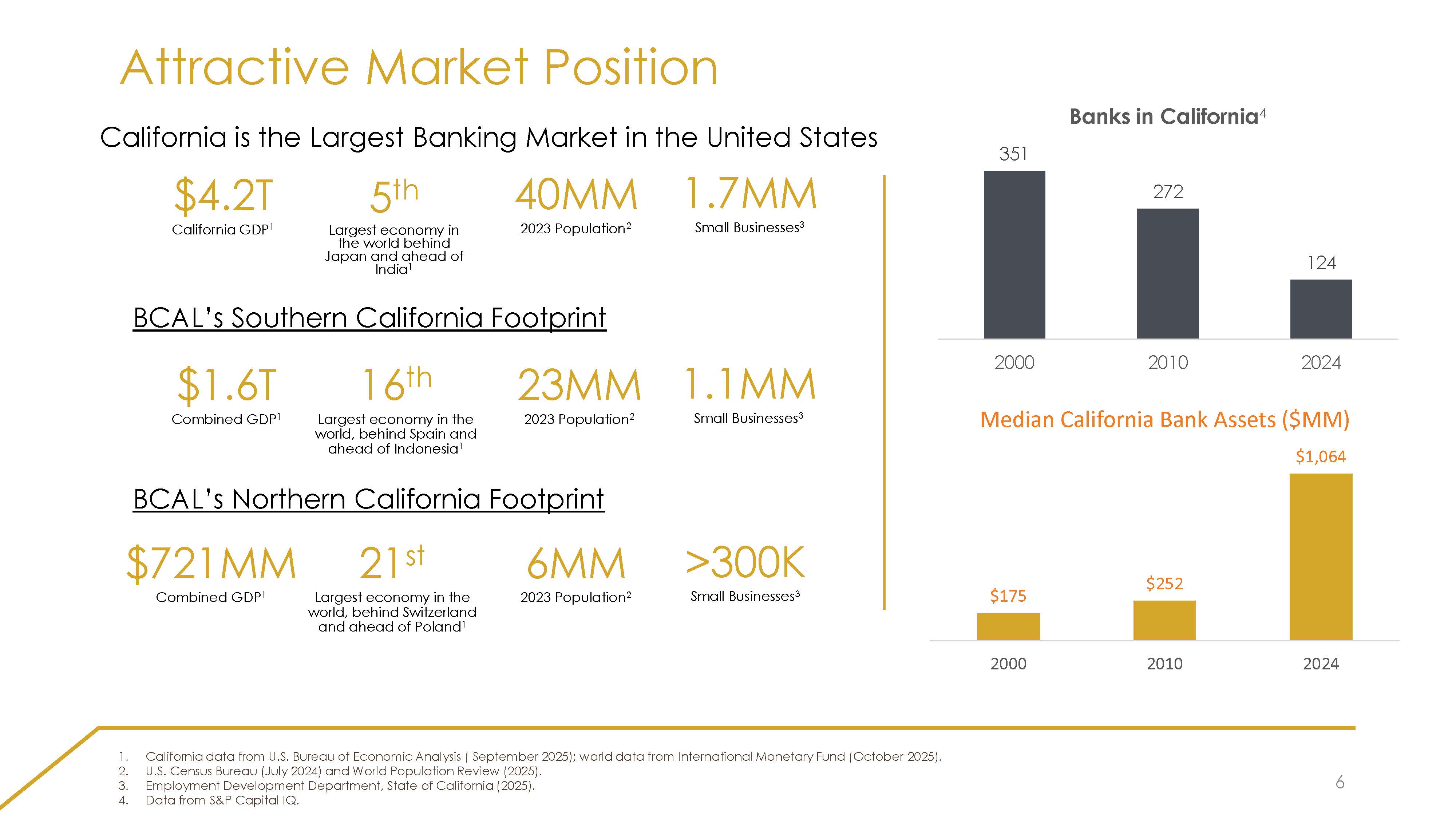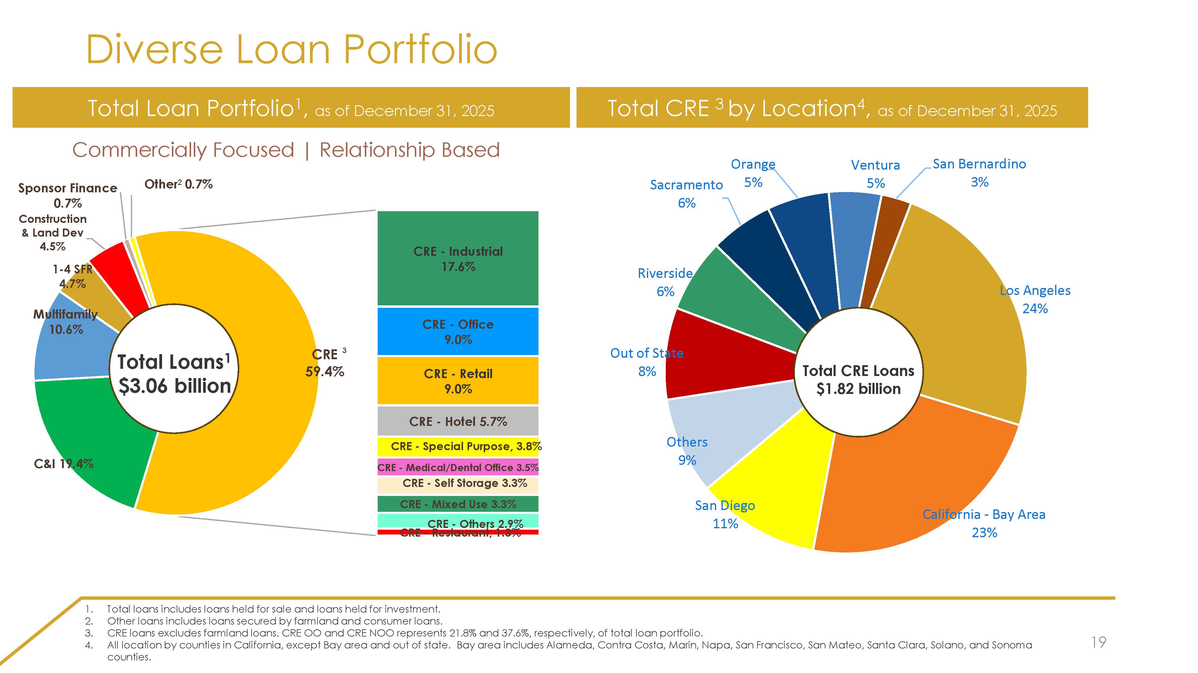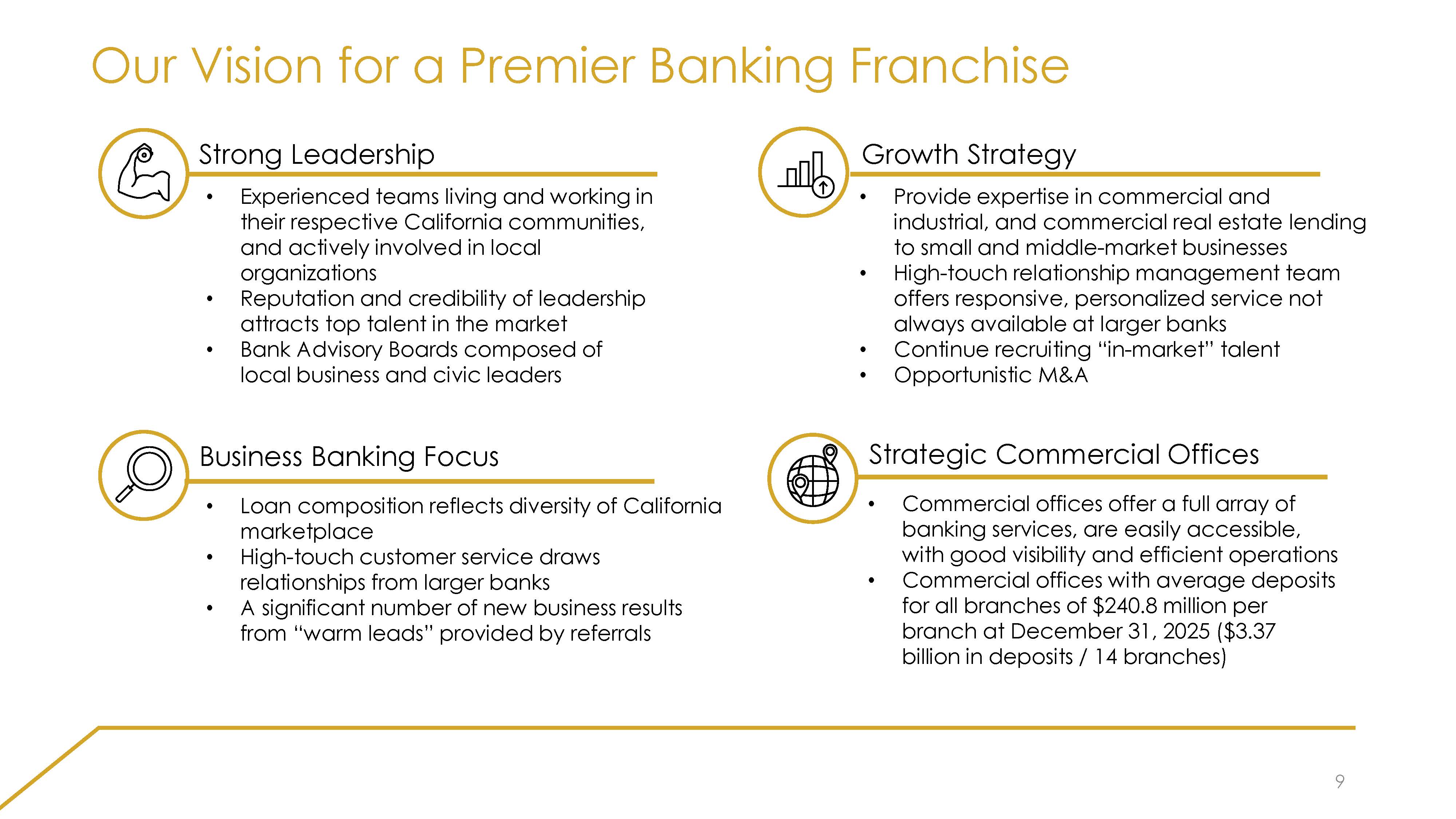 最近のM&A活動により、当社のような高付加価値サービスモデルを中小規模企業に提供する関係性重視の商業銀行はさらに希少となりました。変革の年を経て獲得した勢いと、州内、ひいては国内でも最高峰の市場を網羅する事業基盤を背景に、当社の事業には非常に明るい未来が待っていると確信しています。 今週初めに報告した通り、北カリフォルニアチームには地域に深いルーツを持つベテラン商業銀行家2名を含む、経験豊富な銀行家5名を加えました。当社は成長に向けた態勢が整っており、M&Aによる地域商業銀行市場の変化を捉える準備も万全です。今後もサービス提供全市場において、ハイレベルな人材の積極的な採用を継続してまいります。」