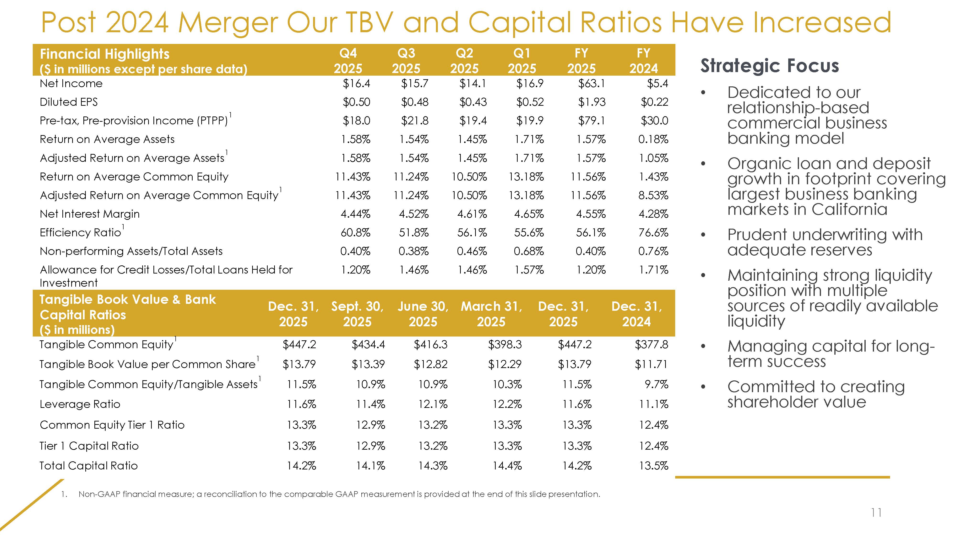 2025年12月31日現在の1株当たり有形簿価(TBV)(非GAAP基準1)は13.79ドルで、2024年12月31日時点の11.71ドルから2.08ドル増加した。