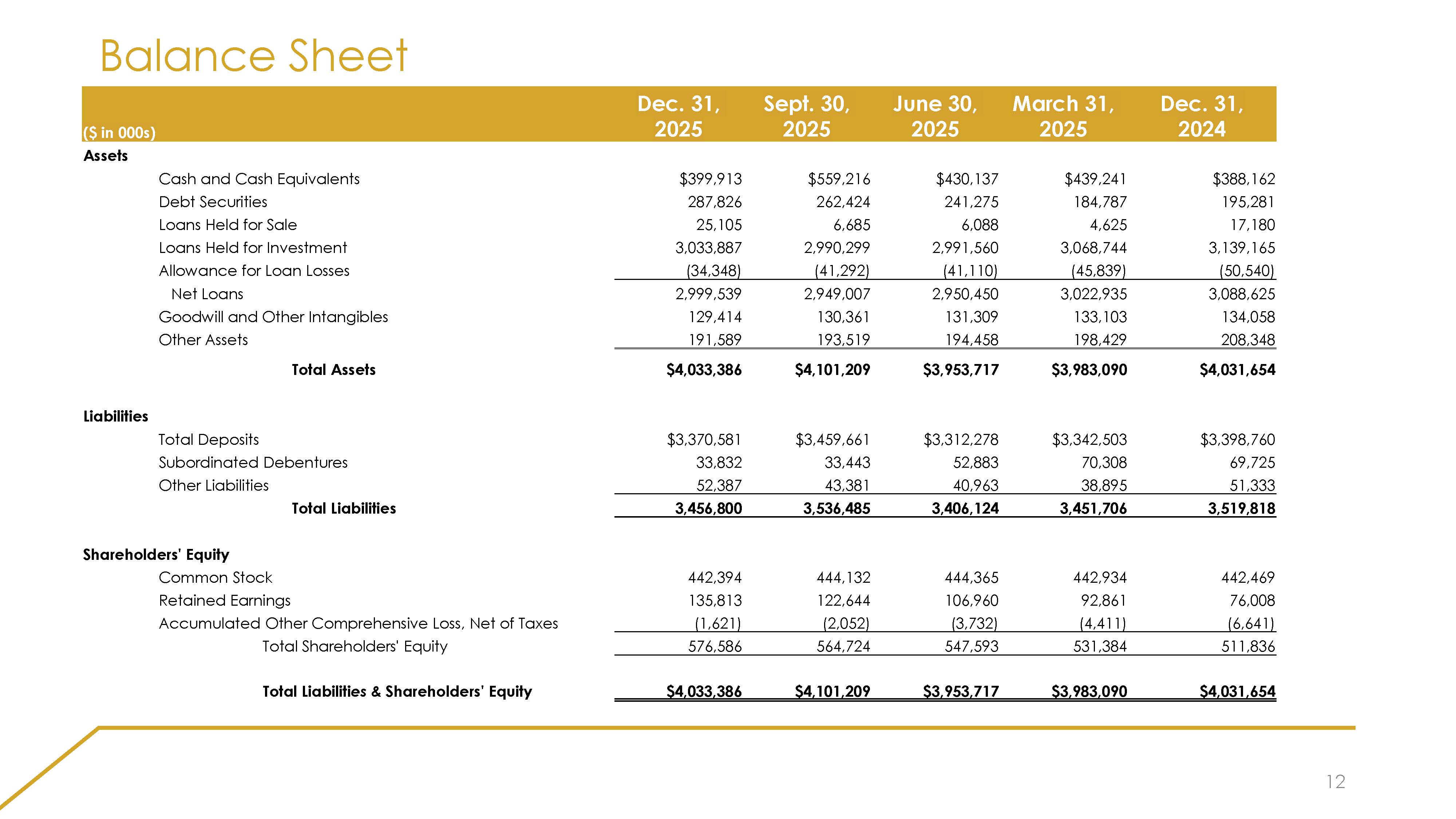 2025年12月31日現在の預金総額は33億7,000万ドルで、2025年9月30日現在の34億6,000万ドルから8,910万ドル(2.6%)減少した。無利息預金は預金総額の35.0%を占め、2025年9月30日時点の35.8%から減少した。