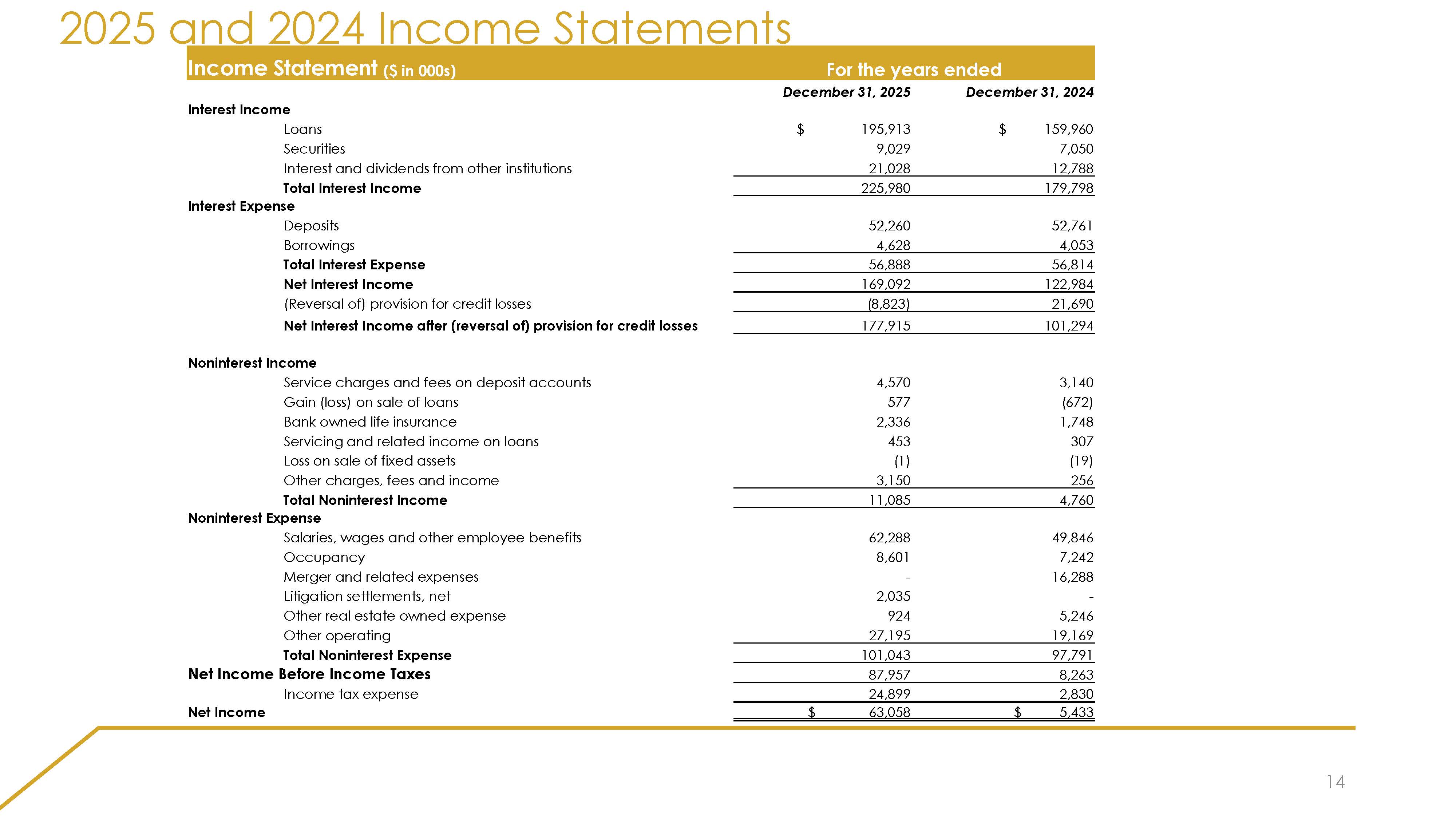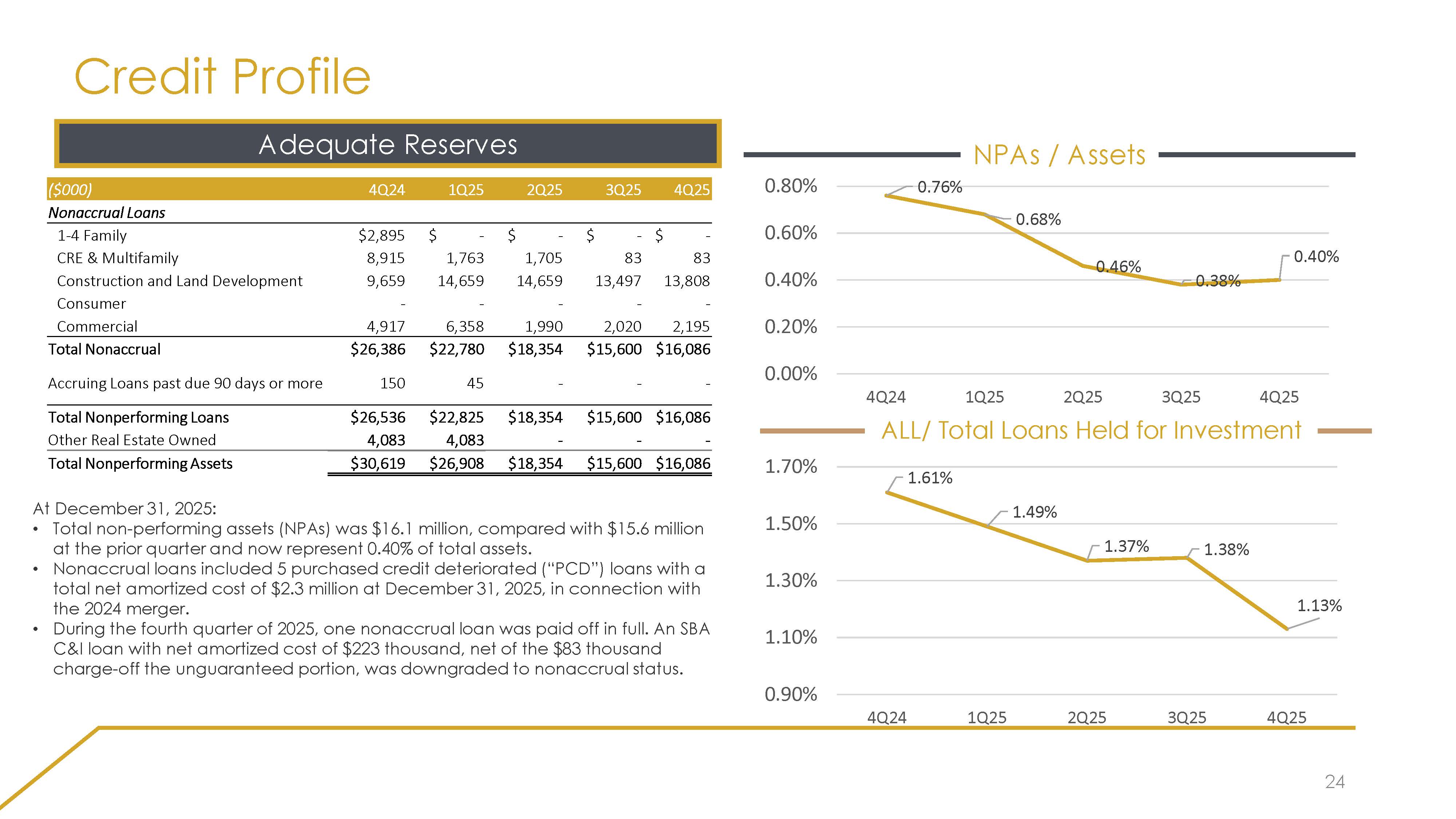 延滞ローン(30~89日延滞、非収益化ローンを除く)は、2025年12月31日時点で1,470万ドルとなり、2025年9月30日時点の延滞ローン320万ドルから増加した。 この増加は主に、2025年第4四半期に延滞となった800万ドルの多世帯住宅ローン、580万ドルの商業用不動産ローン、および82万4千ドルの商業・産業用ローンによるものである。 2026年1月、800万ドルの多世帯住宅ローンは全額返済され、580万ドルの商業用不動産ローンは準不良債権に格下げされ、82万4千ドルの商業・産業ローンは延滞状態から解消された。
