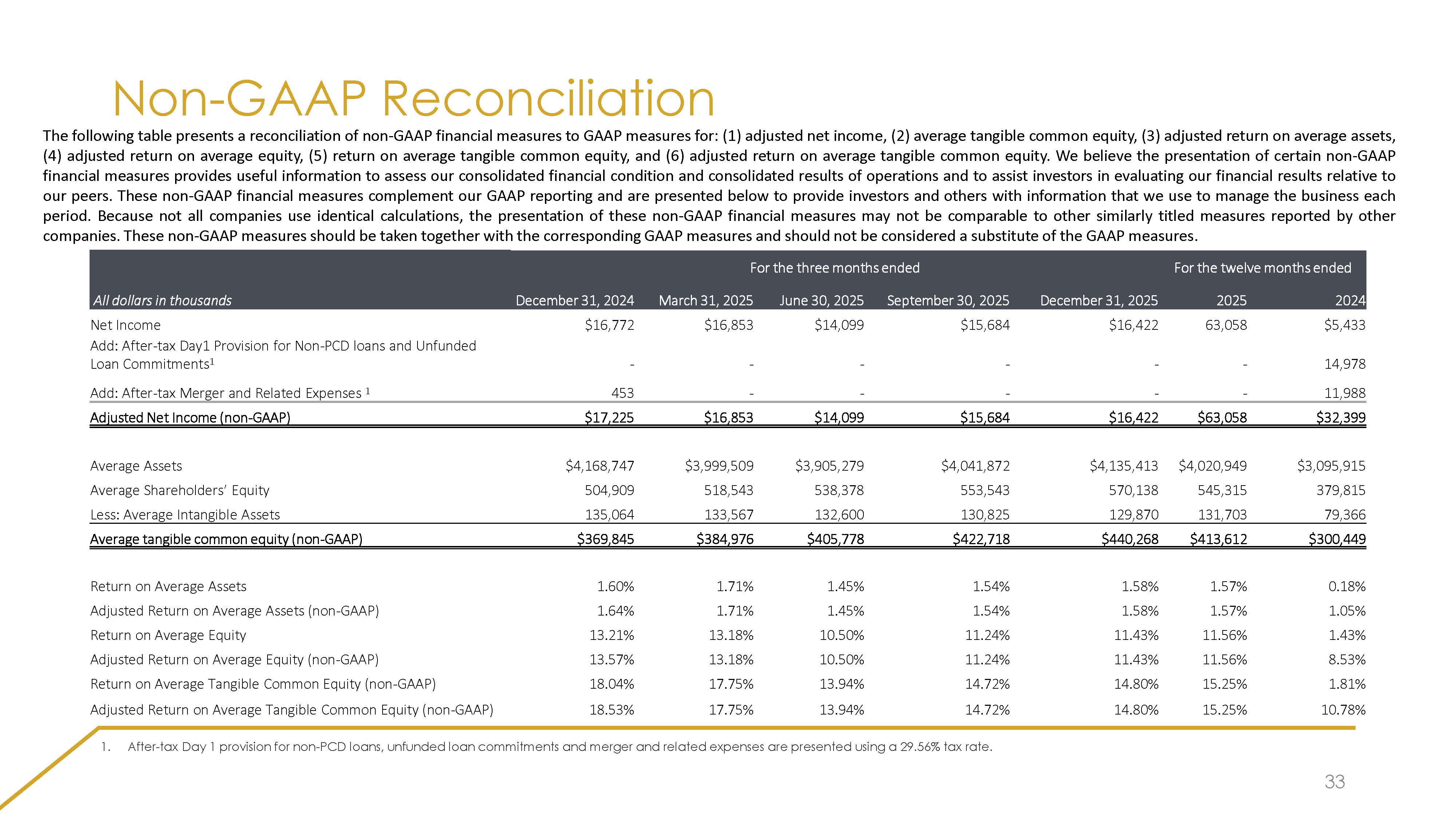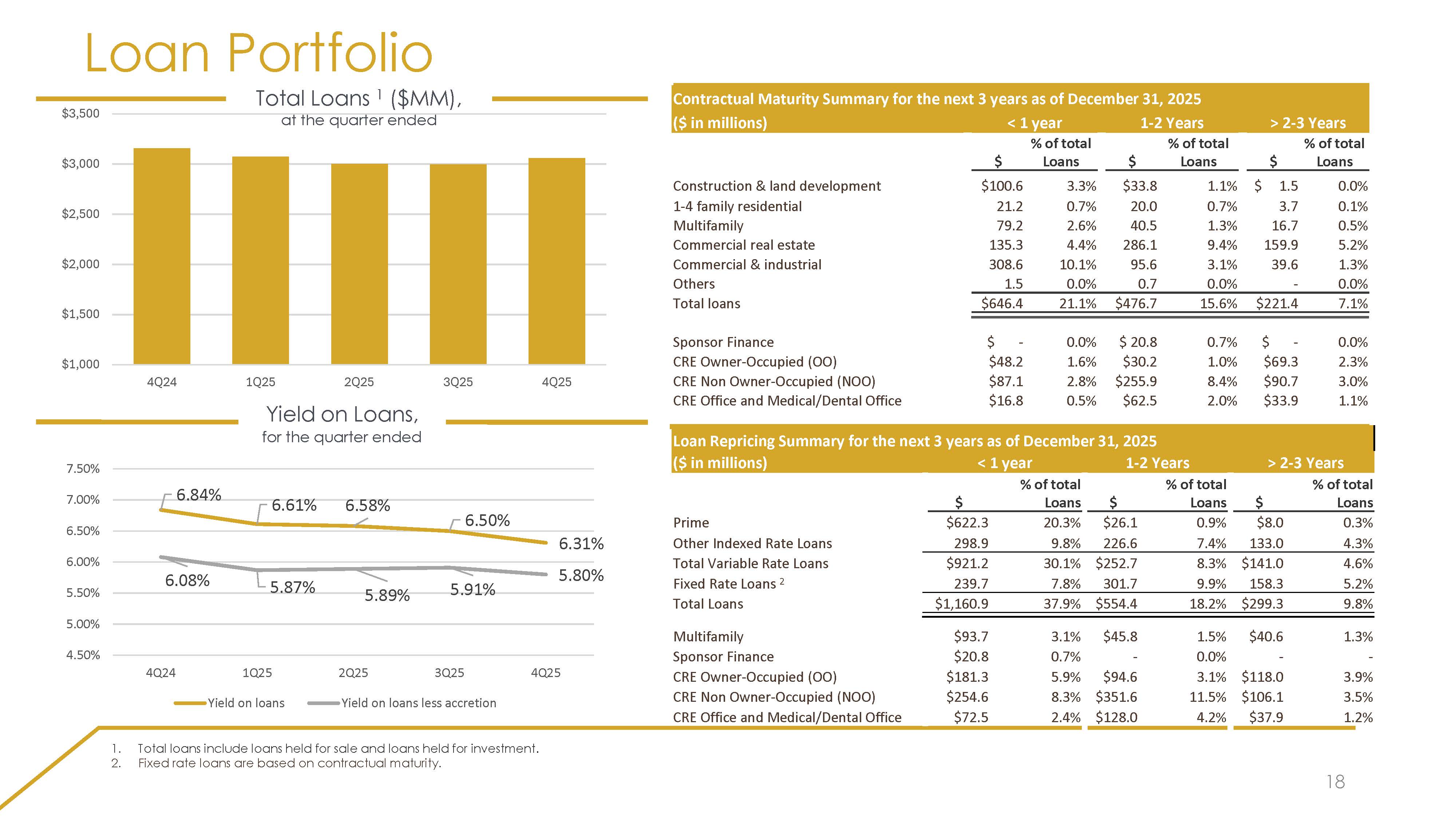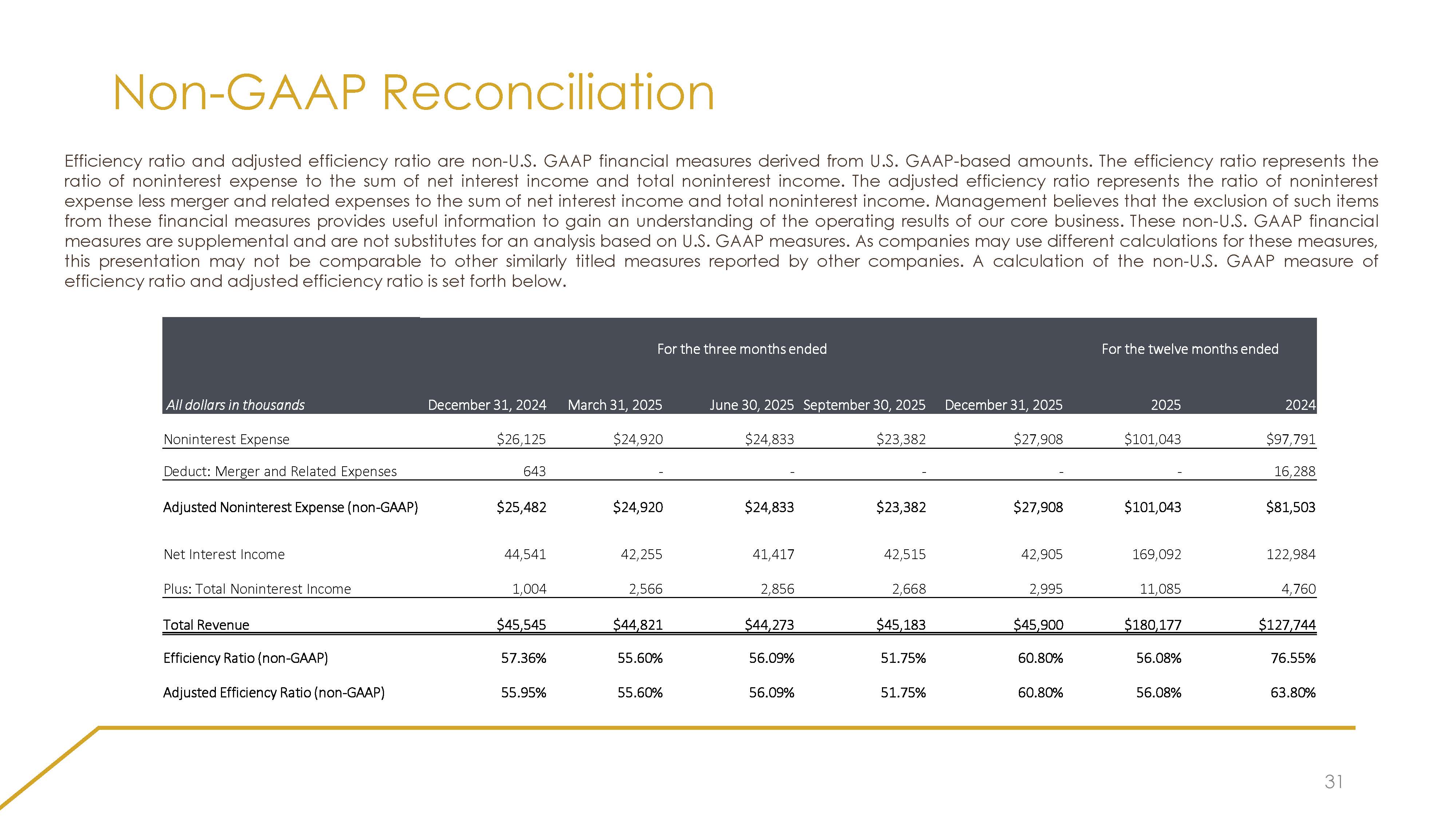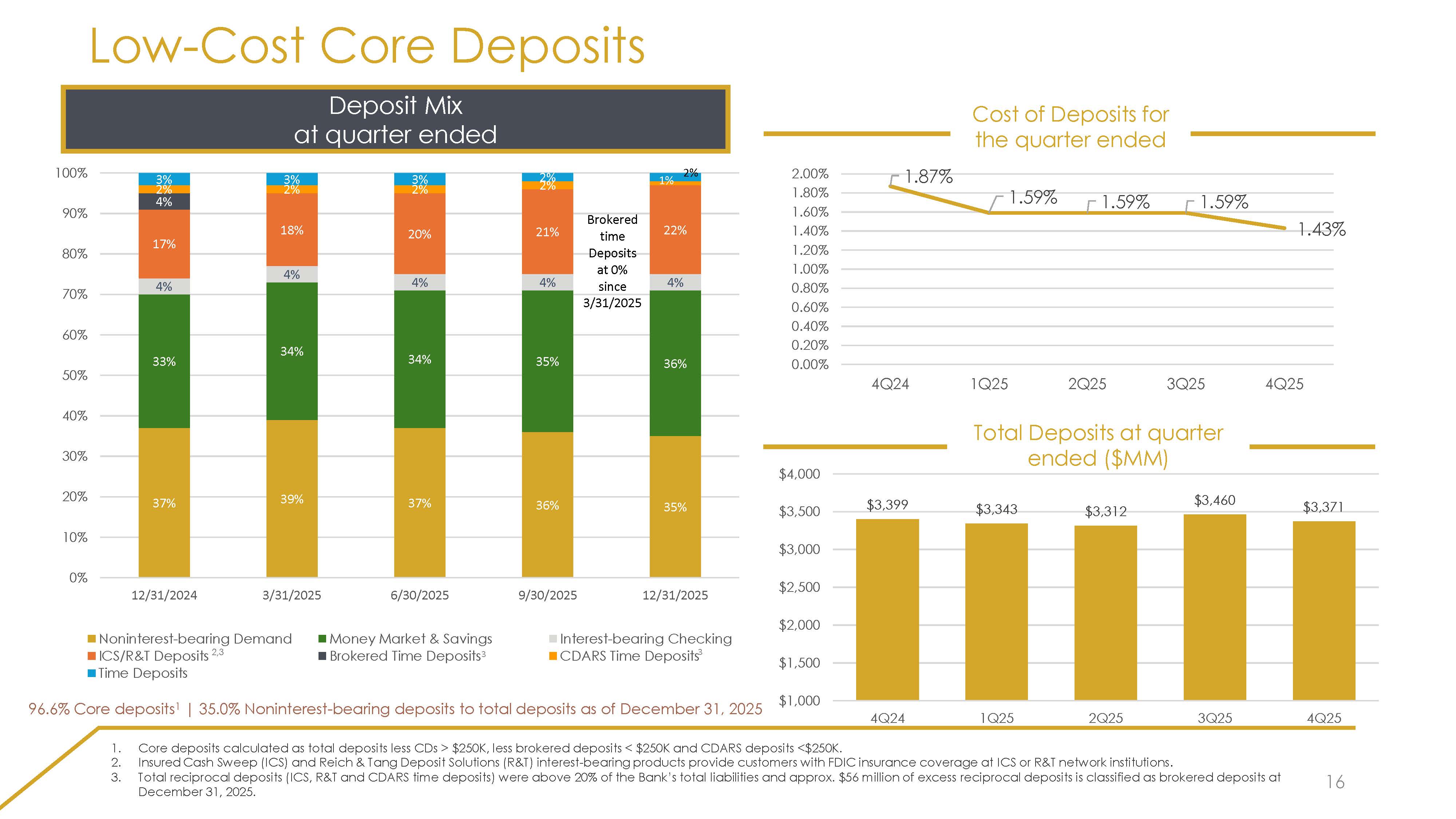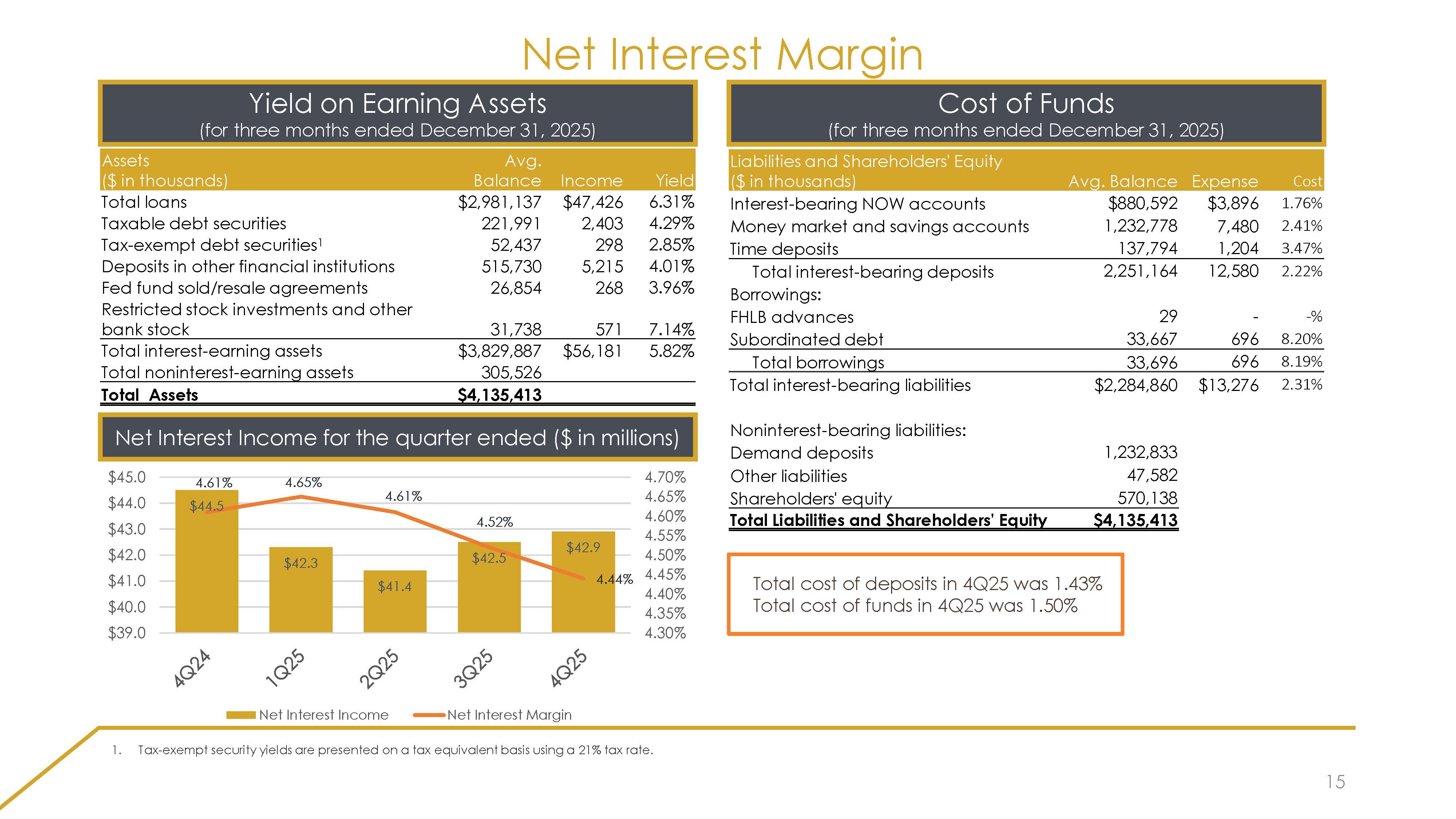 2025年第4四半期の資金調達コストは1.50%で、前四半期の1.69%から19ベーシスポイント低下した。 この減少は主に、総借入コストが14ベーシスポイント低下したことによるものであり、これは主に、2025年9月に2,000万ドルの劣後債を償還したことによる平均総借入額の1,930万ドルの減少と、平均有利子預金コストの22ベーシスポイントの減少が組み合わさった結果である。 取得した劣後債務の買収会計割引による償却費用38万9千ドルが、資金調達コストに4ベーシスポイント寄与した。 平均無利息要求払預金は4,950万ドル増加し12億3,000万ドルとなり、2025年第4四半期の平均預金総額の35.4%を占めました(前四半期は11億8,000万ドル、34.9%)。平均有利子預金は2025年第4四半期に4,270万ドル増加し22億5,000万ドルとなりました。 2025年第4四半期の預金総コストは1.43%となり、前四半期の1.59%から低下しました。有利子預金総コストが22ベーシスポイント低下した主な要因は、当社が2025年第4四半期に継続的に実施した、コストの高いマネーマーケット預金、貯蓄預金、定期預金の返済戦略によるものです。