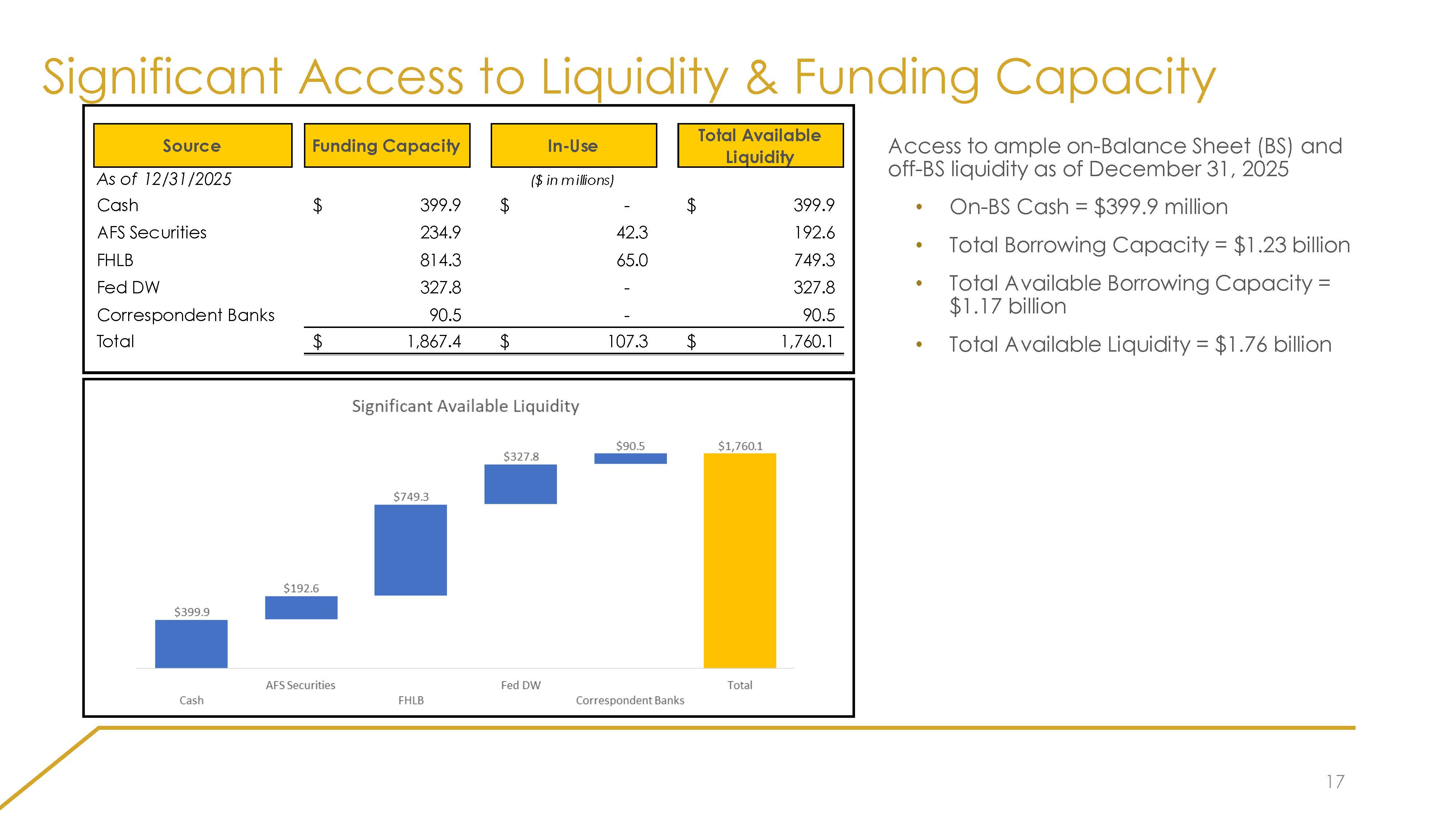 2025年12月31日現在、当社は連邦住宅抵当銀行(FHLB)担保付信用枠から約7億4,930万ドル、連邦準備制度割引窓口から約3億2,780万ドルの借入可能枠を有していた。また、2025年12月31日現在、取引銀行からの無担保信用枠4件から約9,050万ドルの借入可能枠を有していたが、未返済借入金は存在しなかった。 2025年12月31日時点での総借入可能枠は11億7,000万ドルであった。さらに、当社は2025年12月31日時点で、公正価値ベースの担保設定されていない流動性証券を約1億9,260万ドル、現金及び現金同等物を3億9,990万ドル保有していた。
