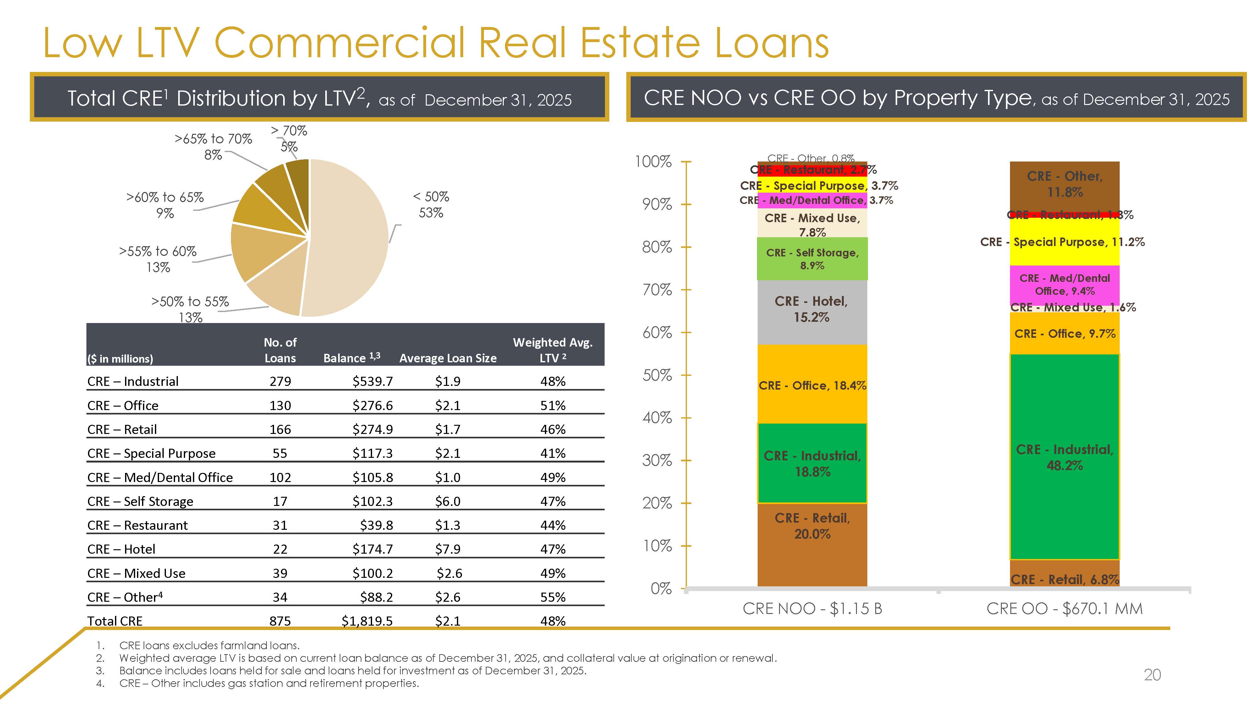 貸倒引当金(ACL)は、2025年12月31日時点で投資目的保有貸出金総額の1.20%であり、2025年9月30日時点の1.46%から減少した。 貸倒引当金(ALL)は、2025年12月31日時点で投資目的保有貸付総額の1.13%であり、2025年9月30日時点の1.38%から減少した。
