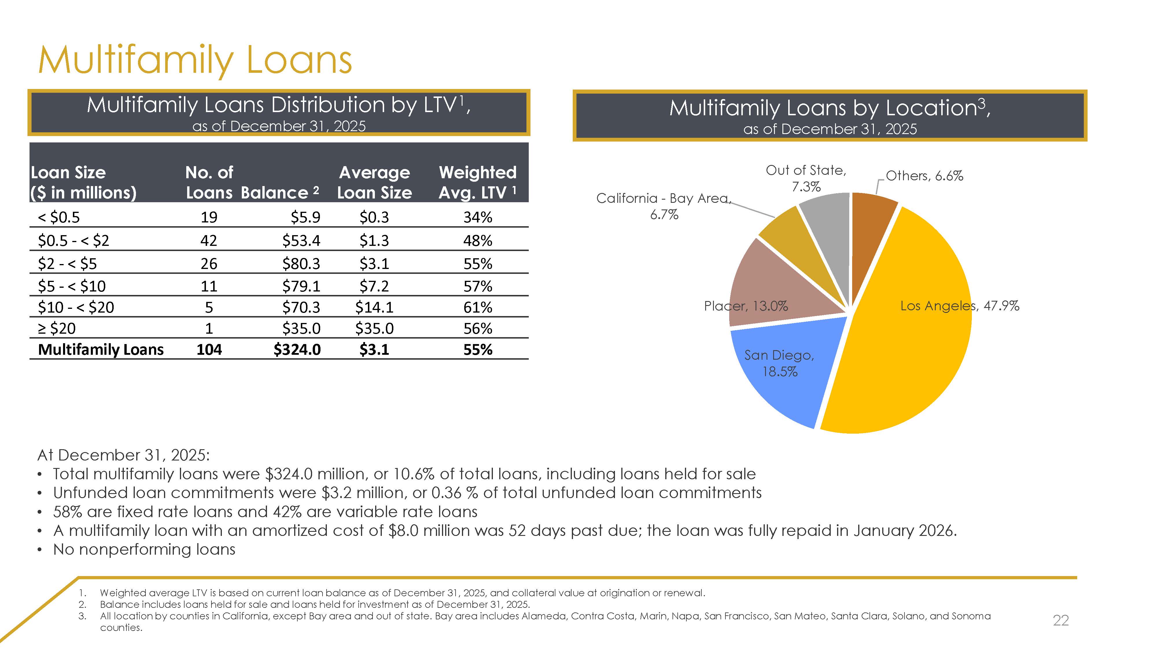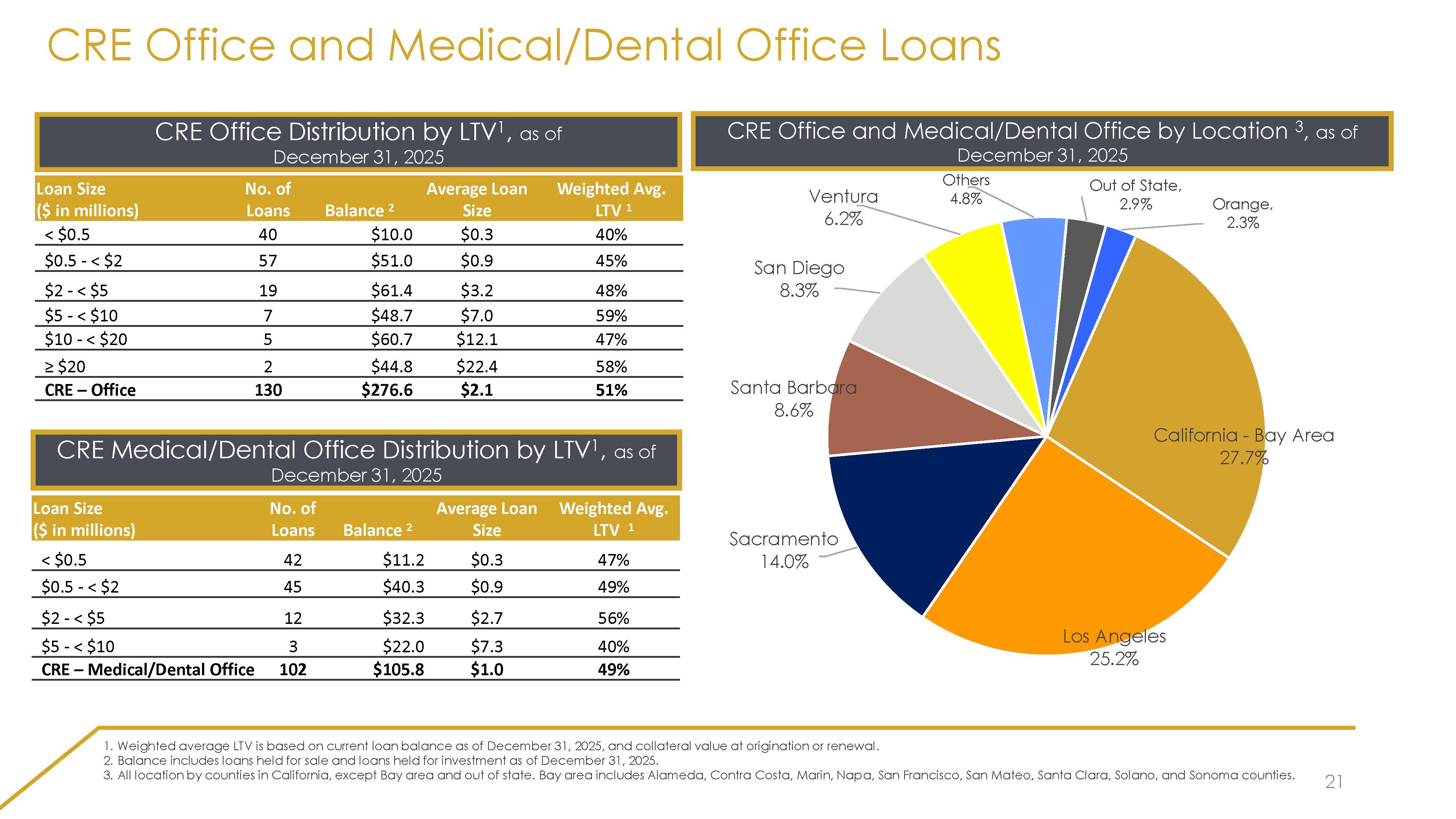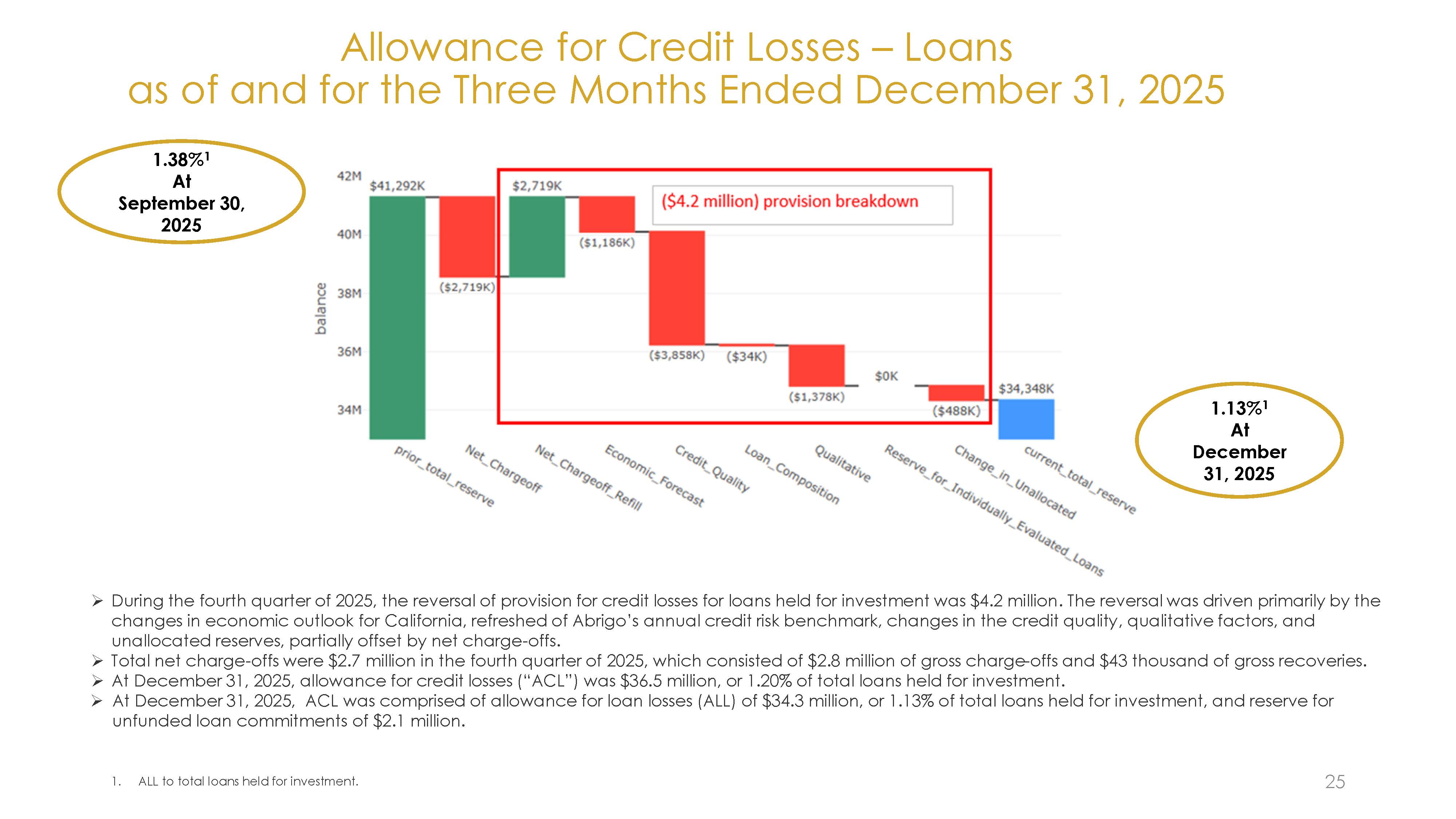 2025年第4四半期の投資目的貸付金に対する貸倒引当金は420万ドルの戻入となり、前四半期の貸倒引当金22万1千ドルから440万ドル減少した。 この減少は主に、特別注意貸付金および準不良貸付金の減少、主にカリフォルニア州の経済見通しに関連する合理的かつ裏付けのある予測の変更、ならびに定性的要因の変化によるものです。当社の経営陣は、金利変動や景気後退懸念に関連するマクロ経済変数を継続的に監視しており、現在の環境に対して適切な引当金を計上していると考えています。