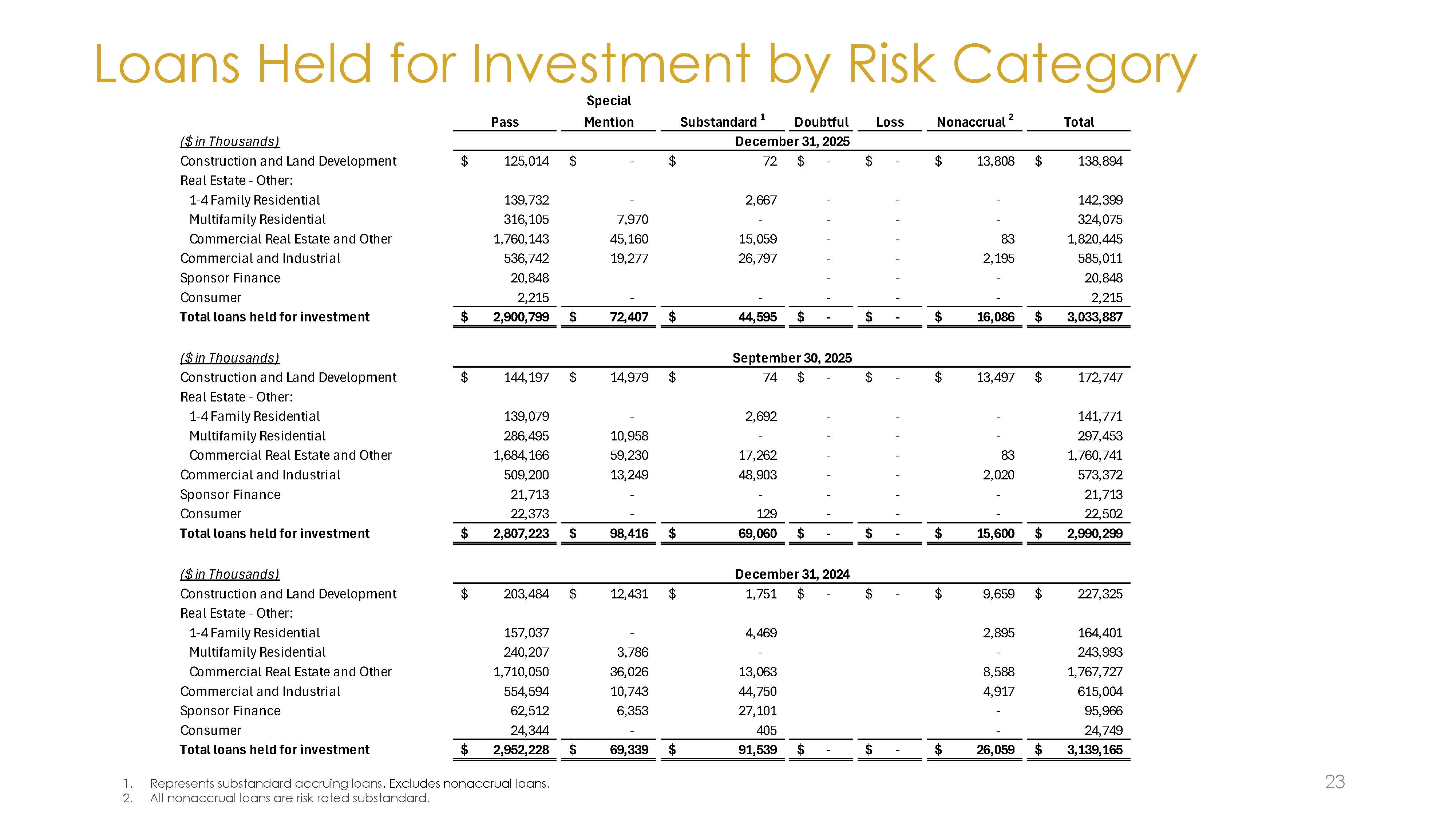 不良債権総額の増加は、主に以下の要因によるものである。SBA保証付き商業・産業ローン223千ドルの格下げ(保証対象外の83千ドルの貸倒償却を差し引いた額)、ならびに既存不良債権残高の302千ドルの純増額。これに対し、2025年第4四半期に別の商業・産業ローン39千ドルの全額貸倒償却が一部相殺した。