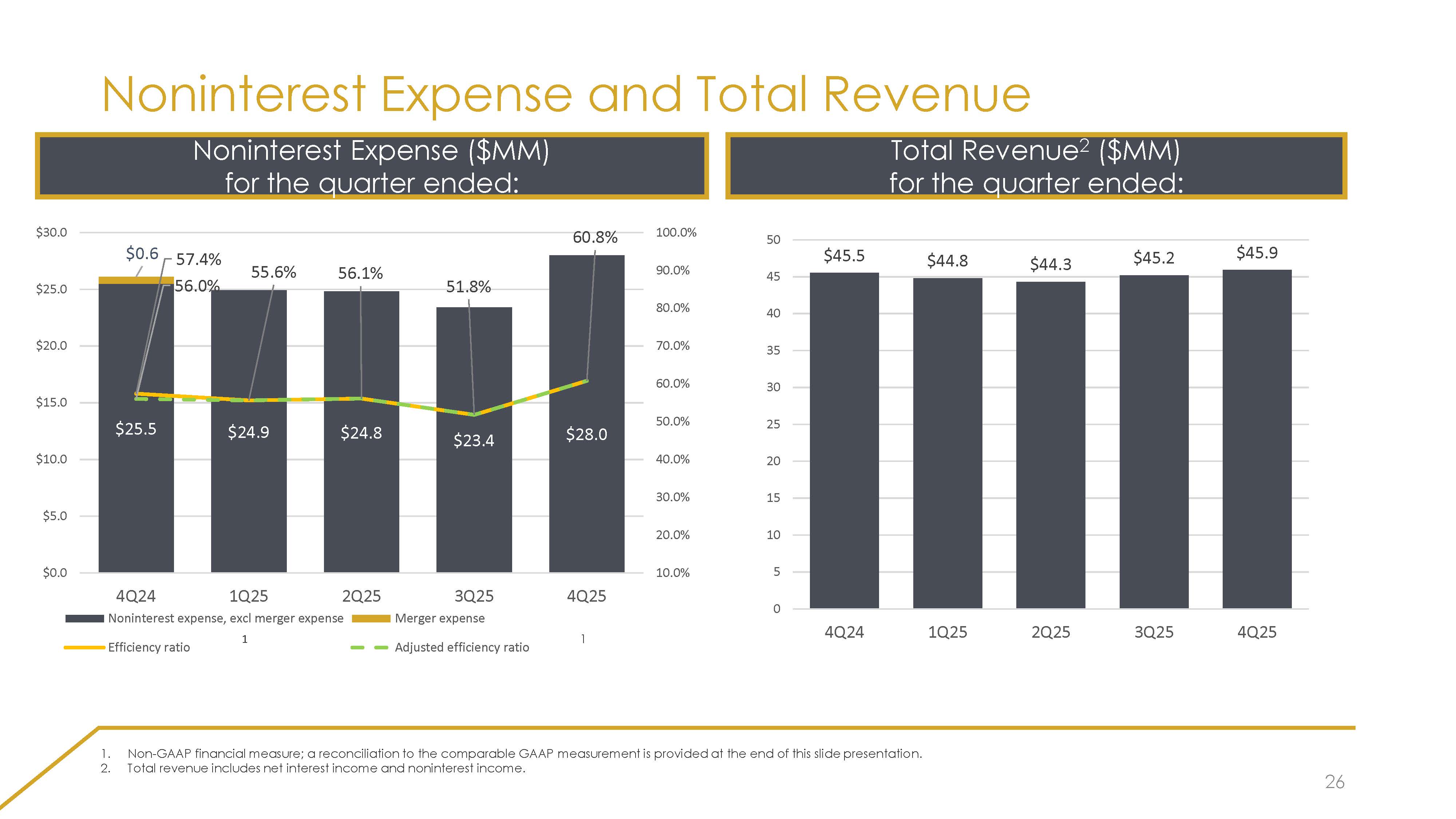 2025年第4四半期の効率性比率(非GAAP基準1)は60.80%であり、前四半期の51.75%から上昇した。退職金費用および訴訟和解金純額を除外した場合、2025年第4四半期の効率性比率(非GAAP基準1)は52.72%となる見込みである。