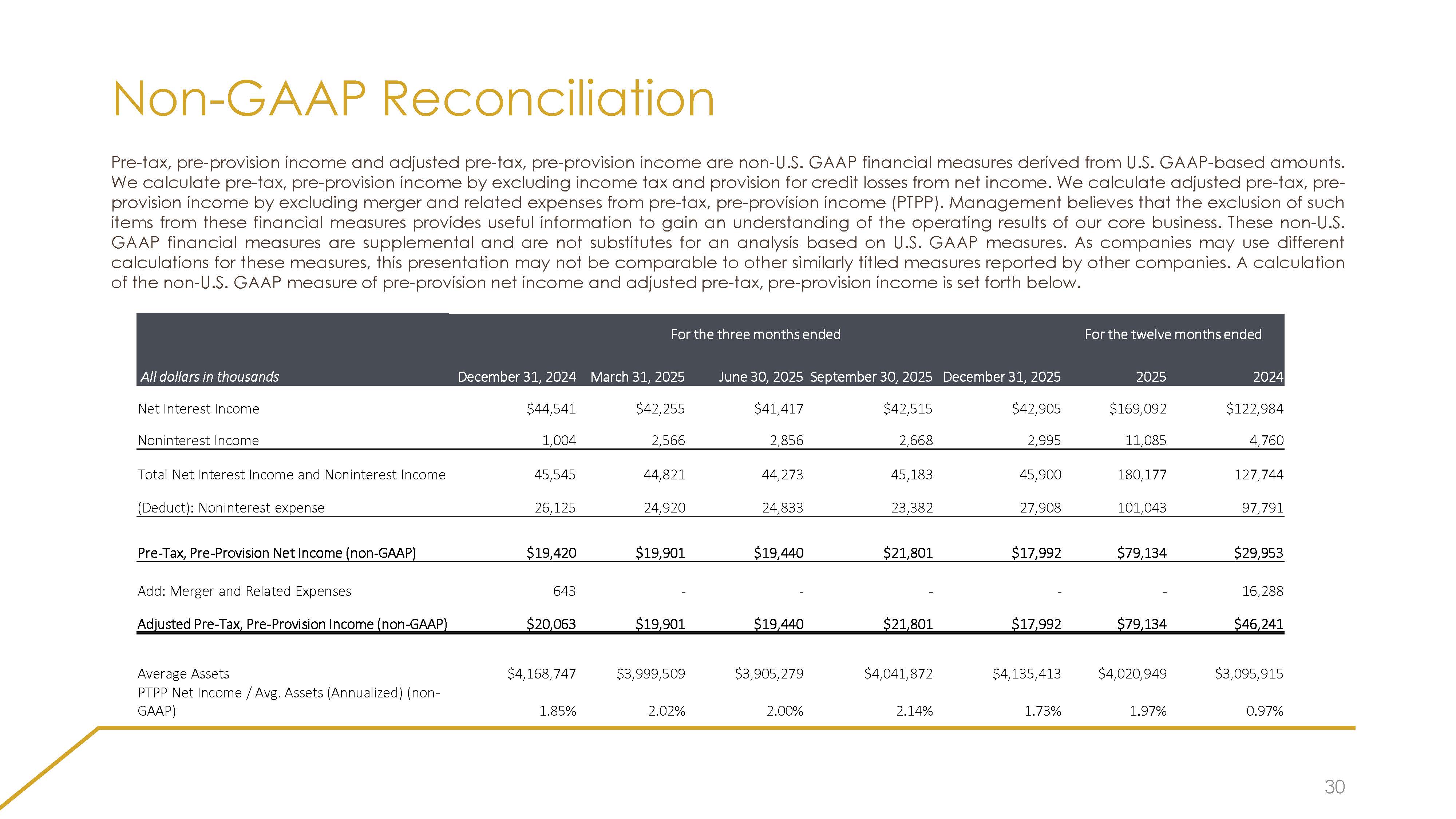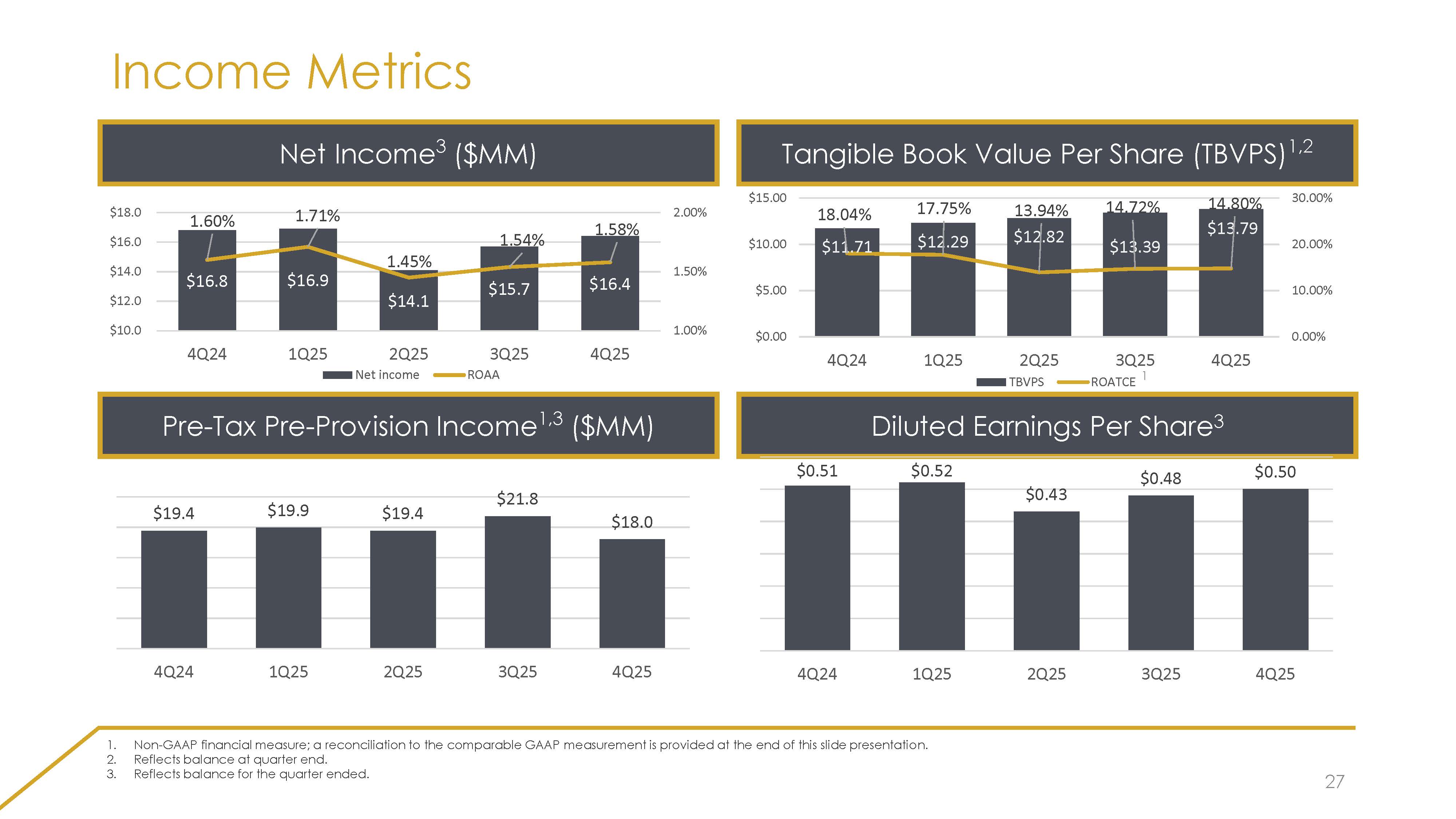 2025年第4四半期の純利益は1,640万ドル(希薄化後1株当たり0.50ドル)であり、2025年第3四半期の1,570万ドル(希薄化後1株当たり0.48ドル)から増加した。 第4四半期の税引前・引当金繰入前利益(非GAAP基準1)は1,800万ドルで、前四半期比380万ドルの減少となった。純利益および希薄化後1株当たり利益の増加は、主に貸倒引当金の戻入後の純金利収益および非金利収益の増加によるものであり、主に一時的な退職費用および訴訟和解に関連する非金利費用の増加によって一部相殺された。