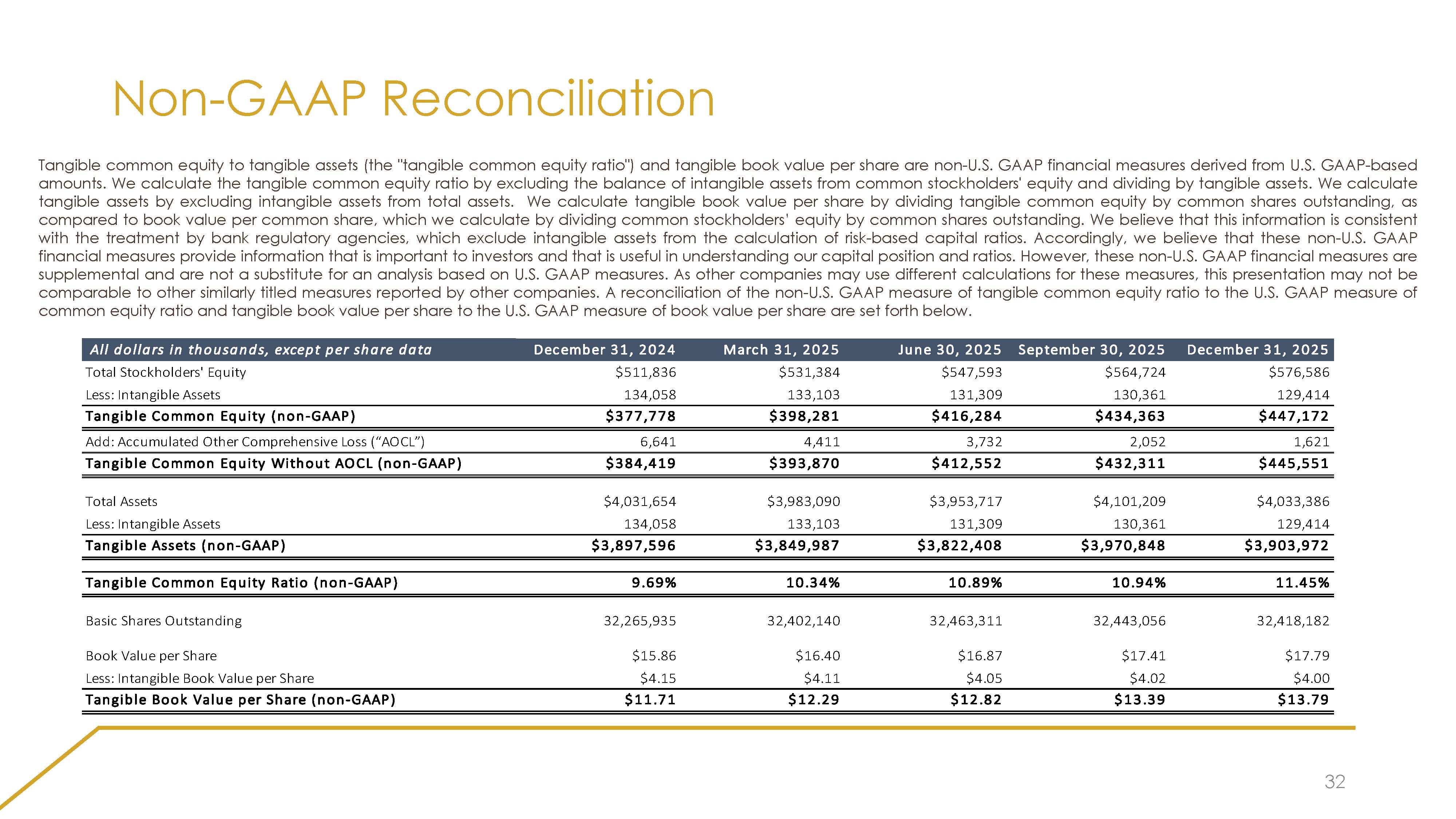 2025年12月31日現在の普通株1株当たり有形簿価(非GAAP基準1)は13.79ドルであり、2025年9月30日時点の13.39ドルから増加した。 2025年第4四半期において、有形簿価は主に、第4四半期の純利益1,640万ドル、株式報酬活動、および売却可能債務証券の税引き後未実現損失の減少の影響を受けましたが、当社の自社株買いプログラム活動および現金配当によって一部相殺されました。 その他包括損失のうち、売却可能債務証券の税引後未実現損失に関連する部分は、2025年9月30日時点の210万ドルから43万1千ドル減少し、2025年12月31日時点で160万ドルとなった。 売却可能債務証券の税引後未実現損失の減少は、利回り曲線の長期端における債券価格の下落や一般的な金利環境など、信用リスク以外の要因に起因する。2025年12月31日時点における有形総資産(非GAAP1)に対する有形普通株主資本(非GAAP1)の割合は、 は前期の10.94%から11.45%に上昇し、2025年12月31日時点の有価証券売却可能債務証券の税引後未実現損失(非GAAP1)が有形普通株式資本(非GAAP1)に占める割合は前期の0.5%から0.4%に低下した。