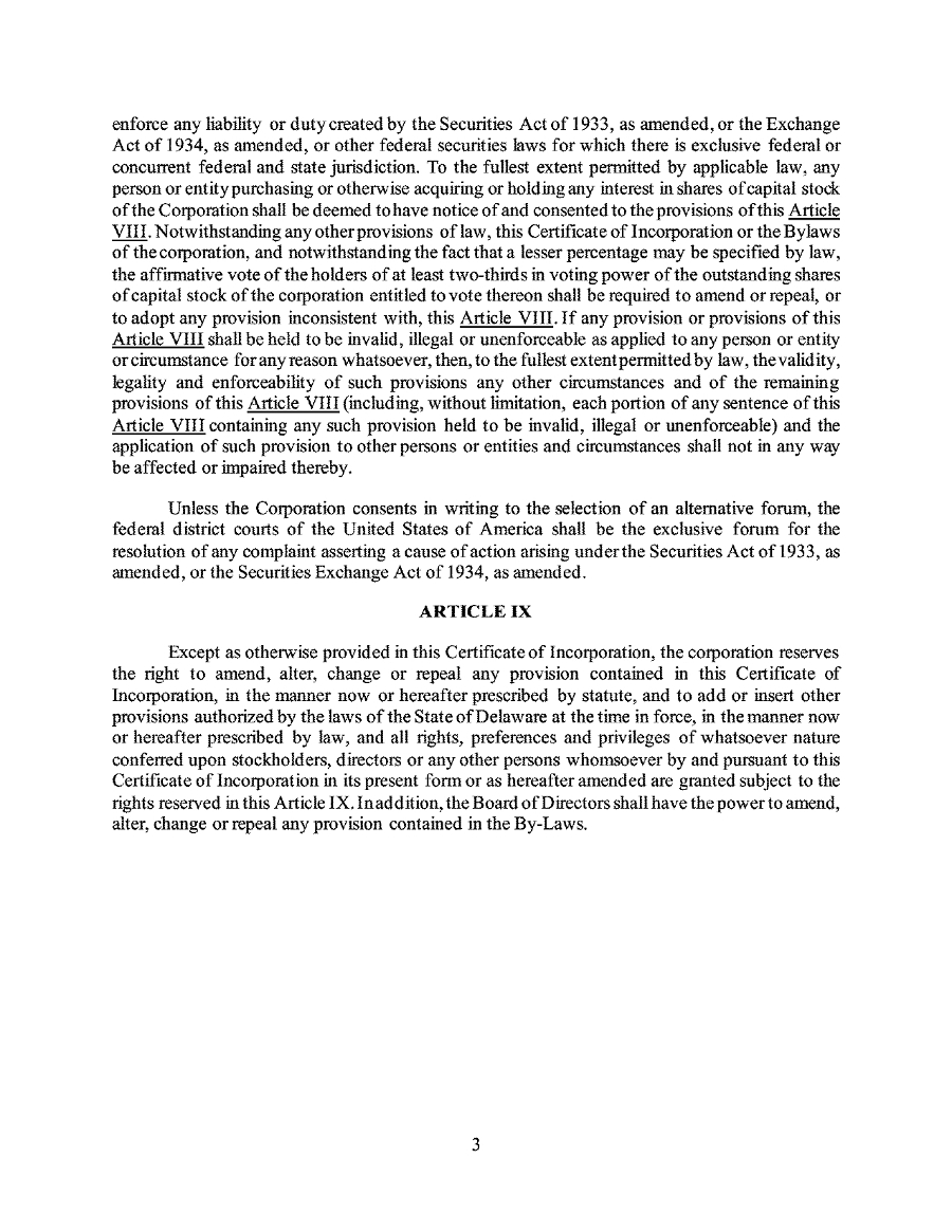 The Board of Directors may make such additional rules and regulations, not inconsistent with the Bylaws or its certificate of incorporation, as it may deem expedient concerning the issue, transfer and registration of certificates for shares of stock of the corporation. Further, the corporation may participate in one or more systems under which certificates for shares of stock are replaced by electronic book-entry pursuant to such rules, terms and conditions as the Board of Directors may approve and subject to applicable law, notwithstanding any provisions to the contrary set forth in this Article.