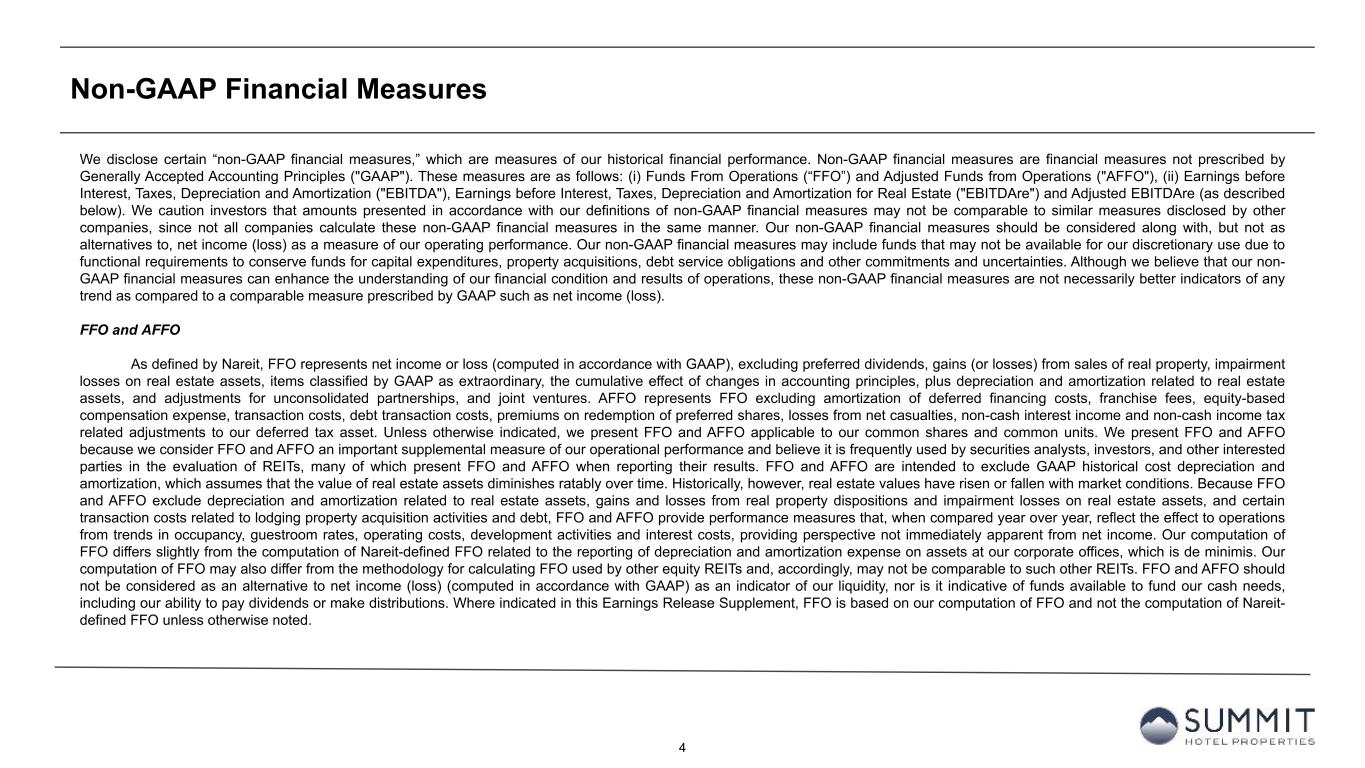 As defined by Nareit, FFO represents net income or loss (computed in accordance with GAAP), excluding preferred dividends, gains (or losses) from sales of real property, impairment losses on real estate assets, items classified by GAAP as extraordinary, the cumulative effect of changes in accounting principles, plus depreciation and amortization related to real estate assets, and adjustments for unconsolidated partnerships, and joint ventures. AFFO represents FFO excluding amortization of deferred financing costs, franchise fees, equity-based compensation expense, debt transaction costs, premiums on redemption of preferred shares, losses from net casualties, non-cash lease expense, non-cash interest income and non-cash income tax related adjustments to our deferred tax assets. Unless otherwise indicated, we present FFO and AFFO applicable to our common shares and common units. We present FFO and AFFO because we consider FFO and AFFO an important supplemental measure of our operational performance and believe it is frequently used by securities analysts, investors, and other interested parties in the evaluation of REITs, many of which present FFO and AFFO when reporting their results. FFO and AFFO are intended to exclude GAAP historical cost depreciation and amortization, which assumes that the value of real estate assets diminishes ratably over time. Historically, however, real estate values have risen or fallen with market conditions. Because FFO and AFFO exclude depreciation and amortization related to real estate assets, gains and losses from real property dispositions and impairment losses on real estate assets, FFO and AFFO provide performance measures that, when compared year over year, reflect the effect to operations from trends in occupancy, guestroom rates, operating costs, development activities and interest costs, providing perspective not immediately apparent from net income. Our computation of FFO differs slightly from the computation of Nareit-defined FFO related to the reporting of corporate depreciation and amortization expense. Our computation of FFO may also differ from the methodology for calculating FFO used by other equity REITs and, accordingly, may not be comparable to such other REITs. FFO and AFFO should not be considered as an alternative to net income (loss) (computed in accordance with GAAP) as an indicator of our liquidity, nor is it indicative of funds available to fund our cash needs, including our ability to pay dividends or make distributions. Where indicated in this release, FFO is based on our computation of FFO and not the computation of Nareit-defined FFO unless otherwise noted.