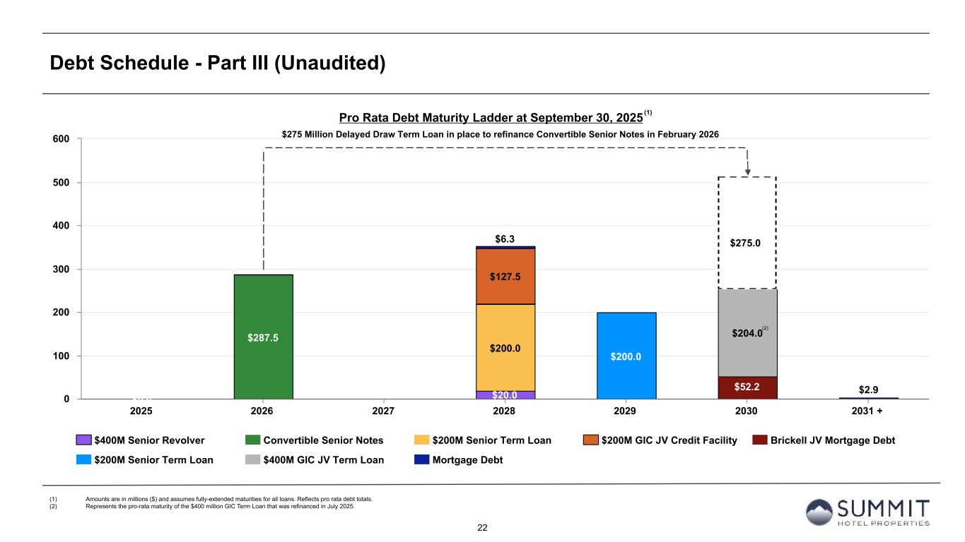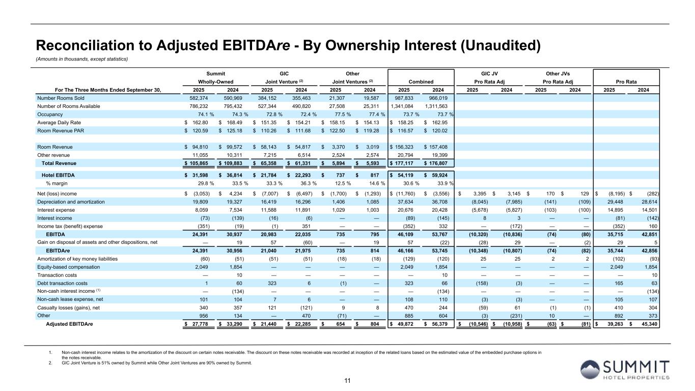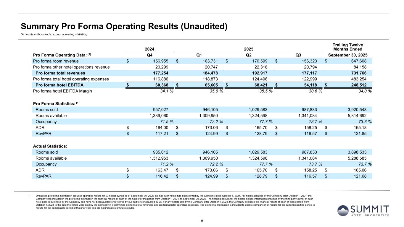 (1) Unaudited pro forma information includes operating results for 97 hotels owned as of September 30, 2025 as if all such hotels had been owned by the Company since October 1, 2024. For Acquired Hotels, the Company has included in the pro forma information the financial results of each of the hotels acquired for the period from October 1, 2024, to September 30, 2025. The financial results for the hotels acquired include information provided by the third-party owner of such hotel prior to purchase by the Company and have not been audited or reviewed by our auditors or adjusted by us. For any hotels sold by the Company after October 1, 2024, the Company excludes the financial results of each of those hotels from October 1, 2024 to the date the hotels were sold by the Company in determining pro forma total revenues and pro forma hotel operating expenses. The pro forma information is included to enable comparison of results for the current reporting period to results for the comparable period of the prior year and are not indicative of future results.