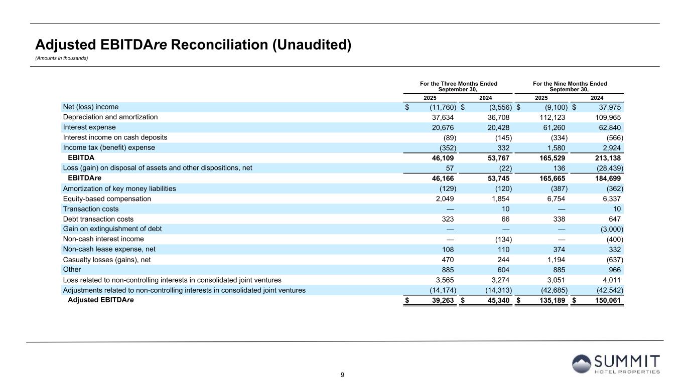 •Same Store Hotel EBITDA(1): Same store hotel EBITDA decreased to $52.0 million from $59.6 million in the same period in 2024. Same store hotel EBITDA margin contracted approximately 356 basis points to 30.3 percent.